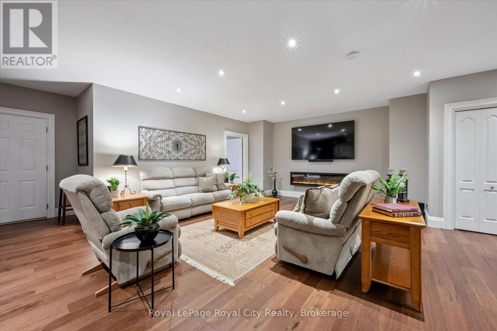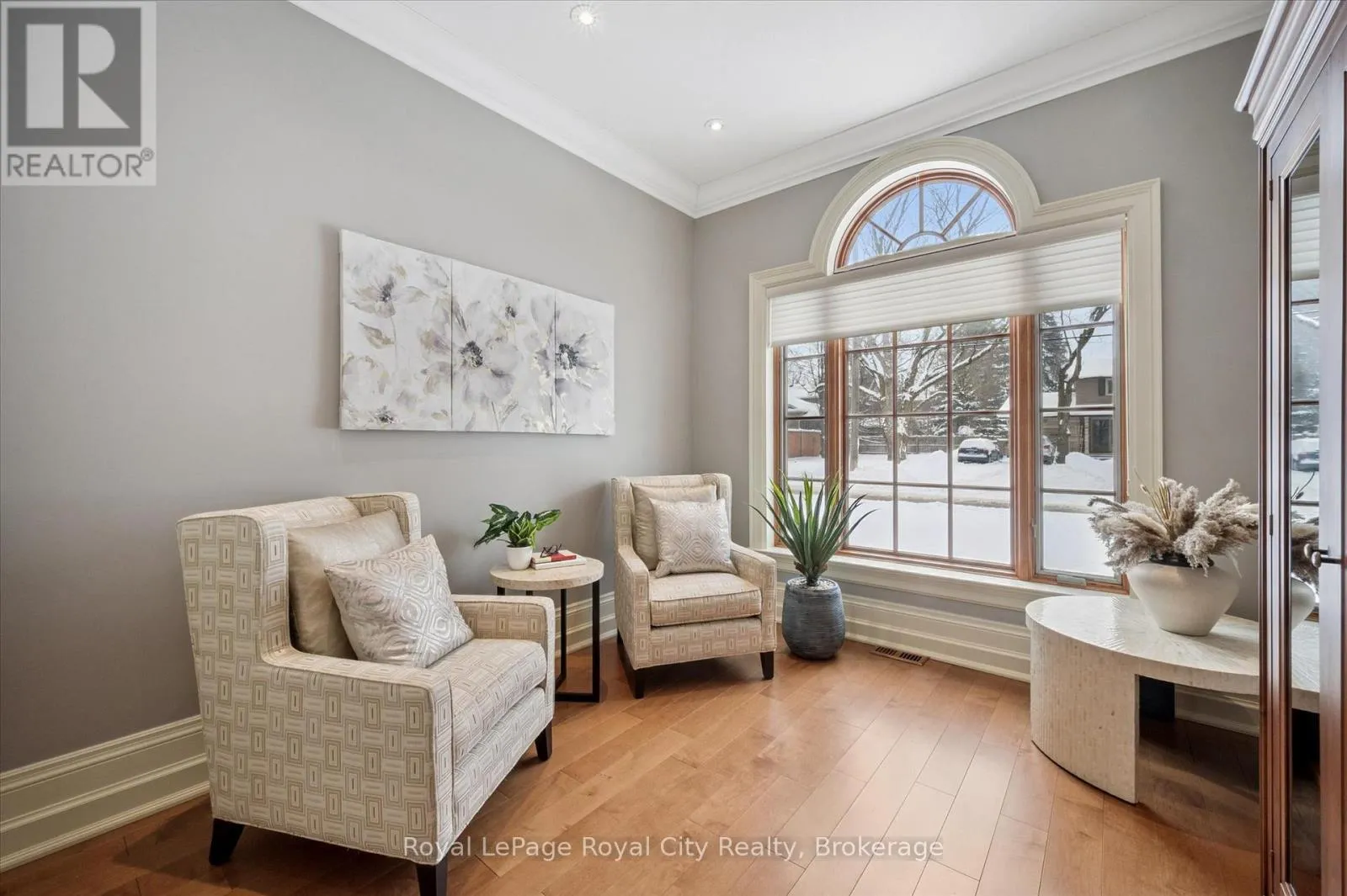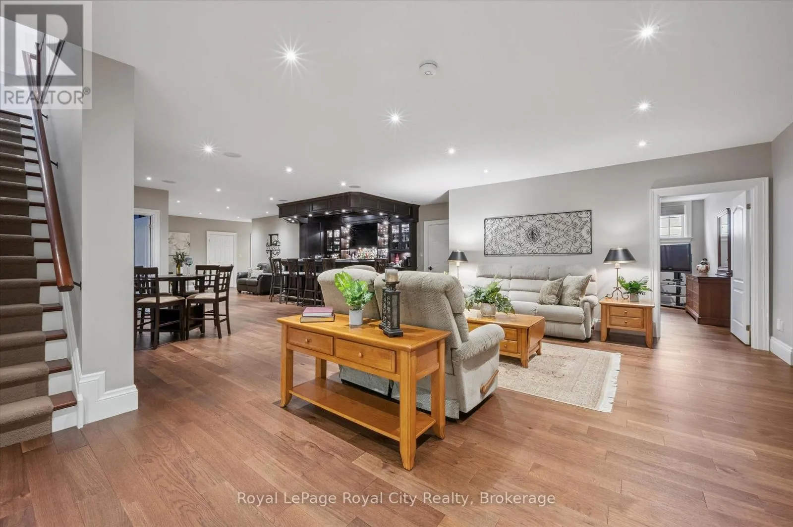 Between Winston Cres. and Palmer St. Rarely does a home offer both striking curb appeal and an exceptional location, and this one delivers on every front. Situated in one of Guelph's most desirable family neighbourhoods, steps to St. George's Park, this custom-built residence stands apart for its craftsmanship, thoughtful design, and timeless finishes. From the moment you arrive, the quality is unmistakable. The exterior is finished in Arriscraft Citadel stone, with limestone sills, arches, lintels, and door surrounds. Inside, 10' ceilings throughout the main floor, oversized crown moulding and baseboards, solid 8' interior doors, and a dramatic barrel-vaulted front entry set the tone. The open-concept kitchen is the heart of the home, featuring a large centre island, integrated office nook, and custom Barzotti cabinetry carried through to the bathrooms. The adjoining family room features built-in custom cabinetry, a gas fireplace, and floor-to-ceiling windows overlooking the rear patio, creating a seamless indoor-outdoor connection. The primary bedroom offers a luxurious retreat with a walk-in closet and a stunning 5-piece ensuite featuring a glass shower and a soaker tub. Two additional bedrooms, a 4-piece bathroom, main-floor laundry, and a convenient powder room complete this level. In-floor heating provides exceptional comfort throughout both the main floor and basement, as well as the concrete flooring in the garage. The lower level, alternatively accessed by a separate staircase from the garage, is extraordinarily spacious due to 9' foundation walls, no bulkheads, and clear spans with no support columns. This level includes an additional bedroom, an office, a full bathroom, an incredible bar area, and a home theatre with surround sound, ideal for entertaining or enjoying your favourite sporting events. Don't miss this rare opportunity to own a meticulously constructed home in one of Guelph's most coveted locations, where exceptional craftsmanship and refined living come together seamlessly. (id:27476)