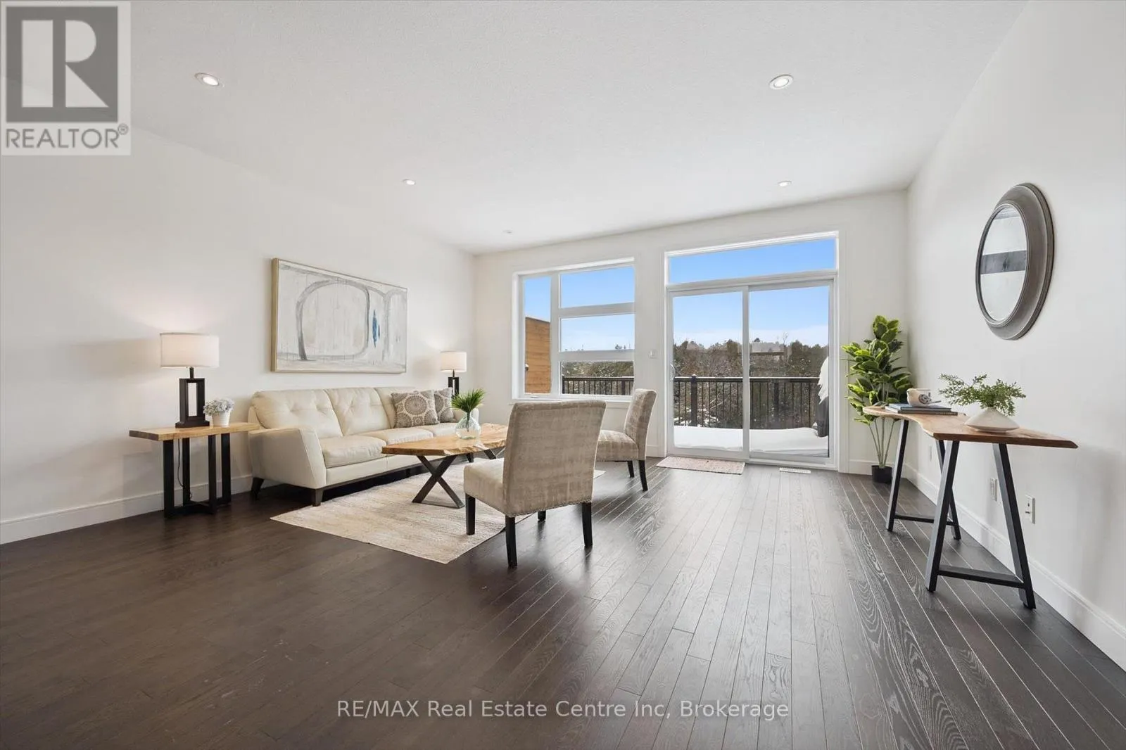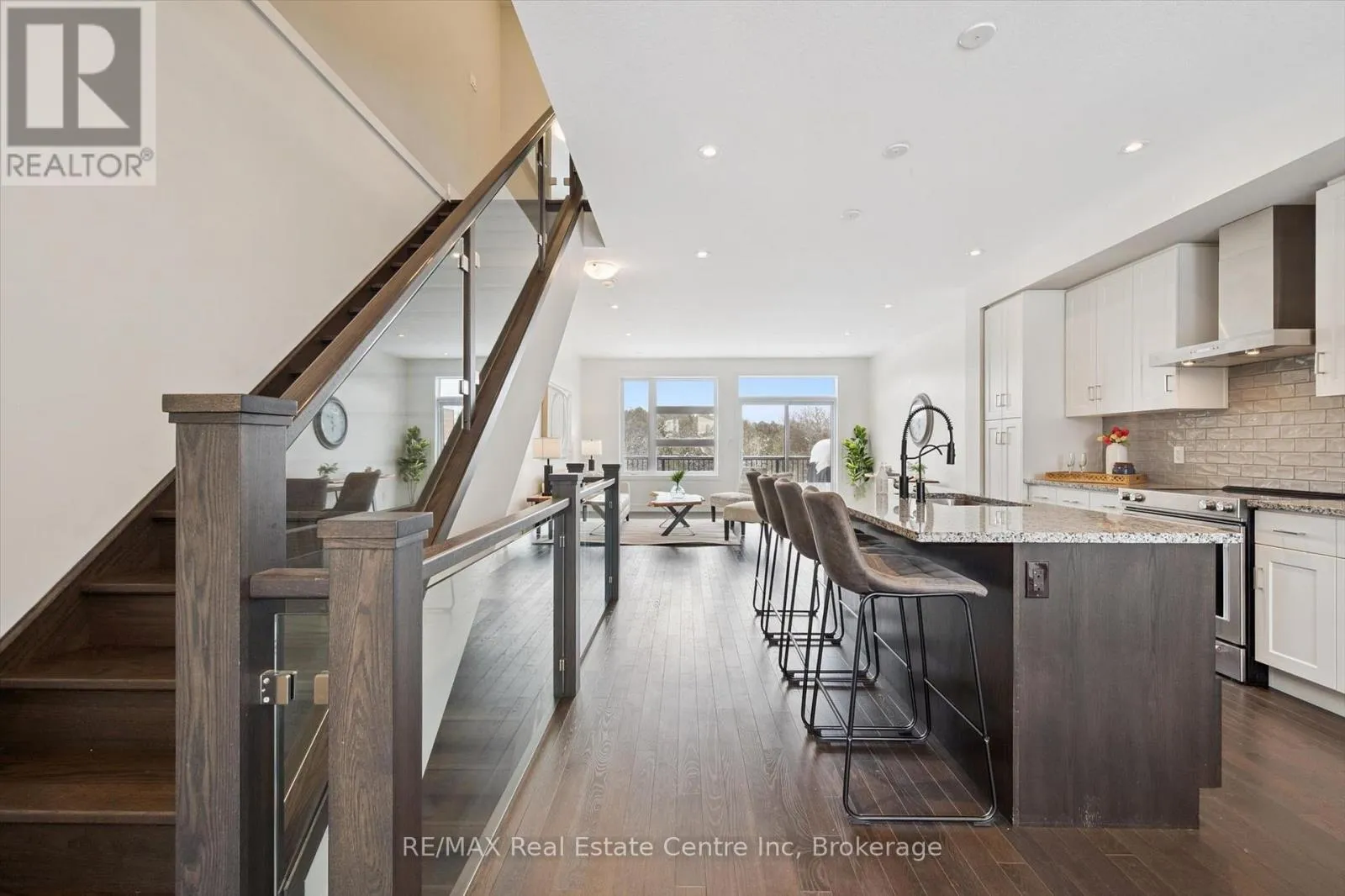 Gordon St Upscale 2286sqft, 3-storey townhome located in award-winning complex in Guelph's highly sought-after south end! Backing onto greenspace this home boasts one of the best positions in the community offering unobstructed views from the front & rear of the unit. With 3 bdrms, 3bathrooms & potential for add'l bdrms this home delivers privacy, functionality & lifestyle. Enter main level to bonus room filled W/natural light from large windows & pot lighting. This space easily adapts to your lifestyle & works well as home office, secondary living room, playroom or teen retreat. Follow the chic wood & glass staircase to heart of the home where open-concept main living area truly impresses. Kitchen is designed for everyday living & entertaining W/white cabinetry that extends to the ceiling, S/S appliances, backsplash & contrasting island topped W/stone counters & bar seating. Kitchen flows seamlessly into dining area where large window creates perfect backdrop for family meals. Livingroom offers rich hardwood, oversized windows & sliding glass door that opens to balcony overlooking treetops. This space is ideal for morning coffee or evening unwinding offering fresh air, privacy & calming connection to nature. 2pc bath completes this level. Upstairs primary bdrm offers W/I closet, large windows & private balcony. Ensuite W/dbl vanity, stone counters & glass-enclosed shower. 2 add'l bdrms & 4pc main bath W/granite counter & shower/tub. Convenient upper-level laundry! W/O bsmt offers endless possibilities to create 4th bdrm, rec room or office. Sliding doors lead to private patio extending the space outdoors. Each level of the home enjoys stunning backdrops of mature trees & protected greenspace. Easy access to 401, UofG bus route, GO Transit stops, trails & highly rated schools. You're surrounded by dining options, groceries, fitness, banks & more. Stone Rd Mall & amenities are a short drive away making this an exceptional location for families, professionals & commuters! (id:27476)
