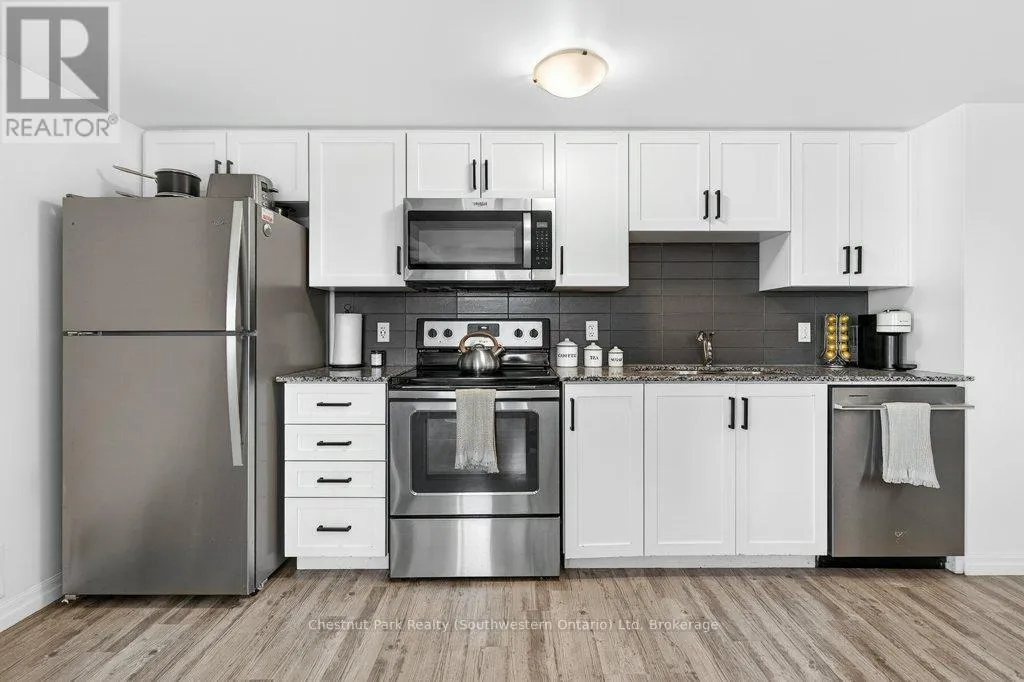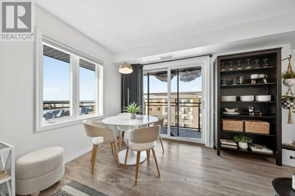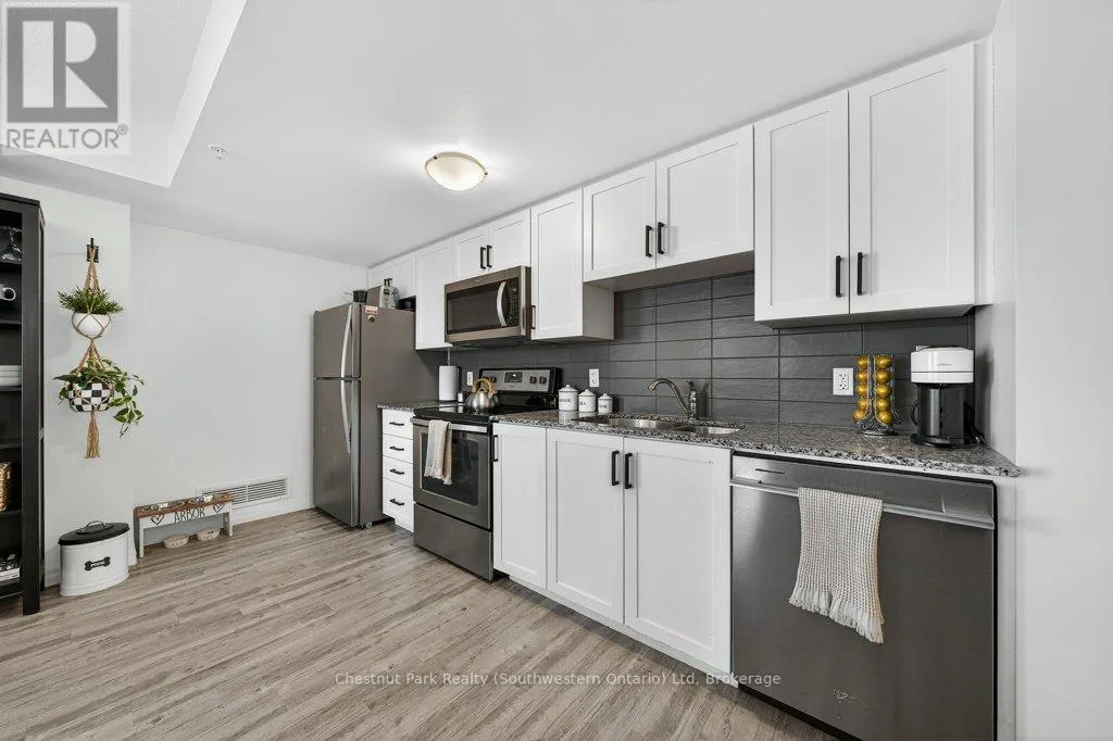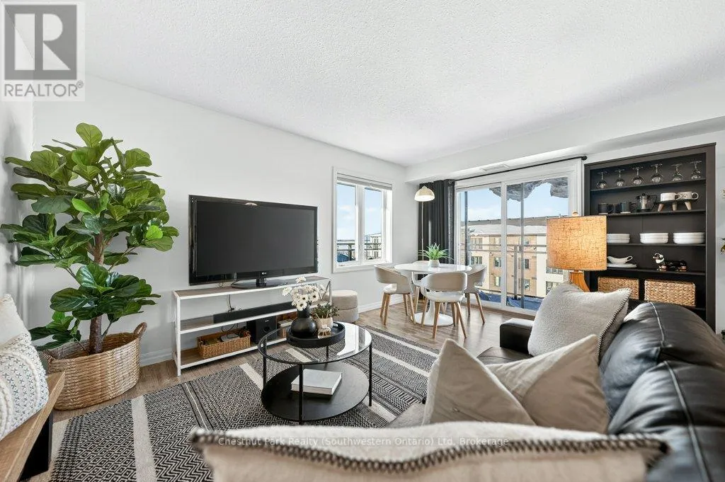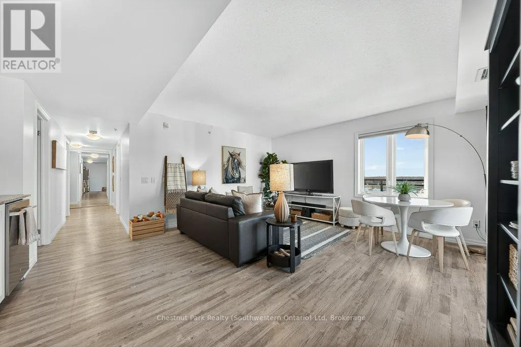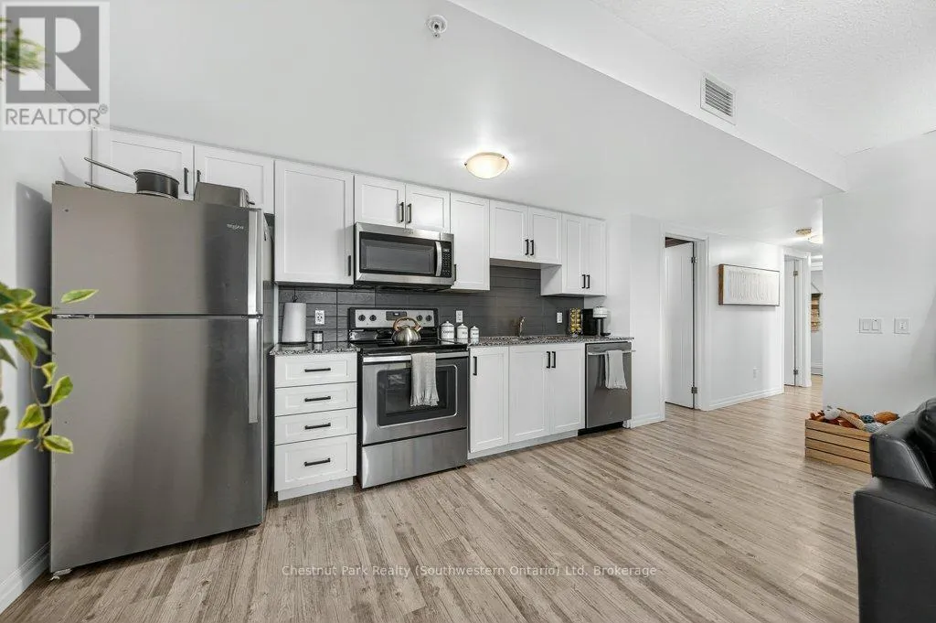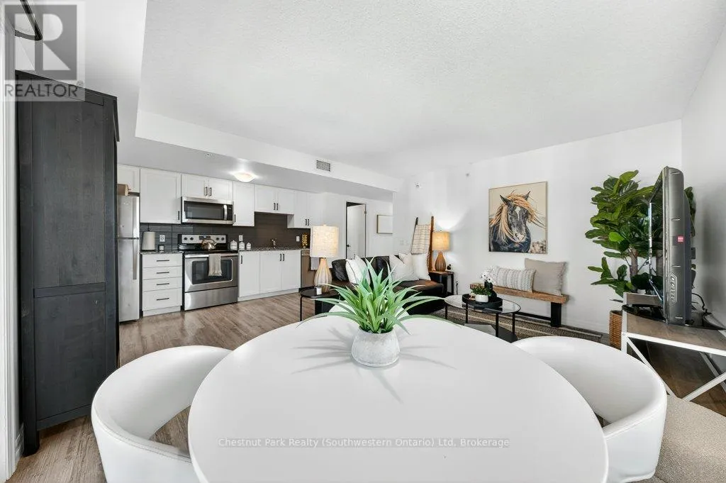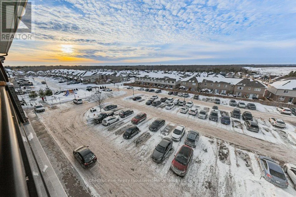 Eastview/Starwood The Penthouse Vibe Without the Penthouse Price. They say you can't have it all: the space of a house, the ease of a condo, and the views of trails and parkland. They haven't been to the top floor of 108 Summit Ridge. Forget the "builder basic" look. This is crisp, clean, and ready for its close-up. Built in 2018 and freshly painted, this 3-bedroom, 2-bath residence is the definition of turnkey. Step onto luxury vinyl flooring that flow seamlessly through a light-drenched, open-concept living, dining, and kitchen. The kitchen? Granite countertops, a sleek tile backsplash, and a brand-new dishwasher that's ready for your first dinner party (or your first night of takeout). Because this is a coveted corner unit, you get double the light and a massive wrap-around balcony located off the living room. It's your private outdoor lounge for morning lattes or hosting friends for the main event: a front-row seat to those legendary, golden-hour Guelph sunsets over the parkland every single night. Living here feels like a permanent upgrade. Host intimate gatherings in the open concept living/dining room or the whole family in the large party room. The (grand)kids are entertained on the play structure and a pet-friendly policy means every member of the family (four-legged ones included) is welcome. Plus, a storage locker for your gear and plenty of visitor parking for your guests. Cancel the gym membership-the Fitness Centre is just a warm-up walk away. So who Is This For? The Power Couple: One bedroom for sleep, one for the home office, and one for the wardrobe/Peleton. The Modern Parent: 3 full bedrooms means everyone gets their own space, with the trails and play structure outside your door. The Jet-Setter: Looking to winter in Mexico? Lock the door, grab your passport, and go. No grass to cut, no snow to shovel-just pure freedom. You get the light of a corner house without the lawn to mow. Top floor. No noisy neighbors above you. Just you, the trails, and the sunset. (id:27476)