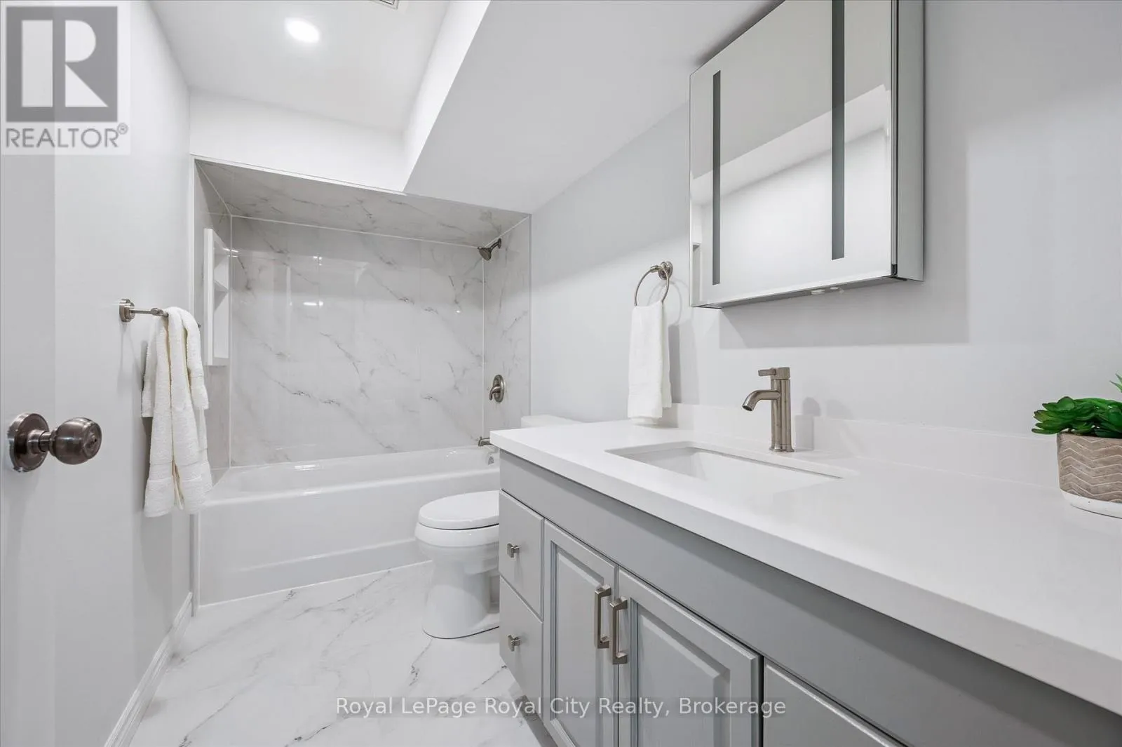 Cross Streets: Carrington Dr and Edinburgh Rd S. ** Directions: Edinburgh Rd S to Carrington Dr. Beautifully updated Terra View former model home set on a desirable corner lot in sought-after Kortright West. This 4+1 bedroom, 3.5 bathroom home offers a thoughtfully designed floor plan that truly works for modern family living. The attractive brick and stone exterior welcomes you into a bright foyer complete with a coat closet, custom built-in storage, convenient powder room, and main floor laundry. Rich hardwood flooring flows into the formal dining room - an inviting space for hosting holidays and special gatherings. The refreshed eat-in kitchen features granite countertops, stainless steel appliances, and updated finishes, while the bright breakfast area walks out to the rear yard, creating a seamless connection between indoor and outdoor living. Just steps away, the cozy lower-level living room with fireplace is the perfect place to unwind. Upstairs, the spacious family room offers incredible flexibility for movie nights, a playroom, or a quiet retreat. The generous primary suite includes a walk-in closet and dedicated ensuite with a newly updated shower. Three additional bedrooms share a beautifully renovated family bathroom complete with new quartz countertops and modern fixtures. The finished basement expands your living space even further with a fifth bedroom, a full bathroom, and a versatile bonus area ideal for a home office, gym, or recreation space. Outside, the fully fenced backyard is a private oasis. Spend summer days by the inground pool, relax in the hot tub, or entertain friends and family on the patio. Recent updates include new basement flooring, a full basement bathroom renovation, a new primary ensuite shower, new quartz countertops, sinks and faucets in the main bath and ensuite, a kitchen and powder room refresh, and fresh paint throughout. Ideally located close to Hartsland Market Square, parks, schools, and public transit, this is the home your family has been waiting for. (id:27476)