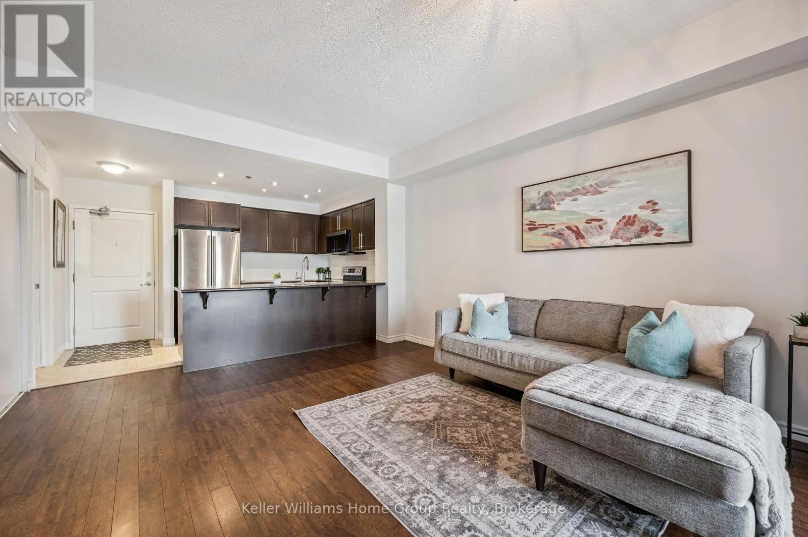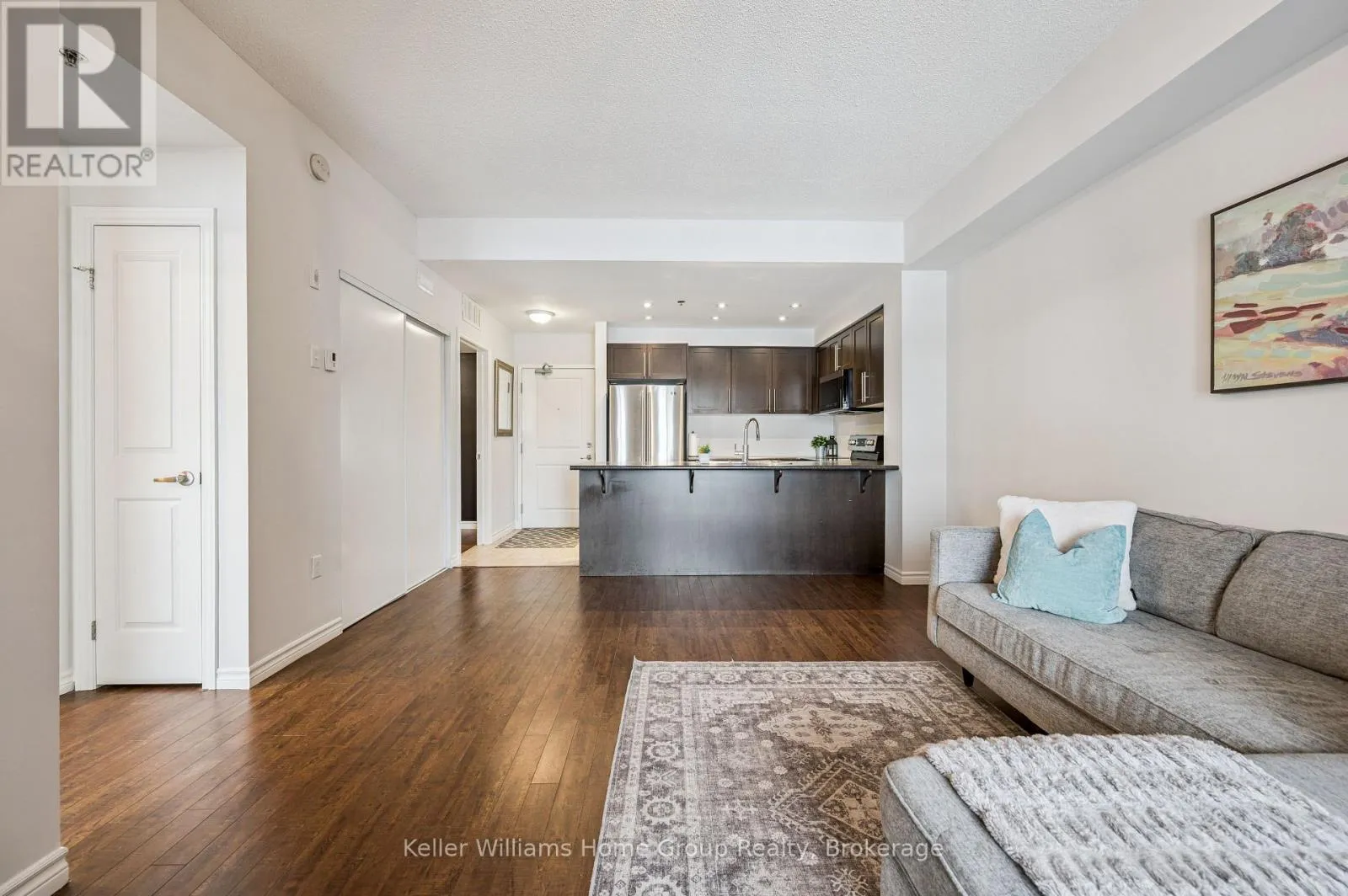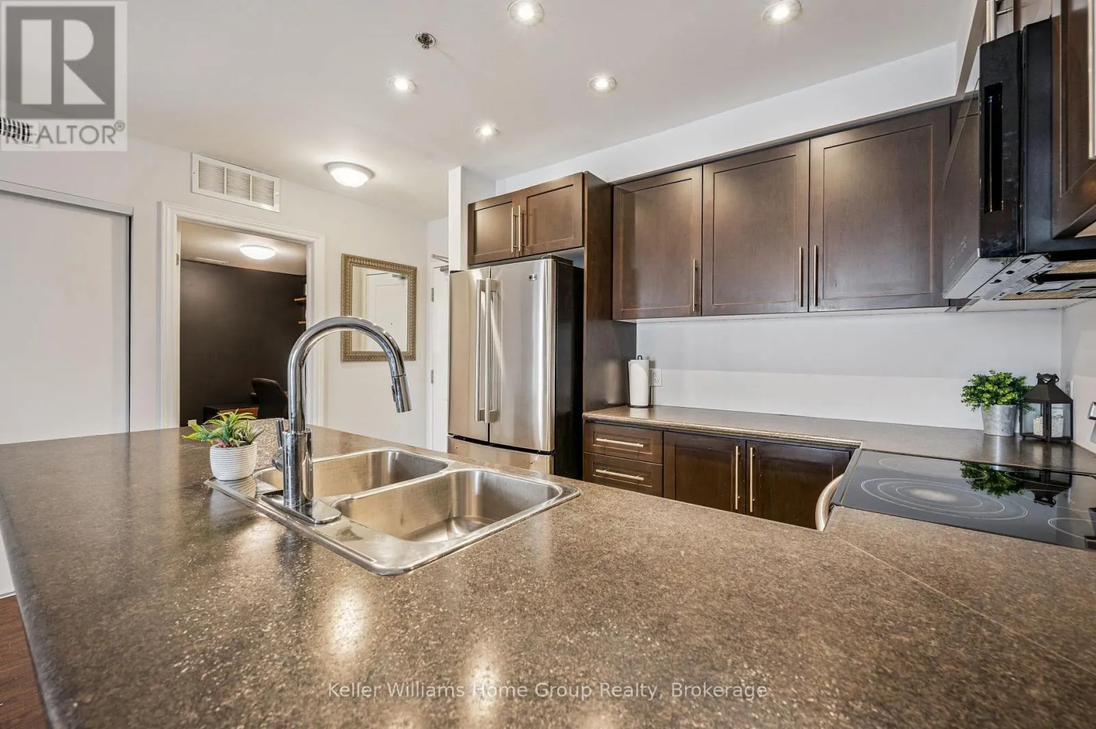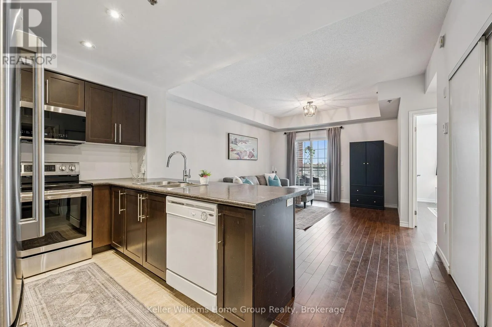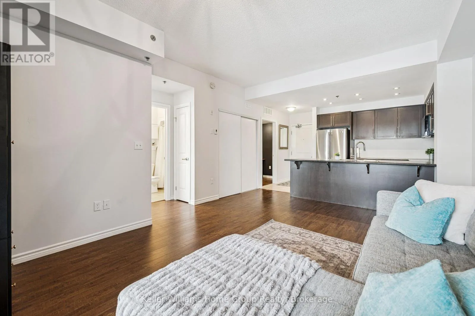 Arkell & Gordon This beautifully maintained 1 bedroom + den condo offers stylish, low-maintenance living in one of Guelph's most desirable south-end communities. Surrounded by parks, walking trails, shopping, restaurants, transit, and easy highway access, this location truly has it all!! Step inside to a beautiful bright, open-concept living space featuring hardwood flooring and soaring 9-foot ceilings that create an airy and inviting feel. The spacious kitchen is perfect for everyday living and entertaining alike, complete with stainless steel appliances, rich cabinetry, ample counter space, and a breakfast bar overlooking the living area. The living room is filled with natural light and provides direct access to your private fourth-floor balcony overlooking Pine Ridge Park, offering beautiful open views and the perfect spot to start or end your day. The primary bedroom features a large window with ample closet space, while the versatile den provides the ideal setup for a home office, reading nook, or guest space. A well-appointed 4-piece bathroom, in-suite laundry, and thoughtful layout complete the interior. This beautiful condo offers comfort, convenience, and a fantastic south-end lifestyle!! (id:27476)