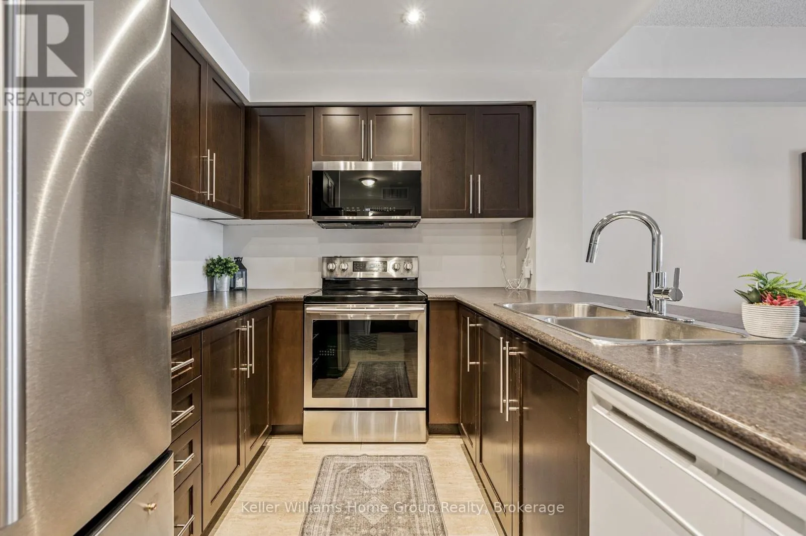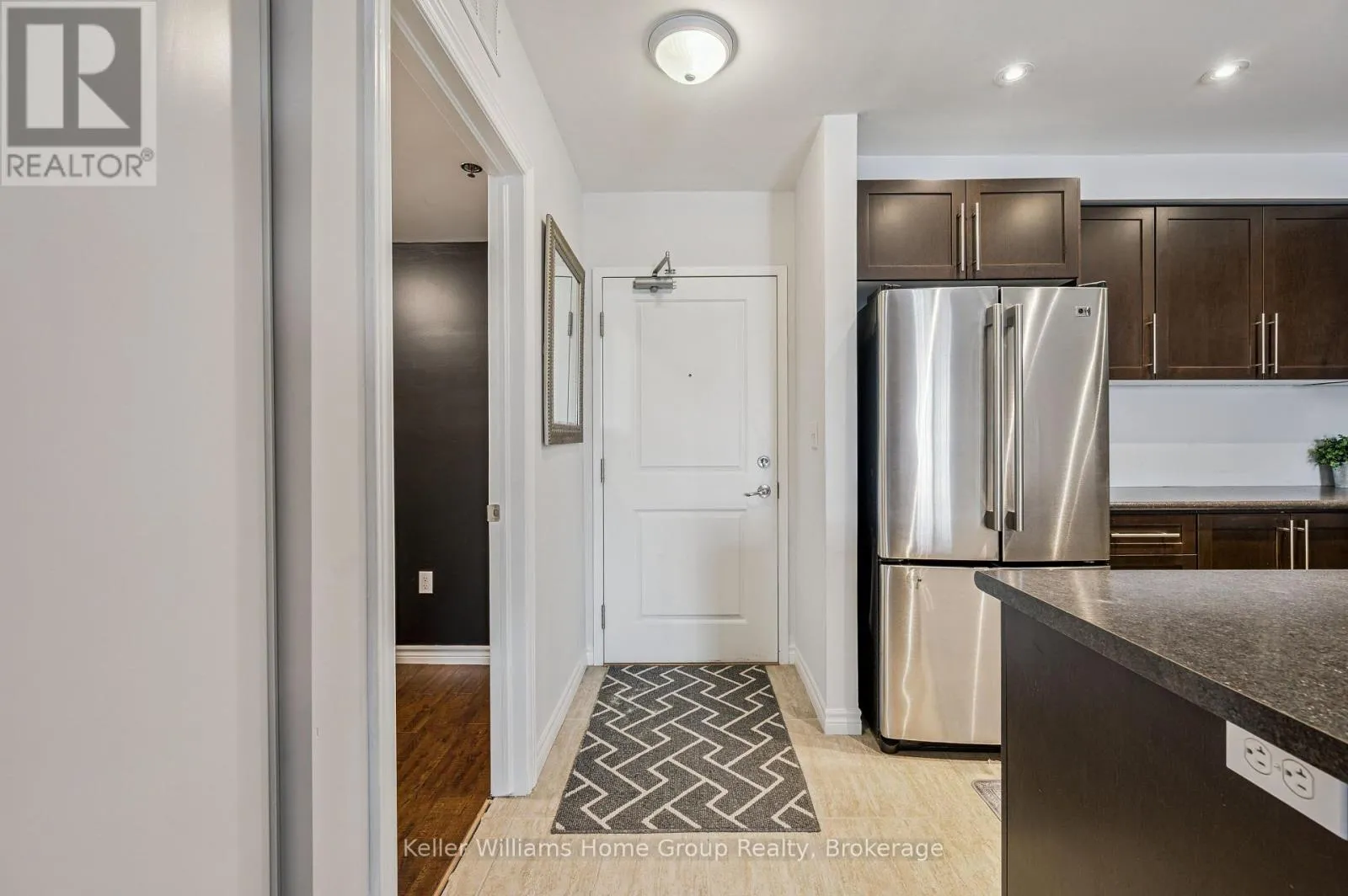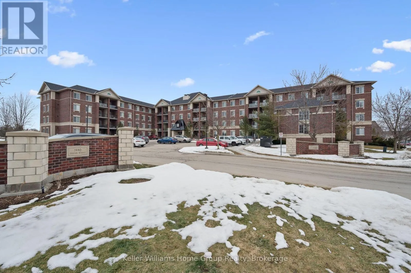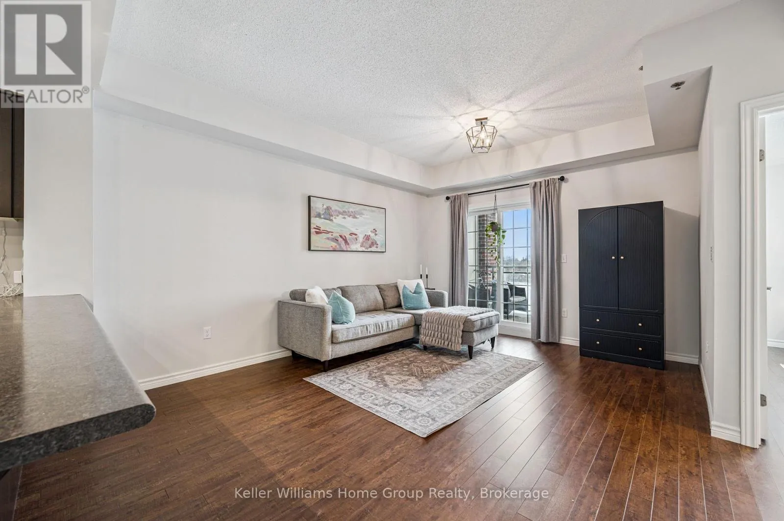 Arkell & Gordon This beautifully maintained 1 bedroom + den condo offers stylish, low-maintenance living in one of Guelph's most desirable south-end communities. Surrounded by parks, walking trails, shopping, restaurants, transit, and easy highway access, this location truly has it all!! Step inside to a beautiful bright, open-concept living space featuring hardwood flooring and soaring 9-foot ceilings that create an airy and inviting feel. The spacious kitchen is perfect for everyday living and entertaining alike, complete with stainless steel appliances, rich cabinetry, ample counter space, and a breakfast bar overlooking the living area. The living room is filled with natural light and provides direct access to your private fourth-floor balcony overlooking Pine Ridge Park, offering beautiful open views and the perfect spot to start or end your day. The primary bedroom features a large window with ample closet space, while the versatile den provides the ideal setup for a home office, reading nook, or guest space. A well-appointed 4-piece bathroom, in-suite laundry, and thoughtful layout complete the interior. This beautiful condo offers comfort, convenience, and a fantastic south-end lifestyle!! (id:27476)
