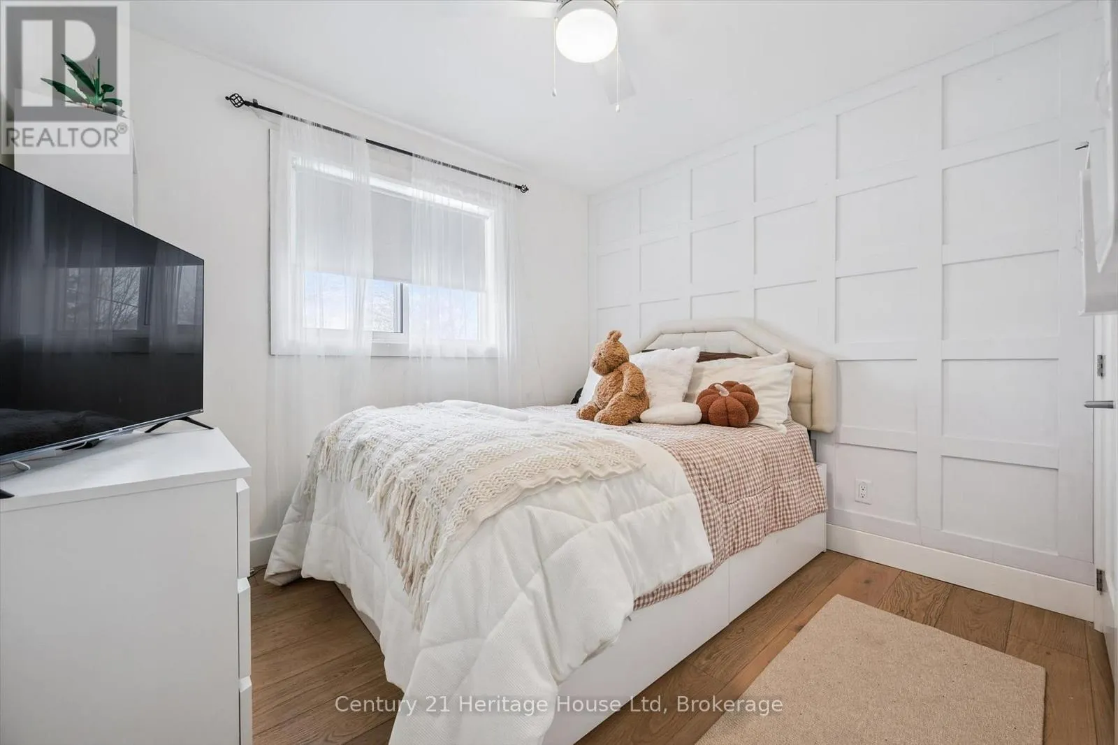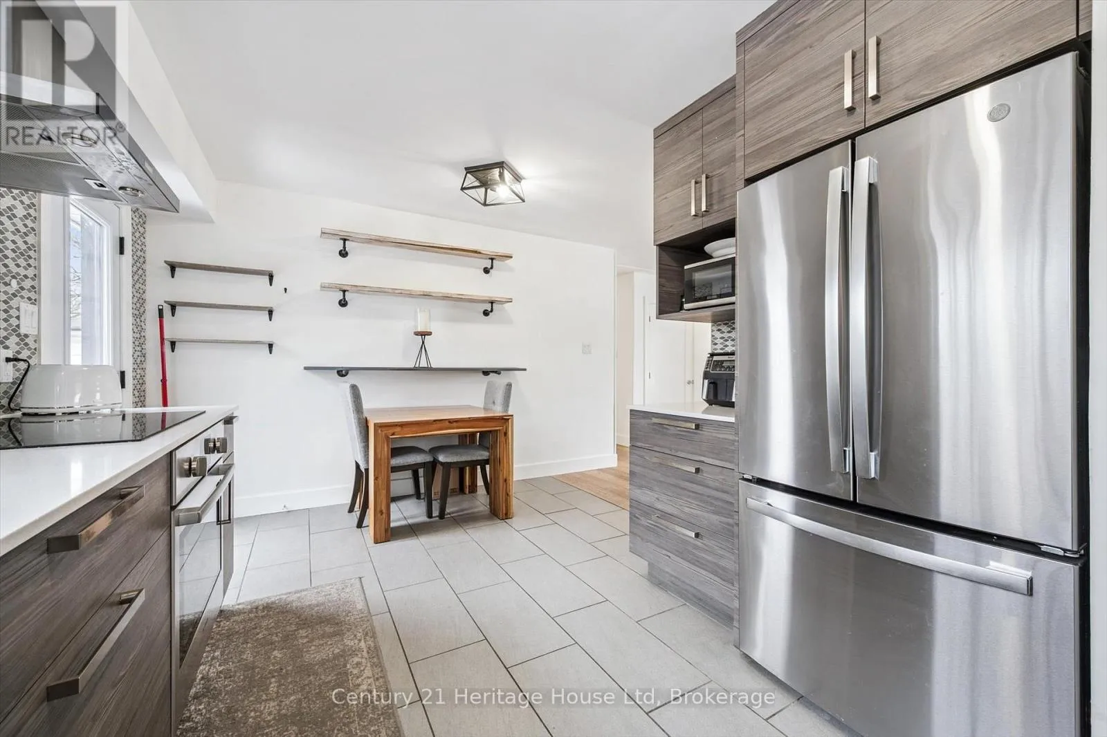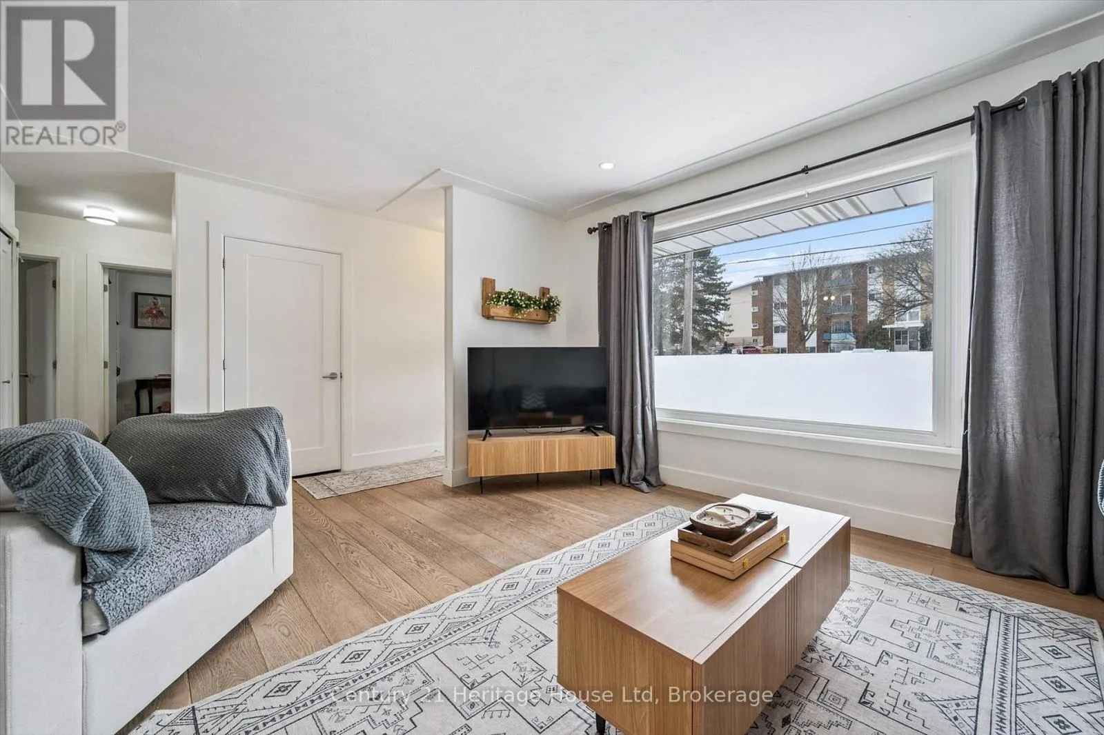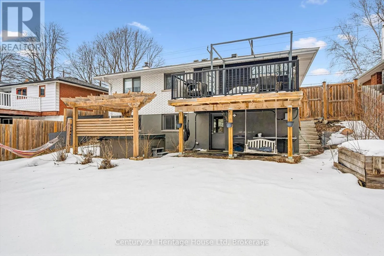 Victoria road north between Speedvale and Woodlawn We are pleased to welcome you to this beautifully renovated walkout bungalow, set on a generous 50 x 130 ft lot with standout curb appeal and parking for 4+ vehicles on the concrete driveway. This home offers the perfect blend of style, function, and outdoor living.The main floor features a modern eat-in kitchen with Corian countertops, Bosch induction cooktop, stainless steel range hood, built-in oven, dishwasher, and French door refrigerator. A raised deck off the kitchen provides the ideal space for morning coffee or evening meals overlooking the massive backyard. The adjoining dining area is bright and welcoming, with large windows at both the front and rear of the home allowing natural light to flow throughout the space.Three good-sized bedrooms and an updated 4-piece bathroom complete the main level.The fully finished walkout basement adds exceptional versatility, offering a spacious family room with feature wall and electric fireplace (2022), a generous fourth bedroom or home office, a second full 4-piece bathroom, and laundry area. Large windows and direct backyard access keep the lower level bright and functional.Step outside to a thoughtfully designed backyard retreat featuring a flagstone patio, patio stone pad (2022), hot tub and pergola (2022), shed (2022), and a substantial yard with plenty of room to entertain, garden, or enjoy year-round activities. Major renovations were completed approximately 7 years ago (2018), including kitchen, flooring, appliances, bathrooms, exterior doors, energy-efficient windows, and deck. The exterior brick was painted in 2022. Furnace replaced in 2025. Located just steps from a direct city bus route with easy access to shopping, amenities, University of Guelph, and Downtown Guelph. Situated within a highly regarded school district offering Public, French Immersion, and Catholic elementary and secondary options. A move-in-ready home offering modern updates, flexible living space, and an exceptional backyard setting. (id:27476)