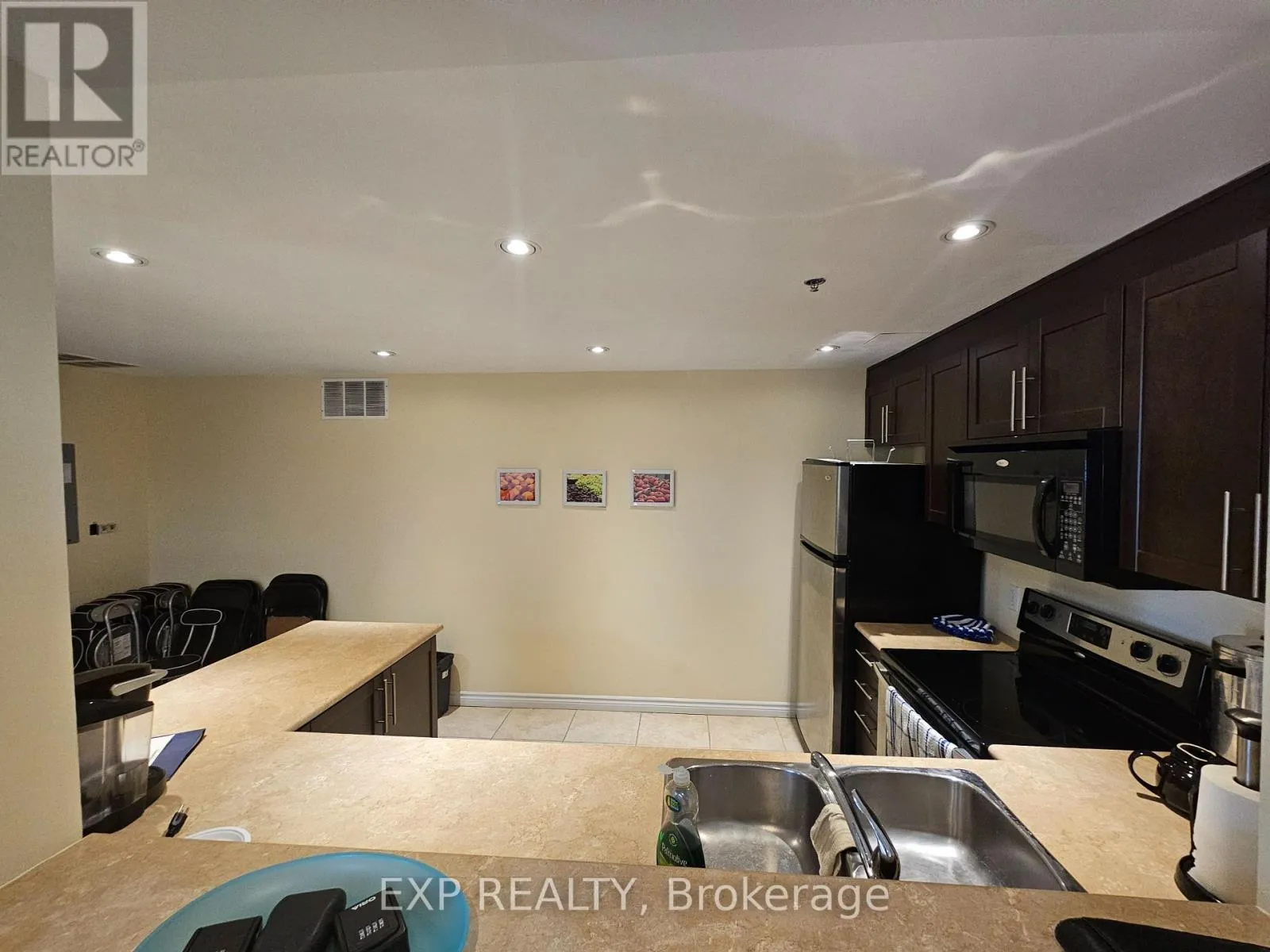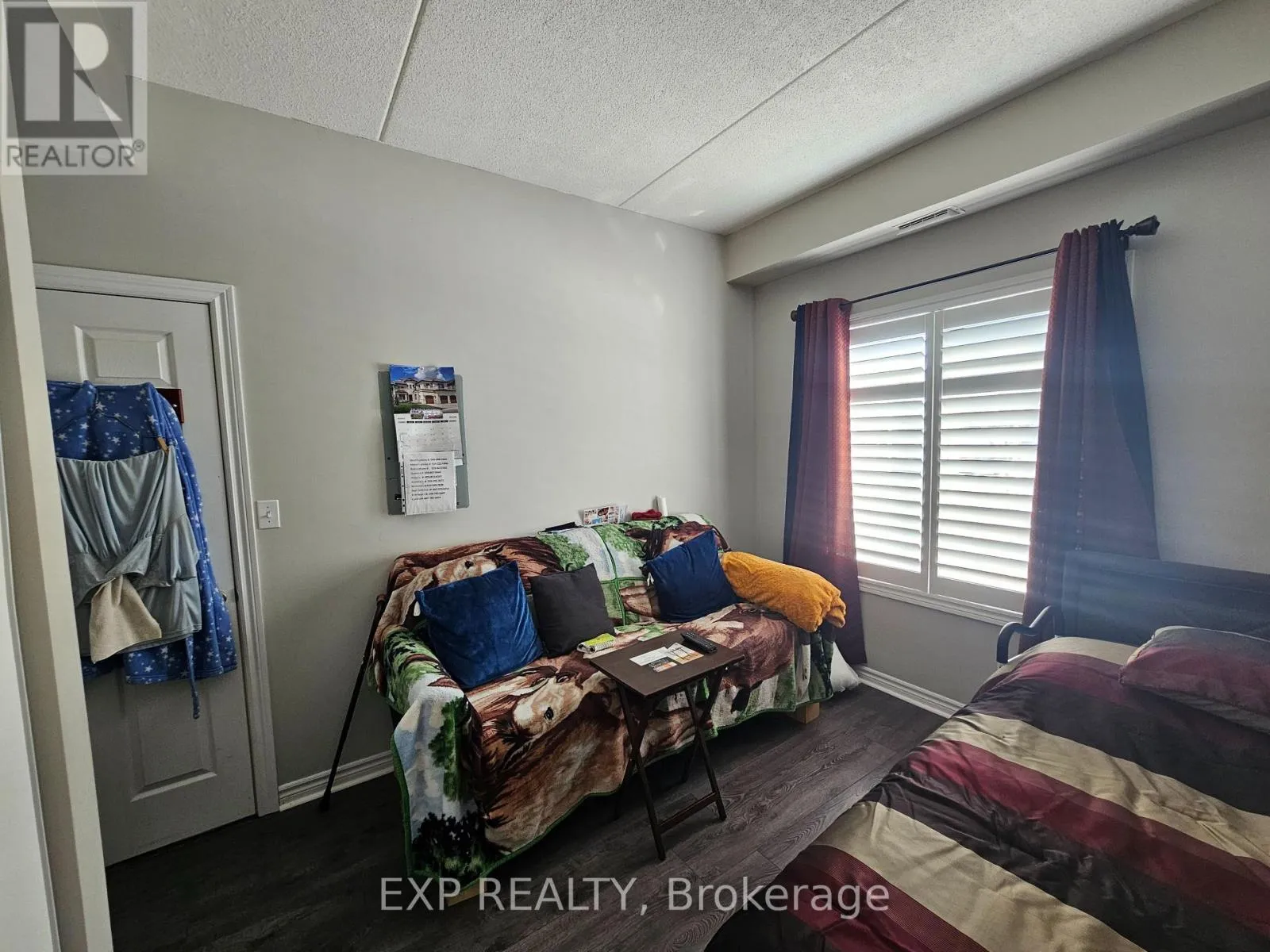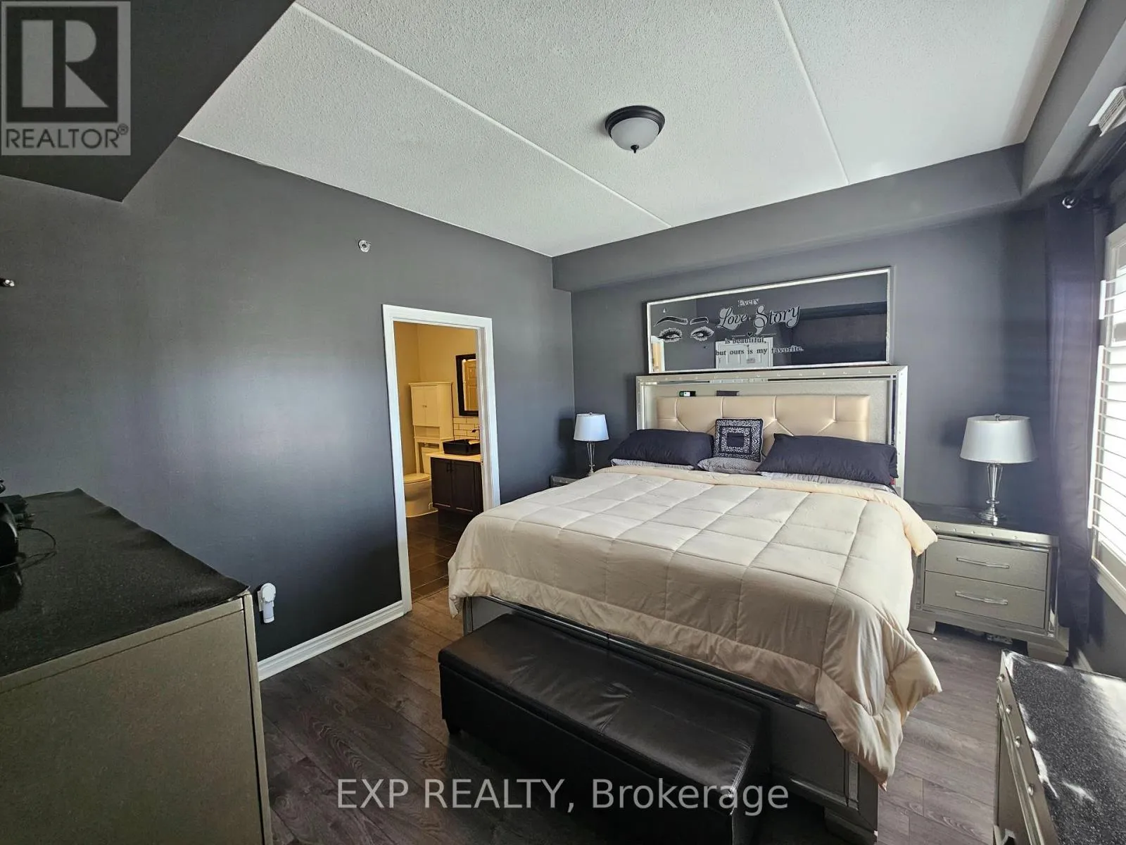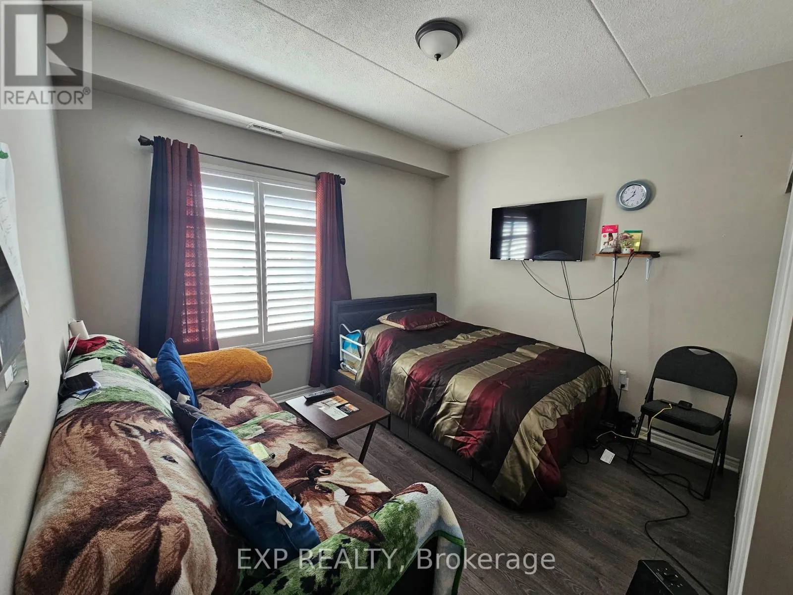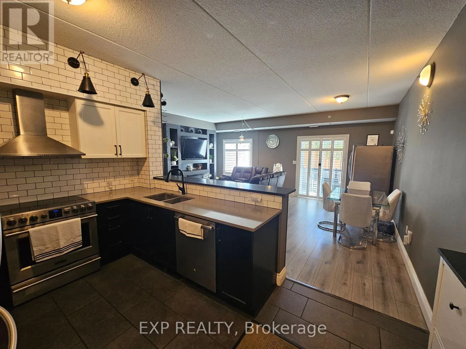 Cross Streets: Watson Parkway North & Grange Road. ** Directions: Grange Road to Watson Pkwy. One of the best units in this pet-friendly building. Ground floor corner condo with 9 ft ceilings and extra windows for abundant natural light. Renovated unit featuring updated, luxurious flooring (This is a zero-carpet unit for those who don't like dust), quartz kitchen counters, upgraded cabinets, stainless steel appliances, stainless steel exhaust hood, and bulkhead kitchen lighting. Freshly painted in many areas with BRAND NEW California shutters (Approx. $6,000) throughout. Spacious living/dining area with custom entertainment feature wall, built-in fireplace and TV mount. Primary ensuite includes recently updated $2,000 shower tower system. Both bathrooms upgraded with new sinks, faucets and backsplashes. New heating system and central A/C. Open balcony, underground parking and storage locker. Amenities include a Party Room. 1 underground parking spot, and ample parking above ground for a second vehicle. Other pluses are not needing the elevator to bring in groceries, sitting out on your ground floor balcony, like living in a bungalow without the maintenance. For the nature lovers and pet walkers, there are multiple trails within the local area! (id:27476)