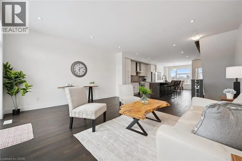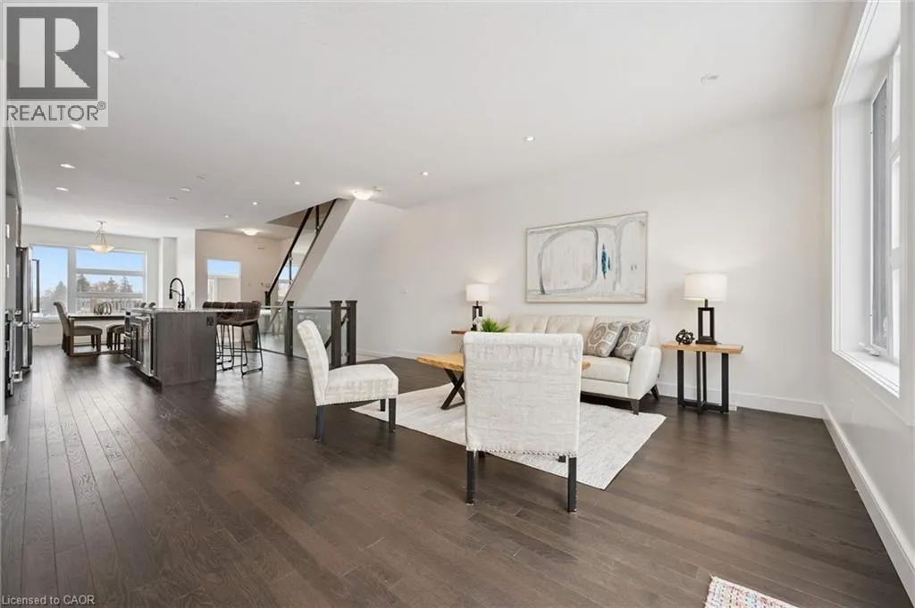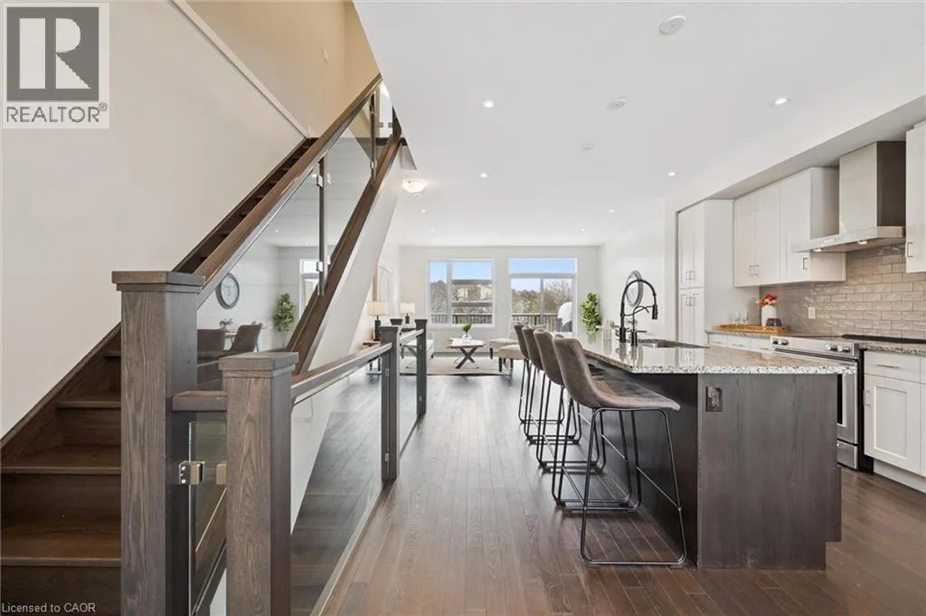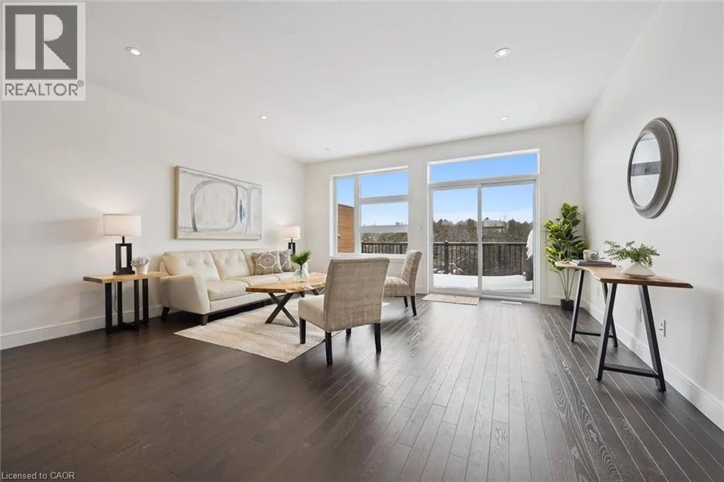 Gordon St Upscale 2286sqft, 3-storey townhome located in award-winning complex in Guelphâs highly sought-after south end! Backing onto greenspace this home boasts one of the best positions in the community offering unobstructed views from the front & rear of the unit. With 3 bdrms, 3 bathrooms & potential for add'l bdrms this home delivers privacy, functionality & lifestyle. Enter main level to bonus room filled W/natural light from large windows & pot lighting. This space easily adapts to your lifestyle & works well as home office, secondary living room, playroom or teen retreat. Follow the chic wood & glass staircase to heart of the home where open-concept main living area truly impresses. Kitchen is designed for everyday living & entertaining W/white cabinetry that extends to the ceiling, S/S appliances, backsplash & contrasting island topped W/stone counters & bar seating. Kitchen flows seamlessly into dining area where large window creates perfect backdrop for family meals. Living room offers rich hardwood, oversized windows & sliding glass door that opens to balcony overlooking treetops. This space is ideal for morning coffee or evening unwinding offering fresh air, privacy & calming connection to nature. 2pc bath completes this level. Upstairs primary bdrm offers W/I closet, large windows & private balcony. Ensuite W/dbl vanity, stone counters & glass-enclosed shower. 2 add'l bdrms & 4pc main bath W/granite counter & shower/tub. Convenient upper-level laundry! W/O bsmt offers endless possibilities to create 4th bdrm, rec room or office. Sliding doors lead to private patio extending the space outdoors. Each level of the home enjoys stunning backdrops of mature trees & protected greenspace. Easy access to 401, UofG bus route, GO Transit stops, trails & highly rated schools. You're surrounded by dining options, groceries, fitness, banks & more. Stone Rd Mall & amenities are a short drive away making this an exceptional location for families, professionals & commuters! (id:27476)