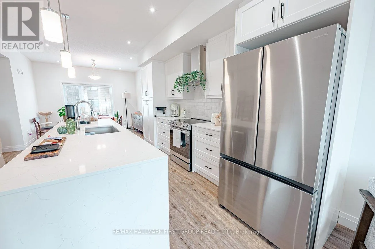 Cross Streets: Clairfields/Gosling Gardens. ** Directions: See Map. Welcome to this 1 year new 3-bedroom, 2.5-bathroom condo townhouse located in the vibrant South End of Guelph. Offering approximately 1,540 sq ft of thoughtfully designed living space, this home features a bright open-concept layout filled with natural light. The modern kitchen is equipped with quartz countertops, stainless steel appliances, and a large island perfect for cooking and entertaining. The spacious living and dining areas create a comfortable space for both relaxing and hosting guests. Step out onto the private 100 sq ft balcony, ideal for enjoying your morning coffee or evening unwind. Upstairs, you'll find three well-sized bedrooms, including a primary suite with its own ensuite bathroom. With 2.5 bathrooms in total, the home offers both comfort and convenience for families or professionals. One parking space is included for added ease. The property is ideally located close to parks, schools, shopping, and everyday amenities. Commuters will appreciate the quick access to Highway 6 and Highway 401, making travel throughout the region simple and convenient. (id:27476)