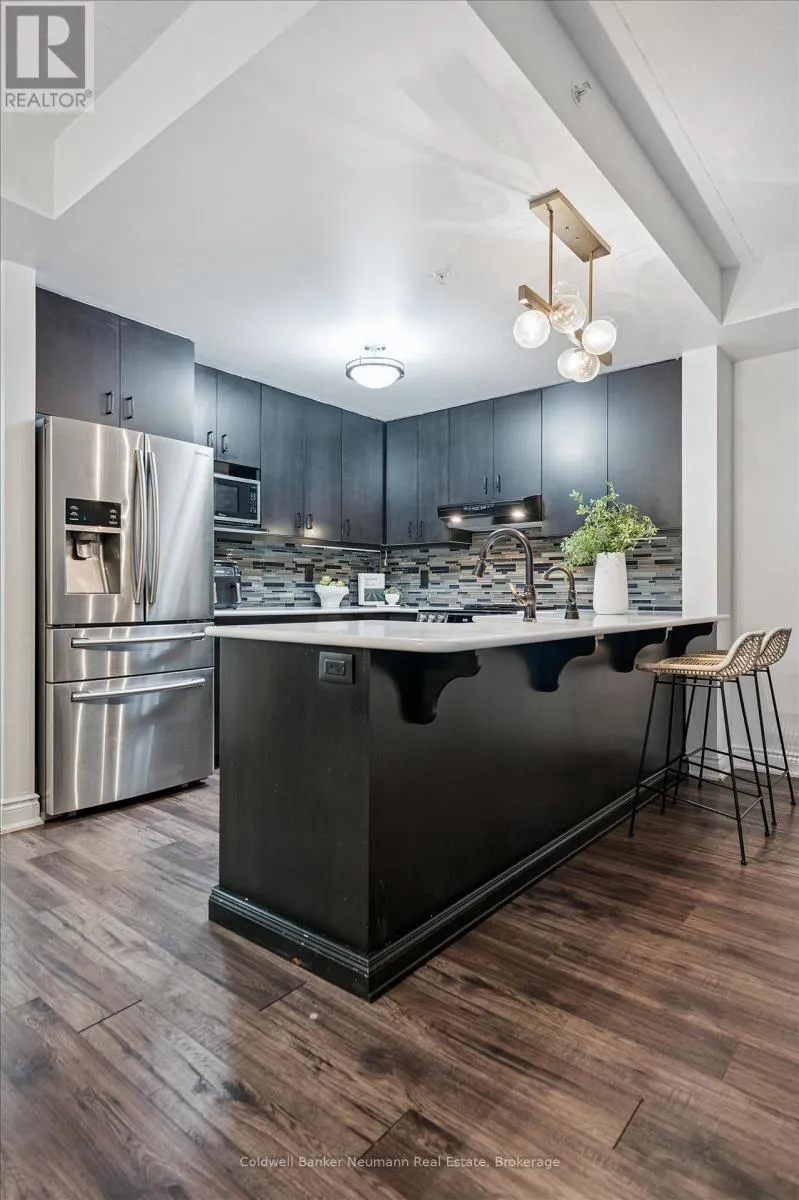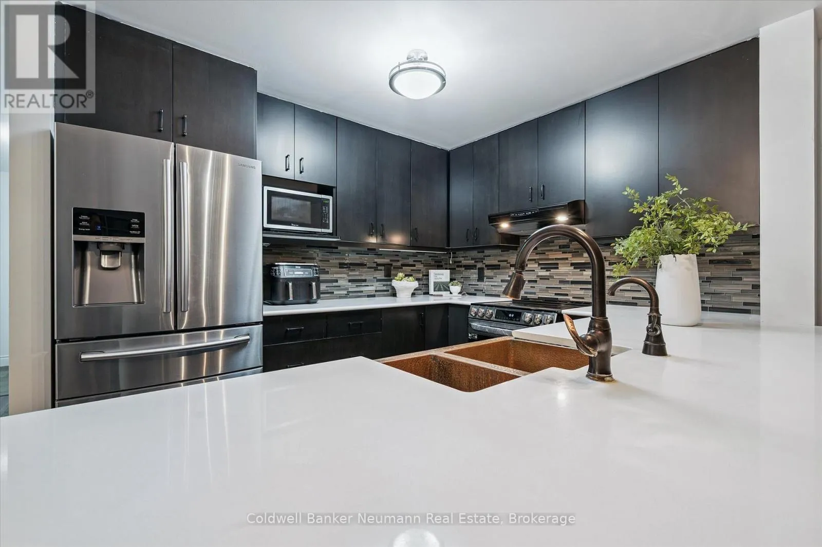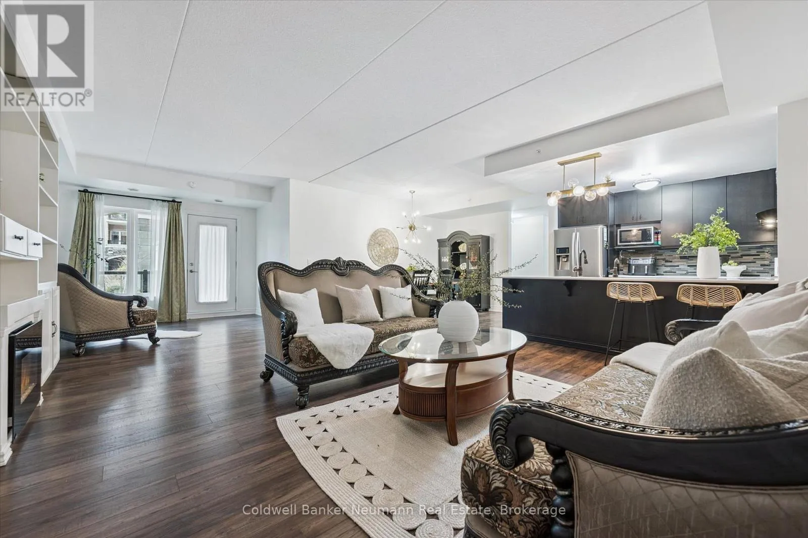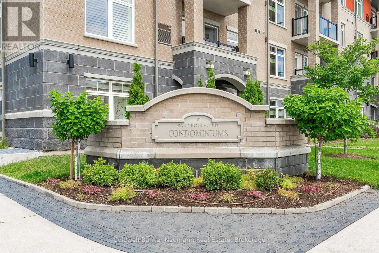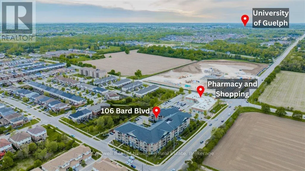 Cross Streets: Victoria Road South. ** Directions: Victoria Road South to Bard BLVD. Welcome to this spacious condo located in Guelph's highly desirable Pineridge/Westminster Woods neighbourhood. Offering over 1,600 sq ft of thoughtfully designed living space, this unit features a versatile and functional layout with 3 bedrooms and 2 full bathrooms, along with the rare benefit of 3 parking spaces (1 underground and 2 surface) and a private balcony, providing both comfort and practicality for everyday living. The open-concept main living area is bright and inviting, with expansive windows that fill the space with natural light and an electric fireplace that anchors the room. The layout offers excellent separation while maintaining flow between the living, dining, and kitchen areas, making it well-suited for both daily living and entertaining. The kitchen is finished with quartz countertops, stainless steel appliances, a custom copper sink, and generous cabinetry, offering a clean and functional workspace with thoughtful detail. The primary bedroom is generously sized and features a walk-in closet and a private ensuite complete with a double copper vanity. Two additional bedrooms provide flexibility for family, guests, or a dedicated home office, while the ensuite laundry adds to the overall convenience. Constructed in 2015, the building is well maintained and offers a range of amenities including a fully equipped exercise room, party room, rooftop terrace, and ample visitor parking. Situated in Guelph's south end, this location is known for its strong sense of community and access to everyday essentials. You're within close proximity to shopping, restaurants, schools, parks, and the University of Guelph, with public transit directly nearby and convenient access to Highway 401 and the GO Train for commuters. Perfect for first-time home buyers, commuters, and downsizers seeking a low-maintenance lifestyle in a well-connected and established neighbourhood. (id:27476)