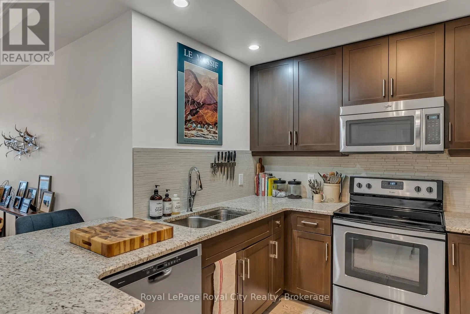 Cross Streets: Wellington Street East & Surrey. ** Directions: 150 Wellington Street East. As you enter, you will immediately be impressed by the Large sliding doors which lead out to a private balcony overlooking downtown Guelph and the Church of Our Lady! This is an Immaculate One Bedroom Condo with Den! Welcome to the luxurious and highly desired River Mill Condominium. Conveniently located between the Speed River and Downtown Guelph, you could have all entertainment, restaurants, Go Train and other amenities just steps from your door. Suite 603 has a highly functional and attractive layout with one bedroom plus a multi purpose den, use it as an office, guest room, dining room, or open the doors and expand your living room space. The kitchen with stainless steel appliances and granite countertops is spacious with a breakfast bar and plenty of cupboard space. Engineered hardwood flooring runs throughout the den and living room, which has a fireplace with stone surround and perfect place to mount your entertainment system. Included is one underground parking space, a storage locker, and in suite laundry. But that's not all! This building is full of amenities including the third floor gym, library, theatre room, and private guest suite accommodations. The seventh floor Sky Lounge offers a first-class bar & lounge space with a pool table; and extends outside to a 6,000 sq. ft. outdoor terrace with private seating areas, gazebo, fireplace and extraordinary views. And, if it suits you, you can purchase this beautiful condo completely furnished! You don't want to miss this opportunity, call today to book your private viewing! (id:27476)