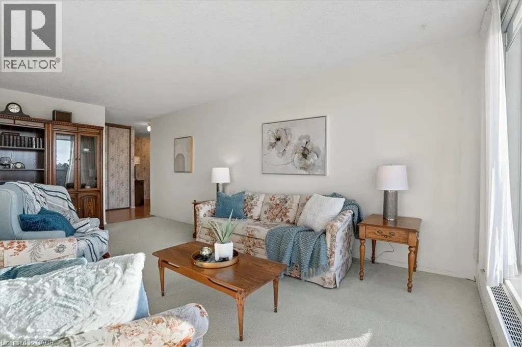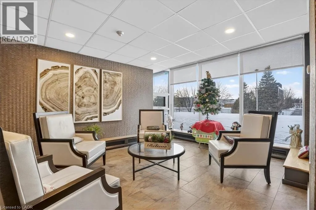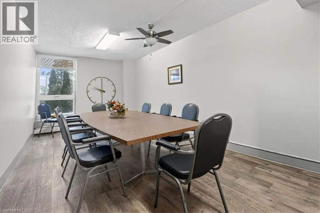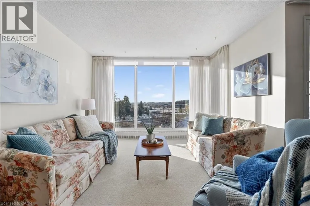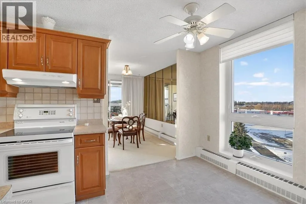 Super bright, 1380 sq ft CORNER unit in sought after complex of Riverside Park area in Guelph. HEAT, HYDRO, WATER included in condo fees! Excellent layout with floor to ceiling windows, sunroom/balcony with great sunset views. Large open concept design featuring formal Living, Dining rooms and spacious eat-in Kitchen offering ample cabinets and counter space. 3 good sized Bedrooms, one is used as a Den/Office with built-in wall unit, 3pc main bath and the Primary with 2pc ensuite. Tons of storage, in-suite laundry and one assigned parking space in covered garage. Very clean and airy home. Well maintained building with many amenities including: tennis courts, outdoor pool, sauna, games room, gym, guest suite, community rooms, library, workshop and more. Located in walking distance to Riverside Park, shopping, restaurants, trails, public transit and easy access to major routes. (id:27476)