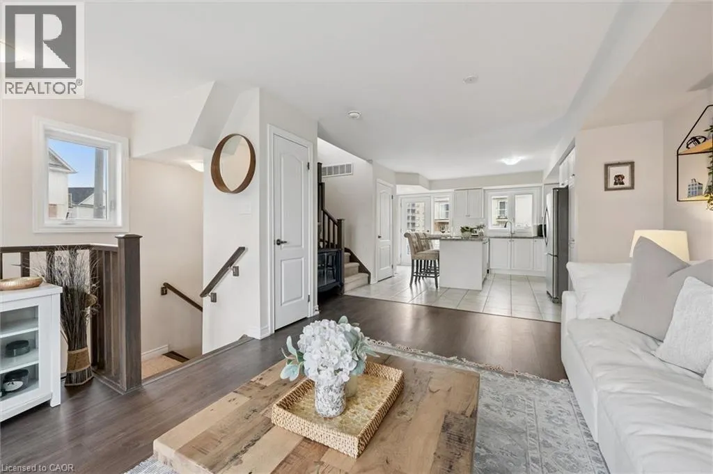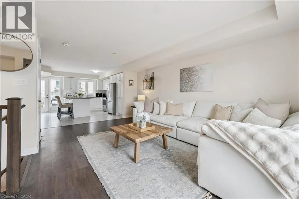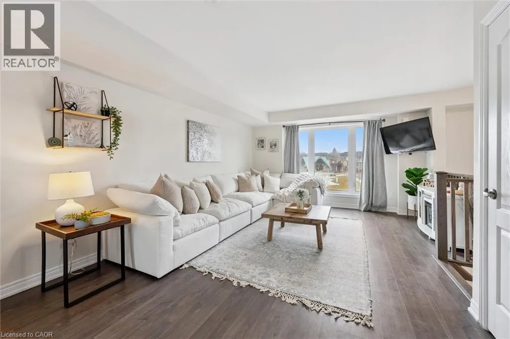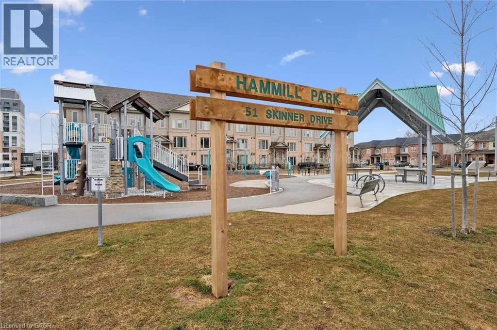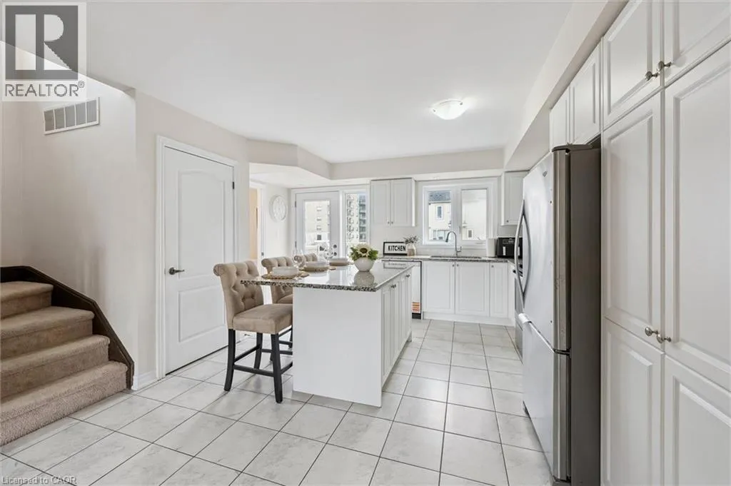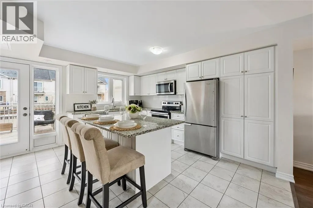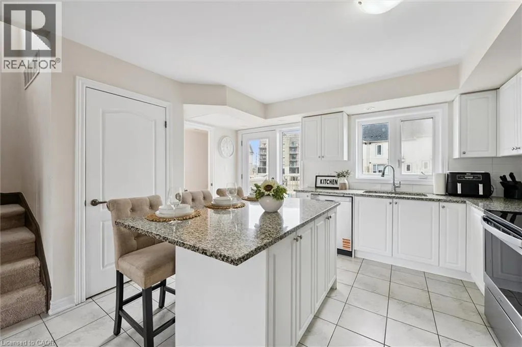 Three-bedroom, three-bathroom homes with a garage don't come up for often in these townhouse blocks. This end-unit was built in 2019, features a spacious living room with luxury vinyl flooring and a large window to allow plenty of natural light. Open to the kitchen, which features lots of beautiful white cabinetry, an island with granite counters, stainless steel appliances, a subway tile backsplash and doors leading to a private terrace that can easily fit a large table and chairs. There is also a powder room on this level. Upstairs has three bedrooms and two bathrooms - the primary bedroom has a walk in closet, ensuite bathroom with quartz counters and a walk-in shower. There is also a sliding door to a private balcony from this bedroom. A very convenient laundry room completes this level. Downstairs provides interior access to a single car garage, plus you have a second parking spot in your driveway. There is a park directly across the street, so there are no neighbours obstructing your front view!. The east end of Guelph has fantastic schools, a public library, Eastview Park with a splash pad, disc golf, and soccer fields, amazing walking trails and great access to the GTA from Guelph Line!. Of note: On-demand water heater, dishwasher (2026), water softener (2025), and low condo fees of $197.14. (id:27476)