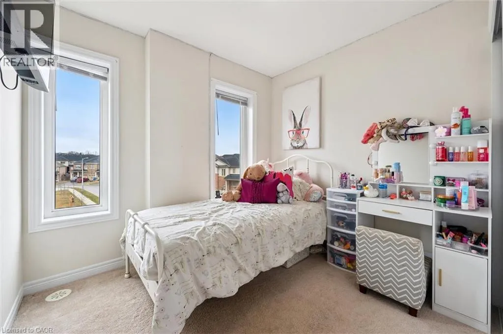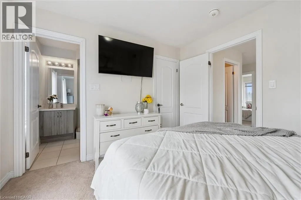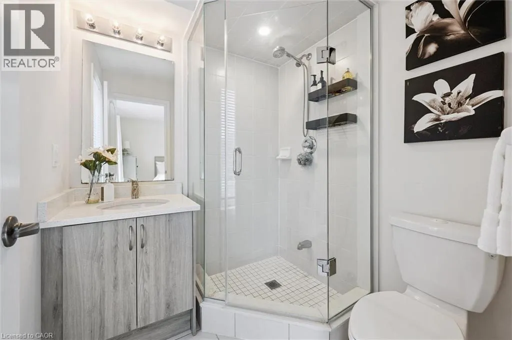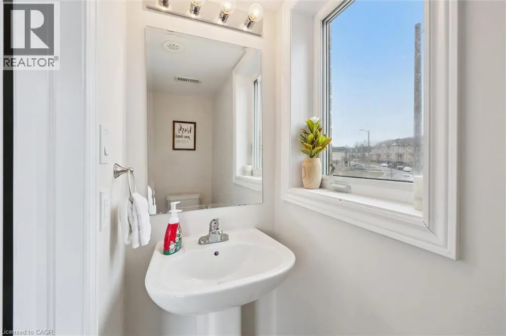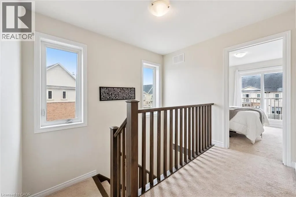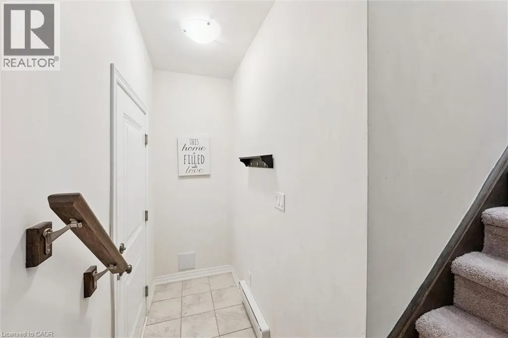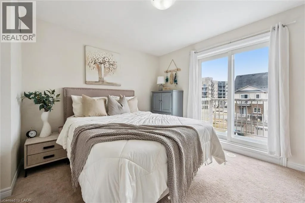 Three-bedroom, three-bathroom homes with a garage don't come up for often in these townhouse blocks. This end-unit was built in 2019, features a spacious living room with luxury vinyl flooring and a large window to allow plenty of natural light. Open to the kitchen, which features lots of beautiful white cabinetry, an island with granite counters, stainless steel appliances, a subway tile backsplash and doors leading to a private terrace that can easily fit a large table and chairs. There is also a powder room on this level. Upstairs has three bedrooms and two bathrooms - the primary bedroom has a walk in closet, ensuite bathroom with quartz counters and a walk-in shower. There is also a sliding door to a private balcony from this bedroom. A very convenient laundry room completes this level. Downstairs provides interior access to a single car garage, plus you have a second parking spot in your driveway. There is a park directly across the street, so there are no neighbours obstructing your front view!. The east end of Guelph has fantastic schools, a public library, Eastview Park with a splash pad, disc golf, and soccer fields, amazing walking trails and great access to the GTA from Guelph Line!. Of note: On-demand water heater, dishwasher (2026), water softener (2025), and low condo fees of $197.14. (id:27476)