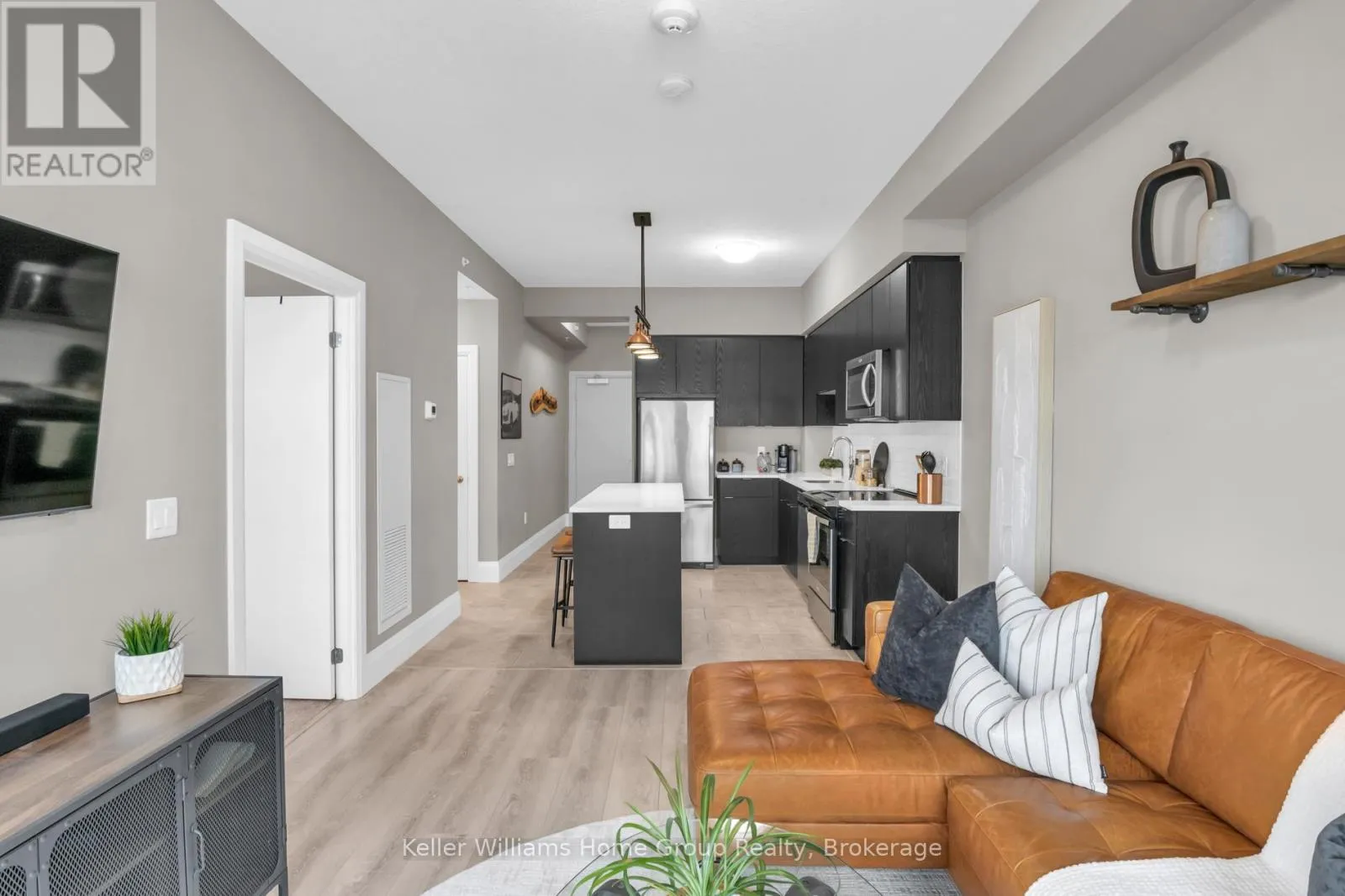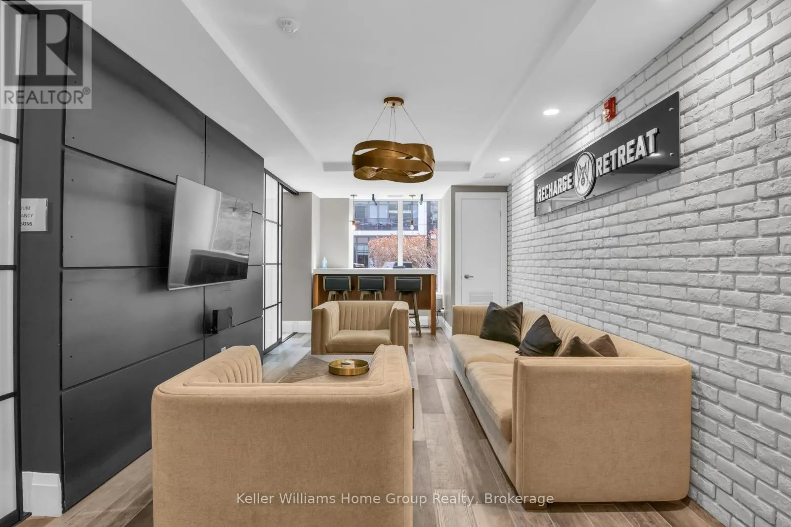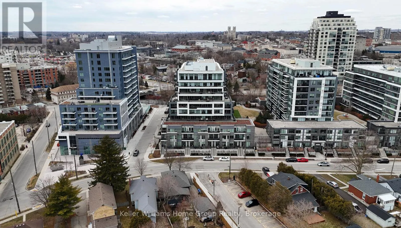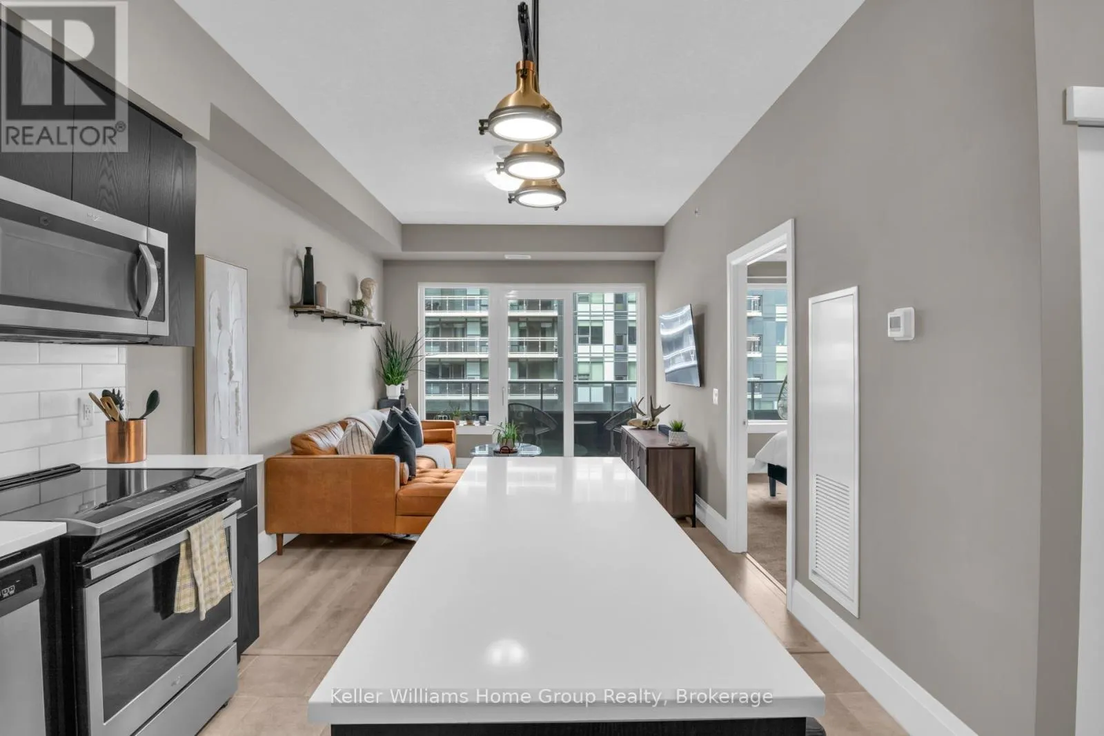 Arthur St S / Elizabeth St Experience modern living at the Copper Club, part of Guelph's Metalworks community. This 5th-floor suite features a practical one-bedroom plus den layout, highlighted by soaring 9-foot ceilings and expansive windows that fill the space with natural light. The chef-inspired kitchen serves as the heart of the home, featuring Whirlpool stainless steel appliances, quartz countertops, and an oversized island designed for both functionality and entertaining. The main living area opens directly onto a private 112-square-foot balcony, providing an expansive outdoor retreat with views of sunsets and the quiet courtyard. The versatile den provides additional functional space, serving as an ideal dedicated home office, reading nook, or a flexible area that can be converted into a guest bedroom. This suite includes the added convenience of in-suite laundry, one underground parking space, and a heated storage locker. Residents of the Copper Club enjoy access to an impressive selection of amenities, including a speakeasy lounge, fitness center, party room, pet spa, and outdoor fire pits with bocce courts and BBQs. Perfectly situated in the heart of downtown, you are just steps away from the GO Station, river trails, and the city's finest dining and shops. This is a rare opportunity to own a high-end suite in one of Guelph's most iconic and walkable residential developments. (id:27476)