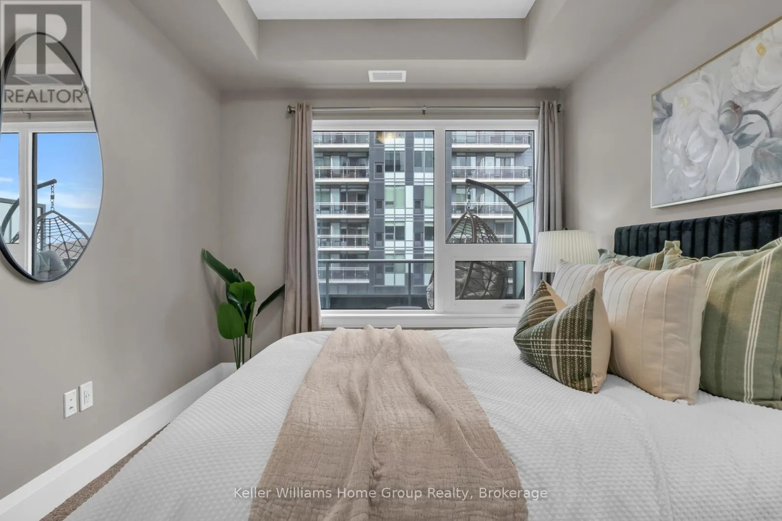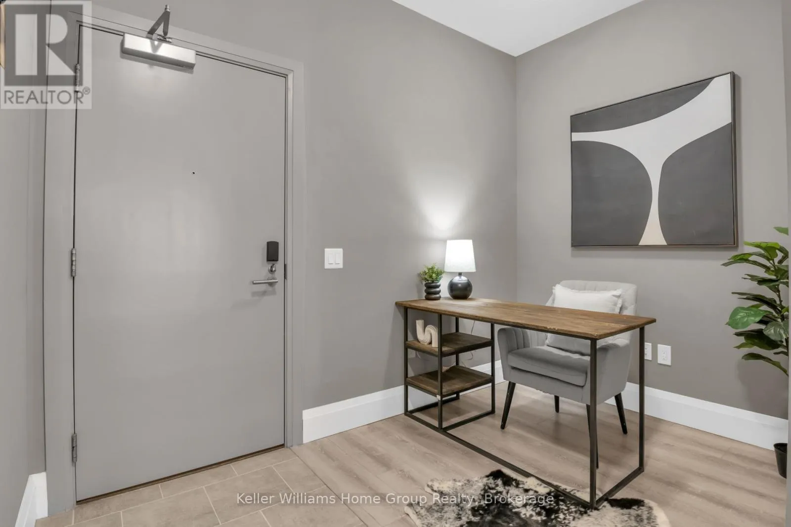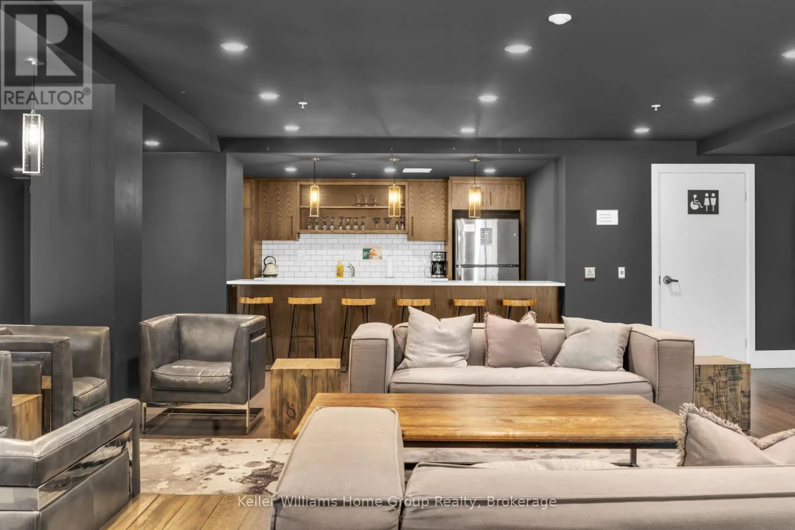Arthur St S / Elizabeth St Experience modern living at the Copper Club, part of Guelph's Metalworks community. This 5th-floor suite features a practical one-bedroom plus den layout, highlighted by soaring 9-foot ceilings and expansive windows that fill the space with natural light. The chef-inspired kitchen serves as the heart of the home, featuring Whirlpool stainless steel appliances, quartz countertops, and an oversized island designed for both functionality and entertaining. The main living area opens directly onto a private 112-square-foot balcony, providing an expansive outdoor retreat with views of sunsets and the quiet courtyard. The versatile den provides additional functional space, serving as an ideal dedicated home office, reading nook, or a flexible area that can be converted into a guest bedroom. This suite includes the added convenience of in-suite laundry, one underground parking space, and a heated storage locker. Residents of the Copper Club enjoy access to an impressive selection of amenities, including a speakeasy lounge, fitness center, party room, pet spa, and outdoor fire pits with bocce courts and BBQs. Perfectly situated in the heart of downtown, you are just steps away from the GO Station, river trails, and the city's finest dining and shops. This is a rare opportunity to own a high-end suite in one of Guelph's most iconic and walkable residential developments. (id:27476)