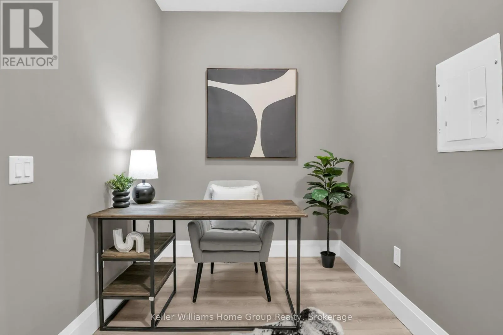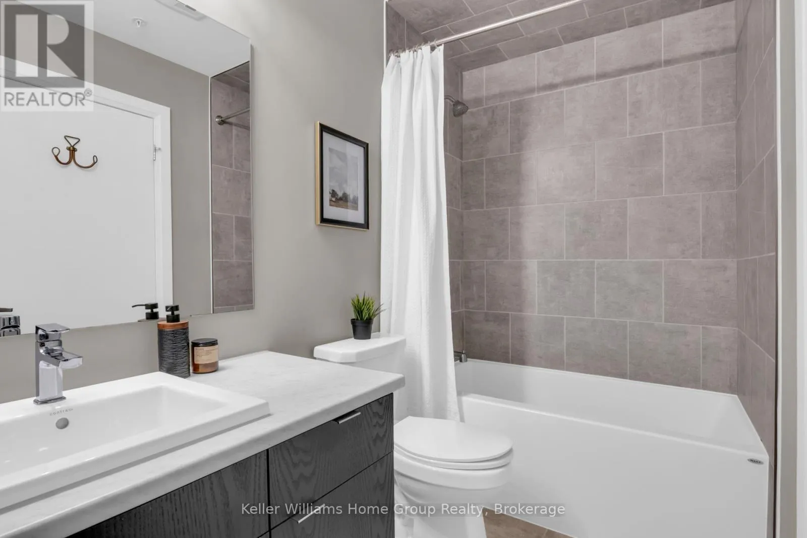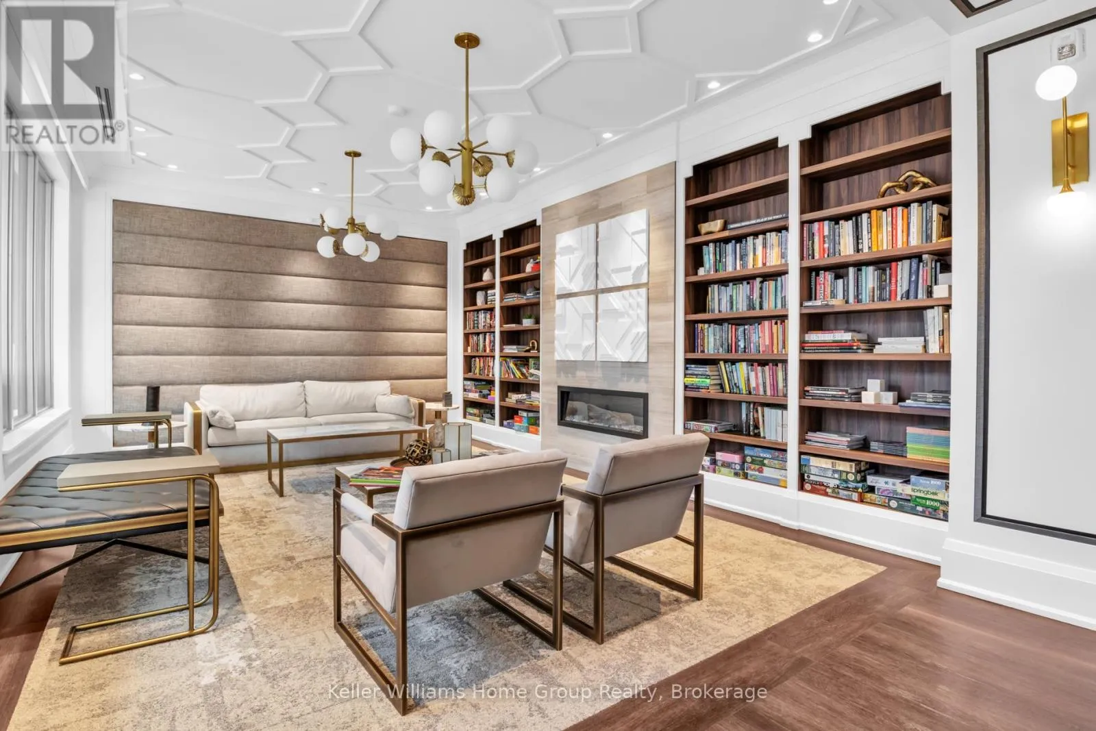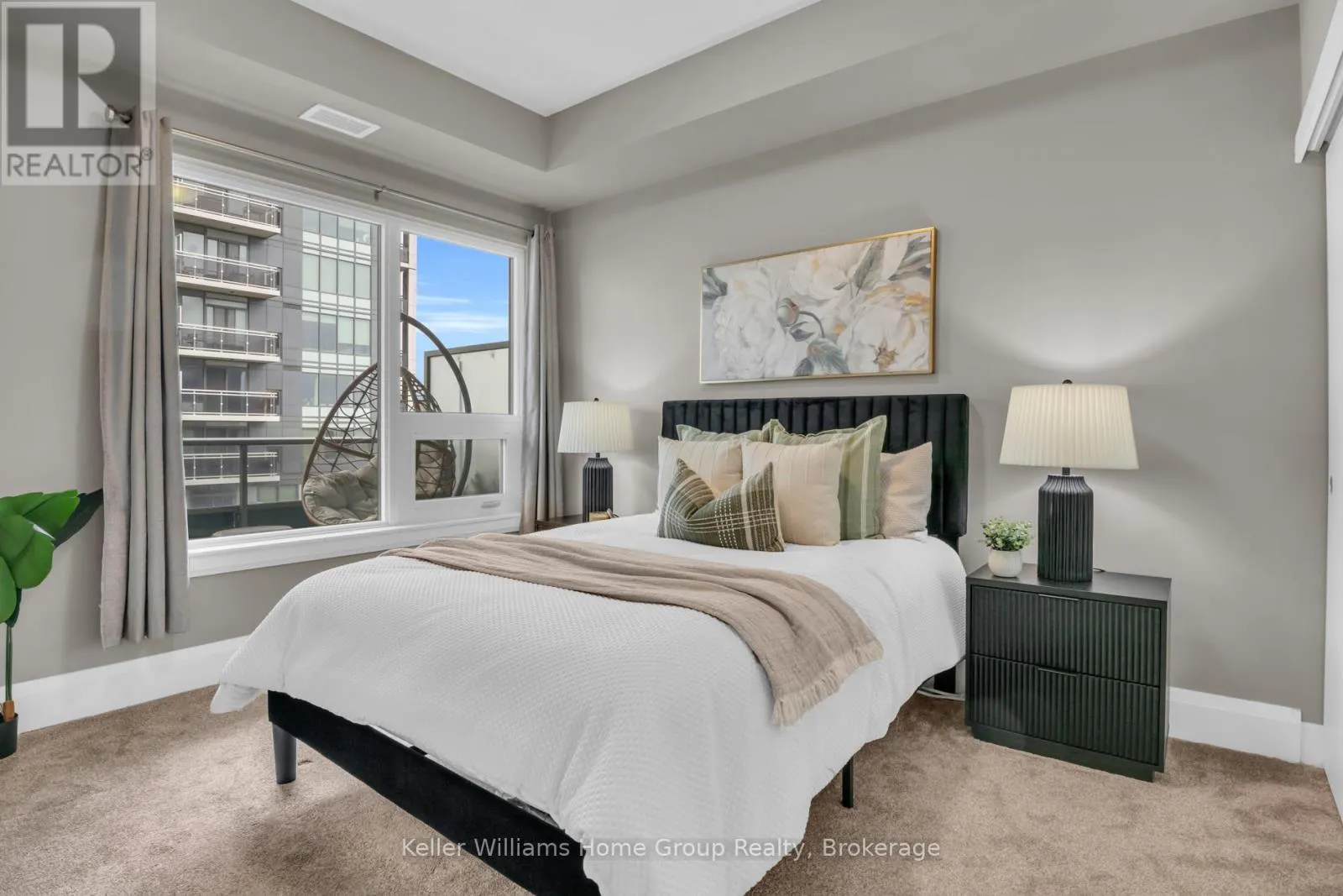 Arthur St S / Elizabeth St Experience modern living at the Copper Club, part of Guelph's Metalworks community. This 5th-floor suite features a practical one-bedroom plus den layout, highlighted by soaring 9-foot ceilings and expansive windows that fill the space with natural light. The chef-inspired kitchen serves as the heart of the home, featuring Whirlpool stainless steel appliances, quartz countertops, and an oversized island designed for both functionality and entertaining. The main living area opens directly onto a private 112-square-foot balcony, providing an expansive outdoor retreat with views of sunsets and the quiet courtyard. The versatile den provides additional functional space, serving as an ideal dedicated home office, reading nook, or a flexible area that can be converted into a guest bedroom. This suite includes the added convenience of in-suite laundry, one underground parking space, and a heated storage locker. Residents of the Copper Club enjoy access to an impressive selection of amenities, including a speakeasy lounge, fitness center, party room, pet spa, and outdoor fire pits with bocce courts and BBQs. Perfectly situated in the heart of downtown, you are just steps away from the GO Station, river trails, and the city's finest dining and shops. This is a rare opportunity to own a high-end suite in one of Guelph's most iconic and walkable residential developments. (id:27476)