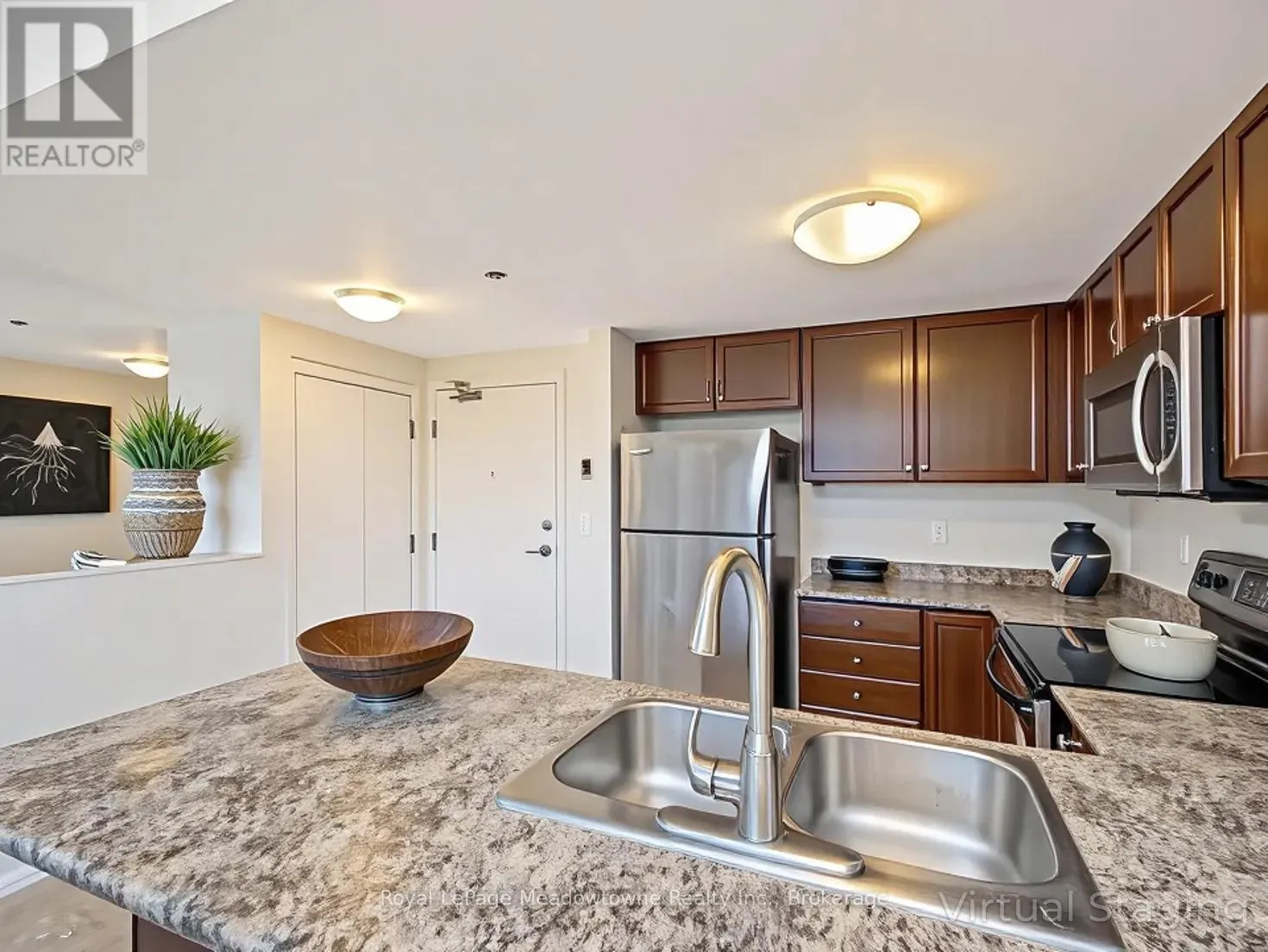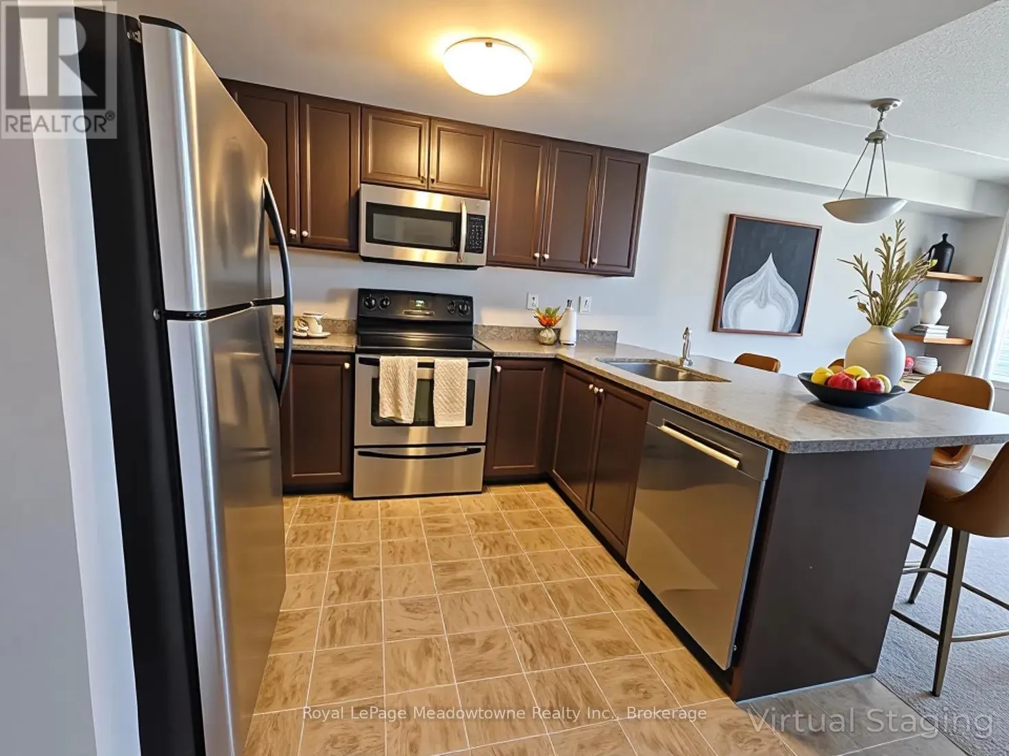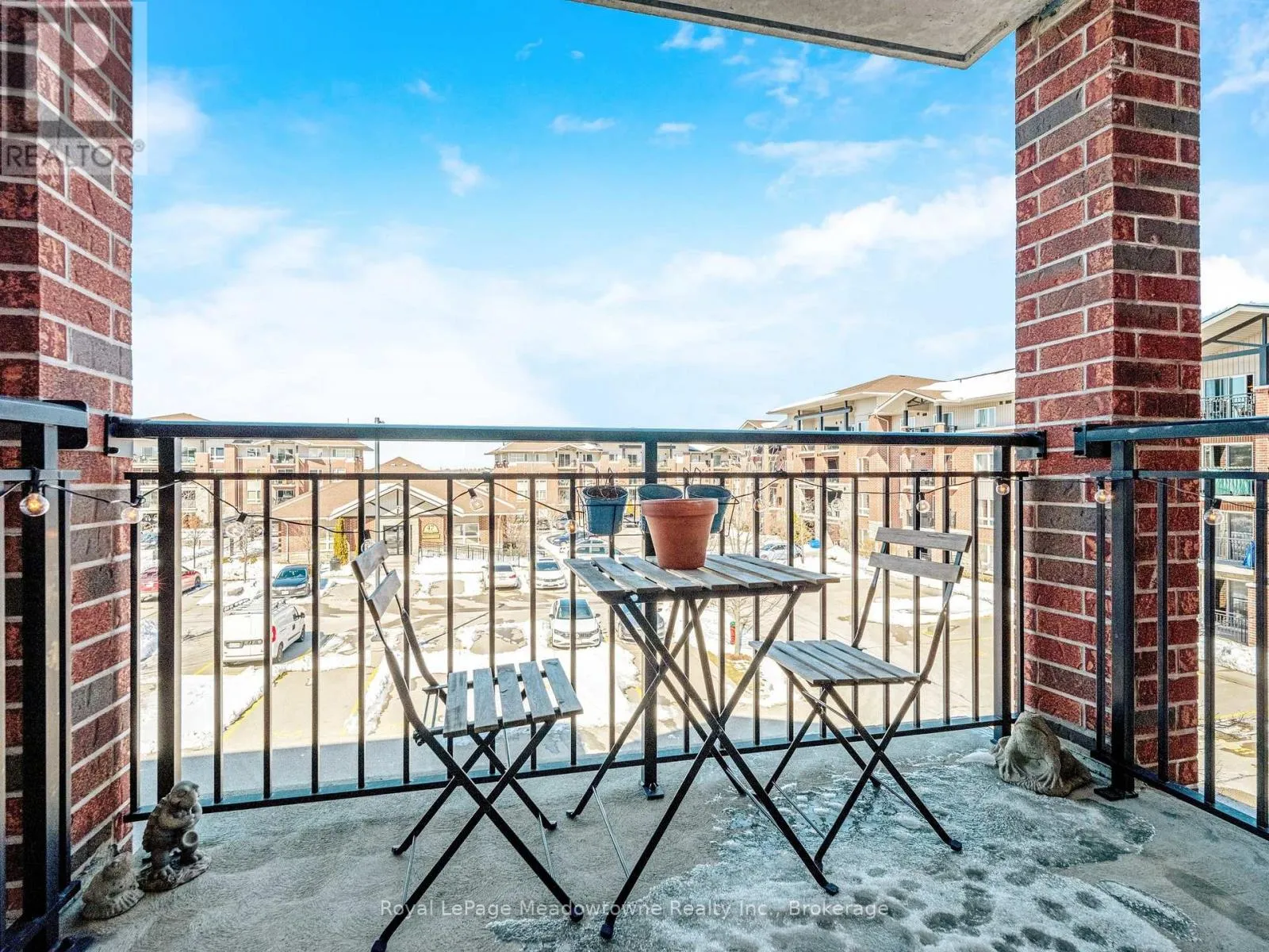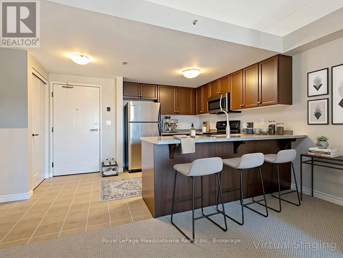 Cross Streets: Clair Rd E/Goodwin Drive. ** Directions: Gordon St to Clair Rd E to Goodwin Drive. TWO bedroom plus DEN condo located in Guelphs south end. Close to all amenities and providing easy access to the 401and public transit, this spacious and bright condo fits just about every buyer! Whether you are a first time buyer, a retiree looking to downsize or an avid investor, this unit is for you!! The large floorplan boasts a stylish kitchen with stainless steel appliances and plenty of counterspace, including a breakfast bar. The attached den has so many purposes, can be used as a dining room, a home office or possibly a hobby room, so many options for this space. The spacious living room opens up to a private balcony, a lovely area to enjoy your morning coffee or a quiet area to read your favourite book. Two large bedrooms and a 4pc bathroom are also situated in this floorplan. New furnace/AirCon 2026. (id:27476)