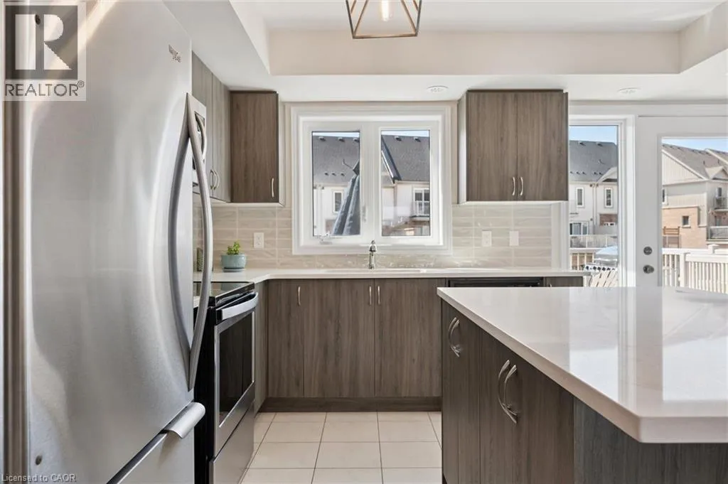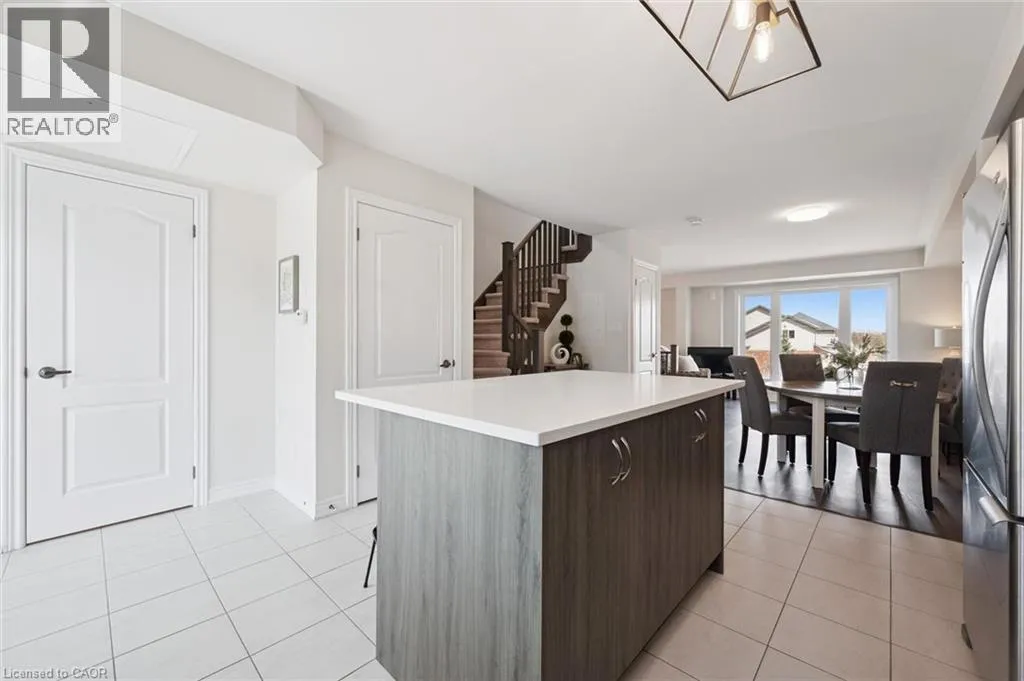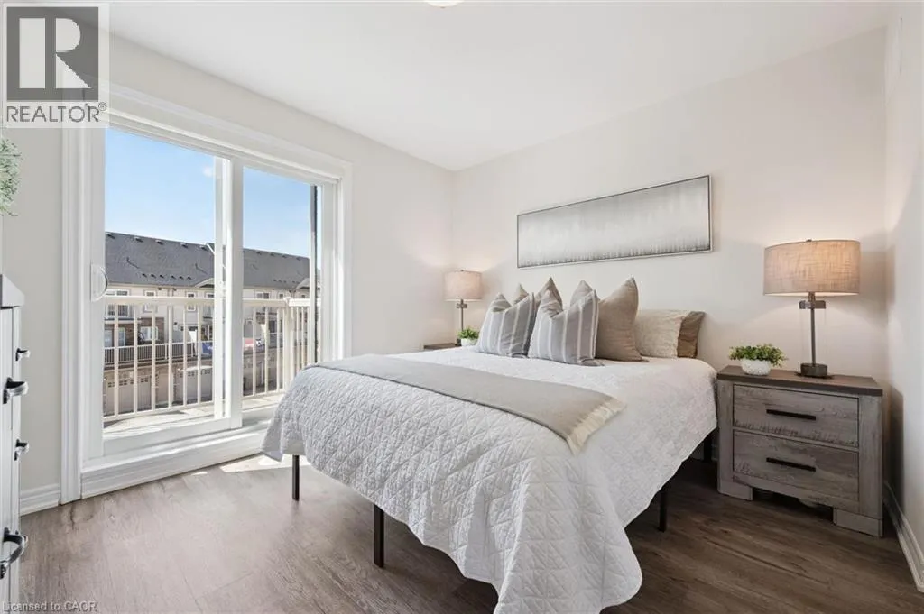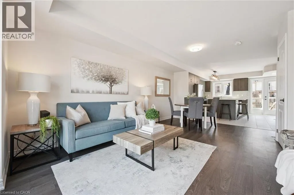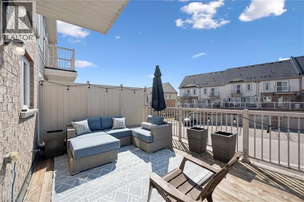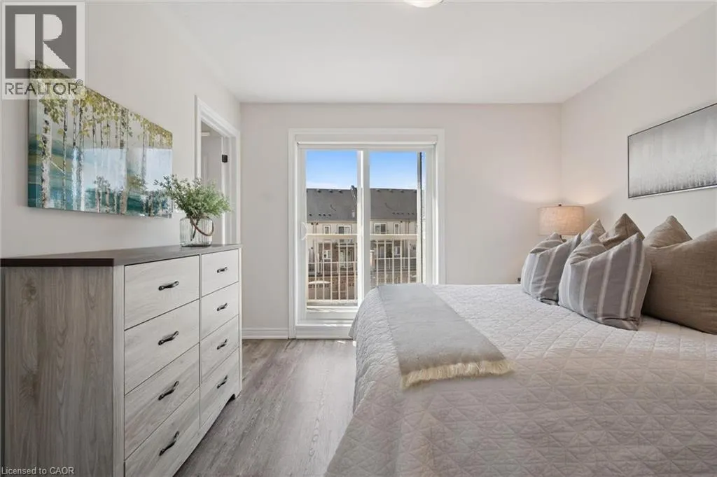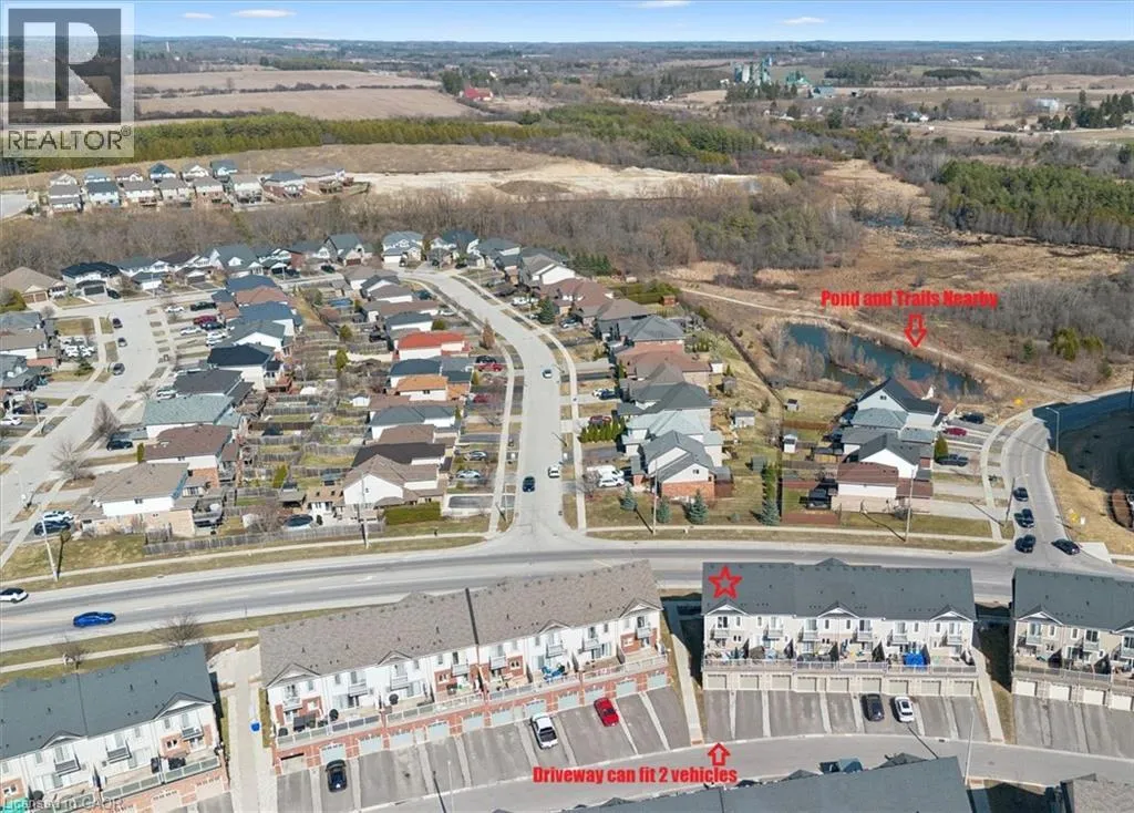 Watson/Starwood Near Law Drive Incredible home in an incredible location! This large END UNIT 3 bedroom, 2.5 bath townhome is sure to impress complete with 3 PARKING SPACES! Upon entering you're greeted with the massive open concept main living level filled with natural light from east and west facing windows. The generous living room and dining room space allow for any furniture choices you wish. A contemporary kitchen complete with plenty of storage, quartz counters, stunning backsplash tile, SS appliances and massive island with seating on 2 sides (plus storage front & back!) is the hub of this home. You'll enjoy relaxing or entertaining in this fantastic space with it's views over treed property with the nearby pond in the distance. Off the kitchen is a very large back deck perfect for your quiet morning coffees or evenings entertaining family and friends. Finishing off this level is a lovely 2 pce bath. Upstairs are 3 right sized bedrooms plus desirable bedroom level laundry (complete with floor drain). The primary bedroom is truly a retreat with its own private balcony, generous walk-in closet and upgraded ensuite with glass + tile shower. An unexpected surprise here is the oversized attached garage...tons of room for storage while still fitting your vehicle! The single wide driveway can hold two cars long. Upgraded luxury vinyl flooring on main and second floors 2023 & new hot water heater 2026. Tasteful neutral decor throughout & the added natural light from additional windows being an end unit are icing on the cake. This East End of Guelph area is ideal for families, couples or individuals alike with great schools close by, library, tons of trails/ponds for nature enthusiasts, Eastview Park with splashpad, disc golf and soccer fields, directly on public transit line and commuter close to main routes! This home must be seen to be appreciated, book your showing today! (id:27476)