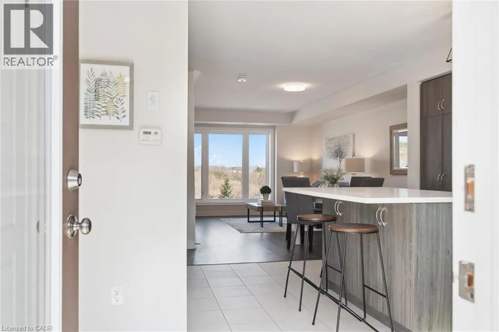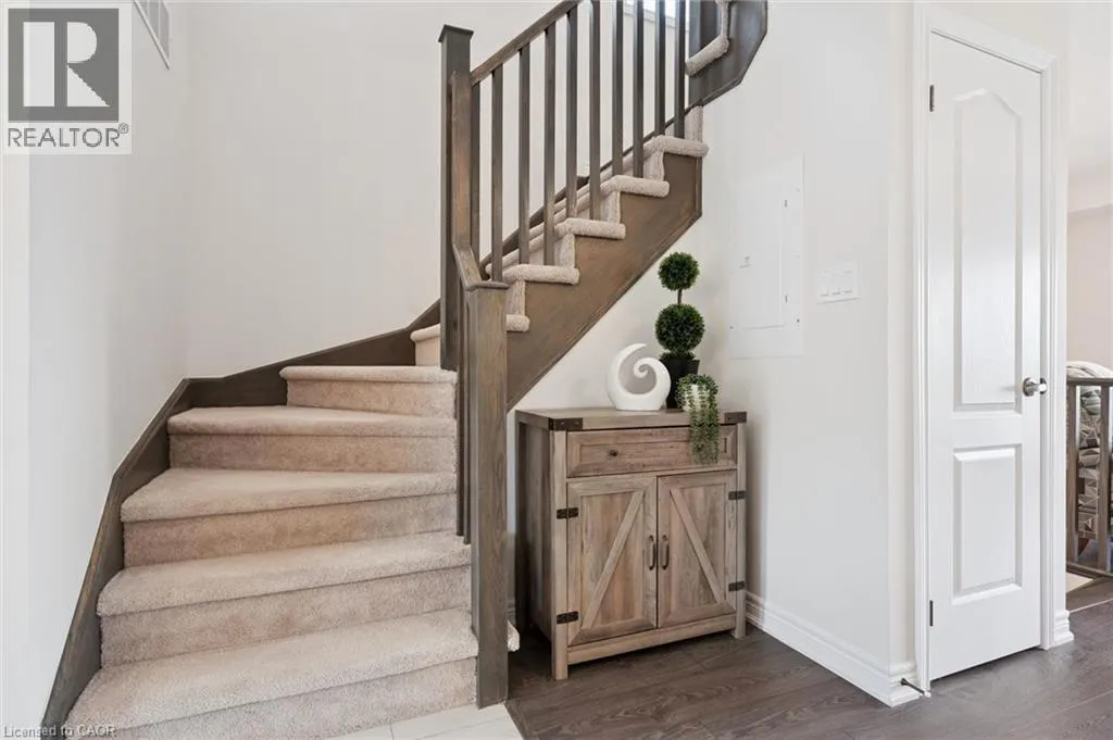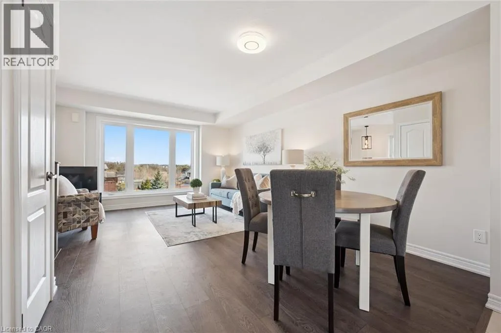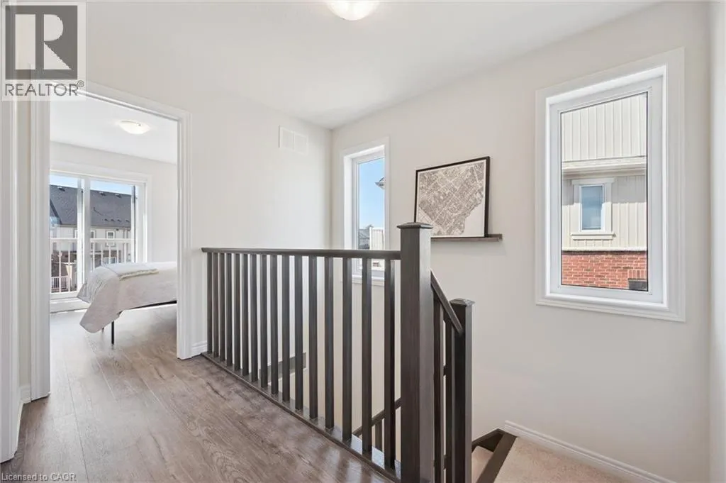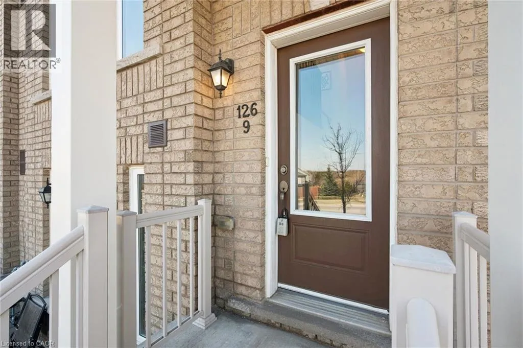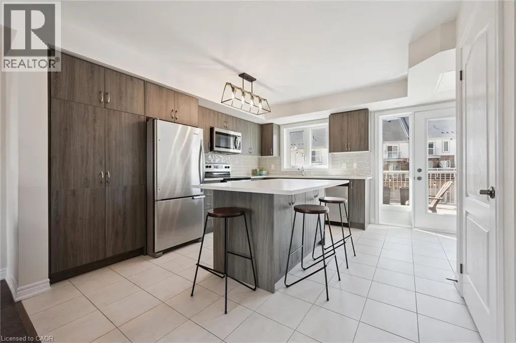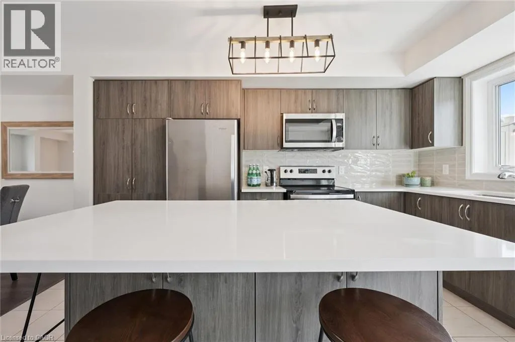 Watson/Starwood Near Law Drive Incredible home in an incredible location! This large END UNIT 3 bedroom, 2.5 bath townhome is sure to impress complete with 3 PARKING SPACES! Upon entering you're greeted with the massive open concept main living level filled with natural light from east and west facing windows. The generous living room and dining room space allow for any furniture choices you wish. A contemporary kitchen complete with plenty of storage, quartz counters, stunning backsplash tile, SS appliances and massive island with seating on 2 sides (plus storage front & back!) is the hub of this home. You'll enjoy relaxing or entertaining in this fantastic space with it's views over treed property with the nearby pond in the distance. Off the kitchen is a very large back deck perfect for your quiet morning coffees or evenings entertaining family and friends. Finishing off this level is a lovely 2 pce bath. Upstairs are 3 right sized bedrooms plus desirable bedroom level laundry (complete with floor drain). The primary bedroom is truly a retreat with its own private balcony, generous walk-in closet and upgraded ensuite with glass + tile shower. An unexpected surprise here is the oversized attached garage...tons of room for storage while still fitting your vehicle! The single wide driveway can hold two cars long. Upgraded luxury vinyl flooring on main and second floors 2023 & new hot water heater 2026. Tasteful neutral decor throughout & the added natural light from additional windows being an end unit are icing on the cake. This East End of Guelph area is ideal for families, couples or individuals alike with great schools close by, library, tons of trails/ponds for nature enthusiasts, Eastview Park with splashpad, disc golf and soccer fields, directly on public transit line and commuter close to main routes! This home must be seen to be appreciated, book your showing today! (id:27476)
