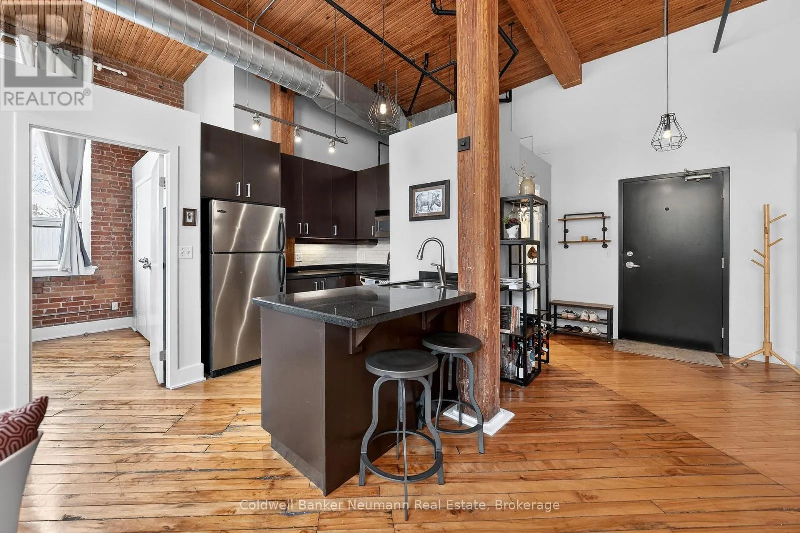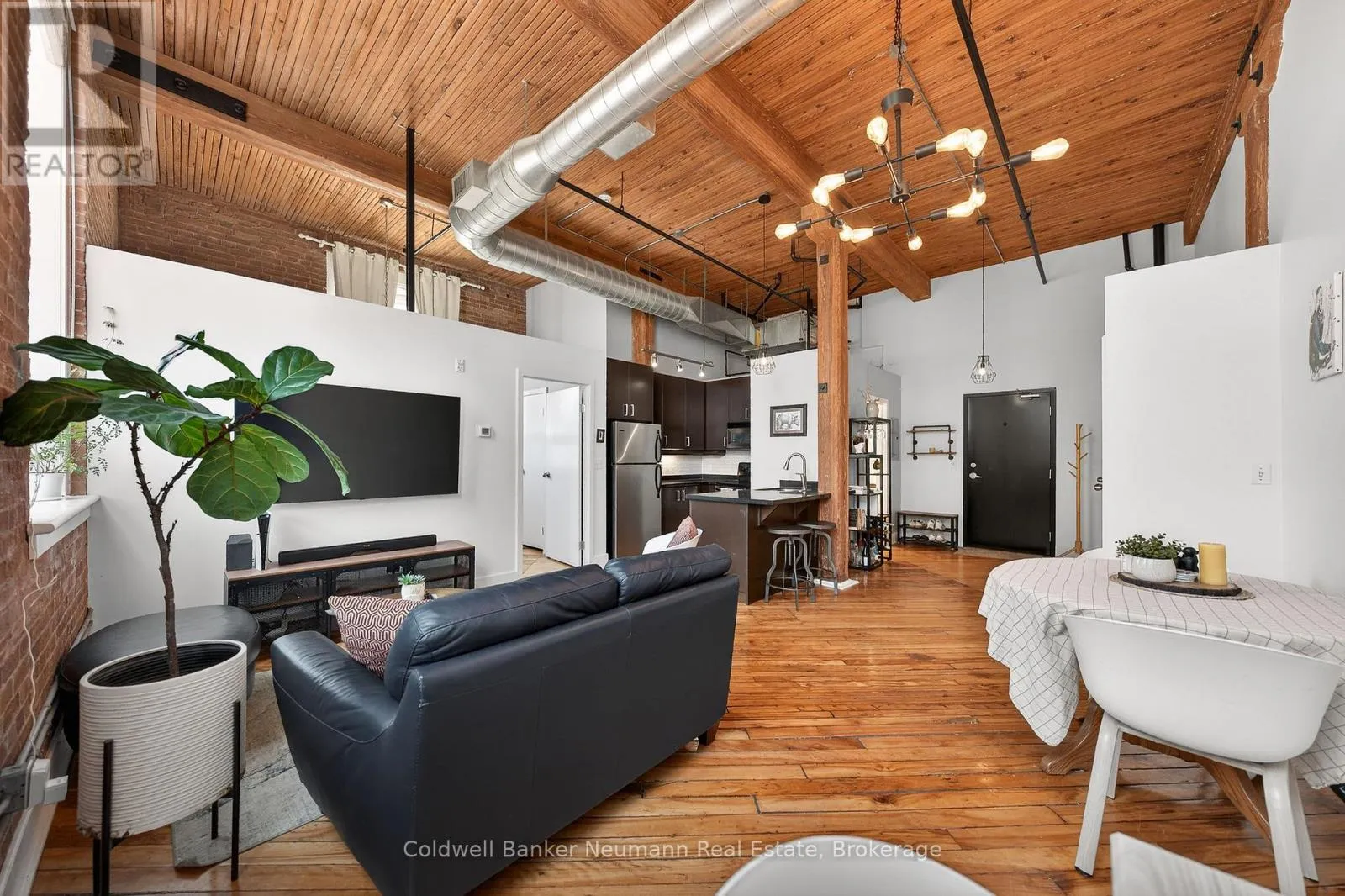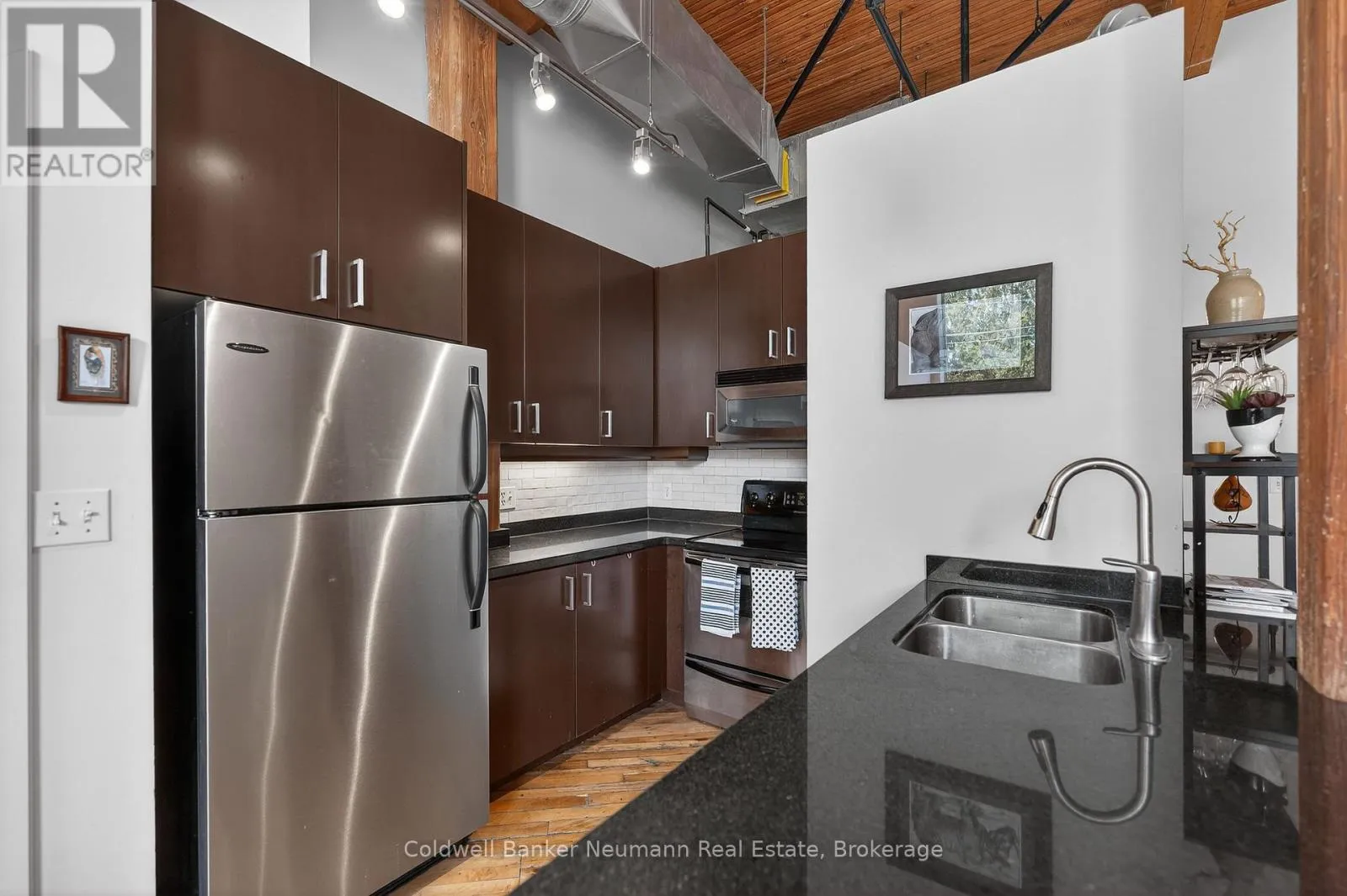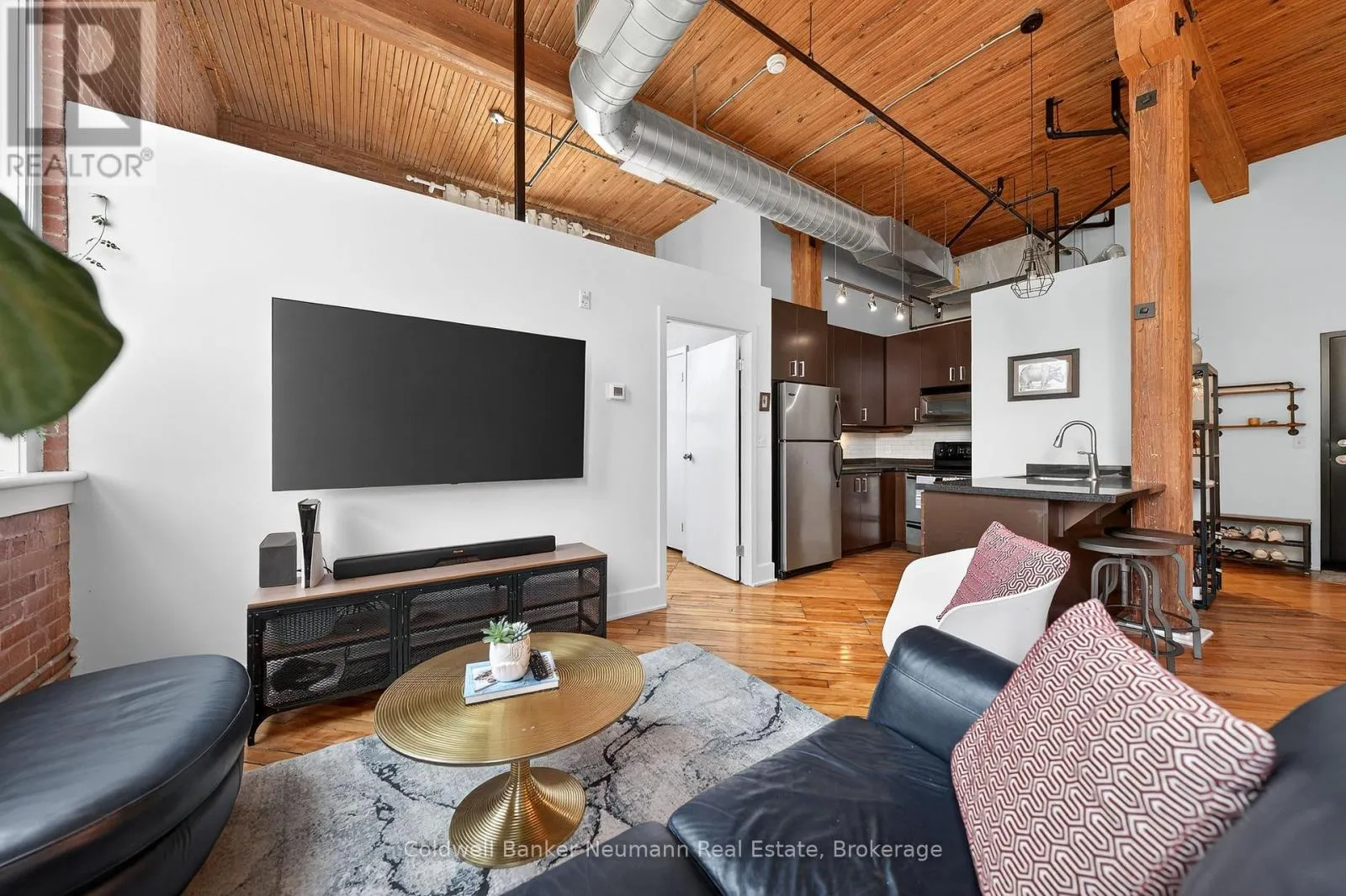 Cross Streets: Cross St & Arthur St S. ** Directions: Wellington - Neeve - Ontario. Authentic loft living in the heart of Guelph. Located in the highly desirable Mill Lofts, this corner unit is a one-bedroom, one-bathroom. it showcases the timeless appeal of true industrial design paired with thoughtful modern updates.Rich exposed brick walls set the tone throughout the space, adding warmth, texture, and undeniable character you simply won't find in newer builds. The open-concept layout is complemented by high ceilings and oversized windows, creating a bright and inviting atmosphere.The proffesionally remodeled bathroom by Urban Uplift, delivers a fresh, contemporary feel with updated finishes designed for everyday comfort.The kitchen flows seamlessly into the living area, making it ideal for both relaxed living and entertaining. Every corner of this unit reflects a balance of historic charm and practical functionality.Set in one of Guelph's most vibrant neighbourhoods, you're just steps to the GO Station, downtown amenities, and scenic trails along the Speed River-perfect for those who value both convenience and lifestyle. (id:27476)