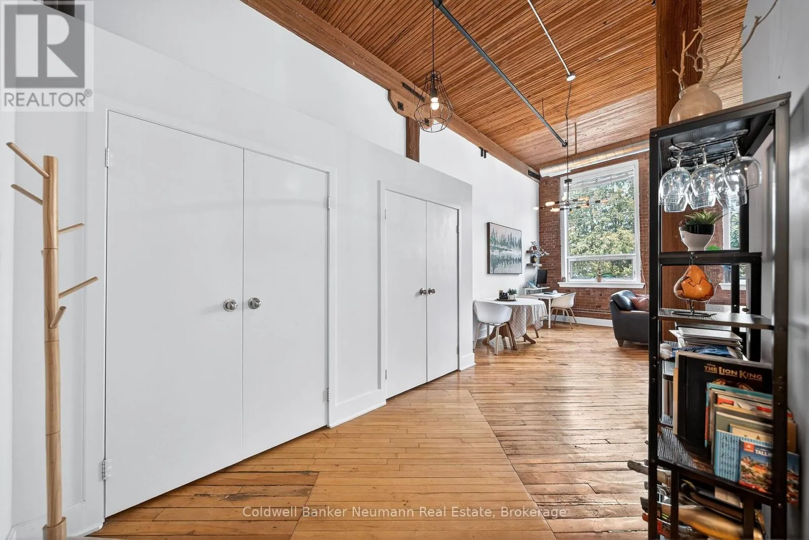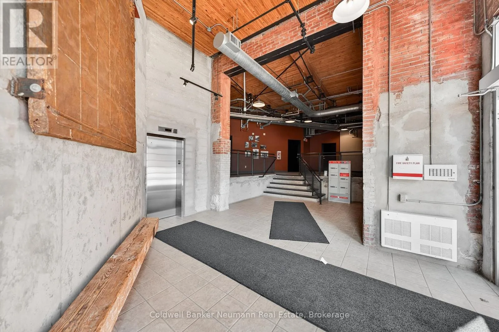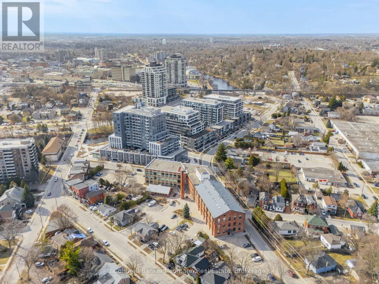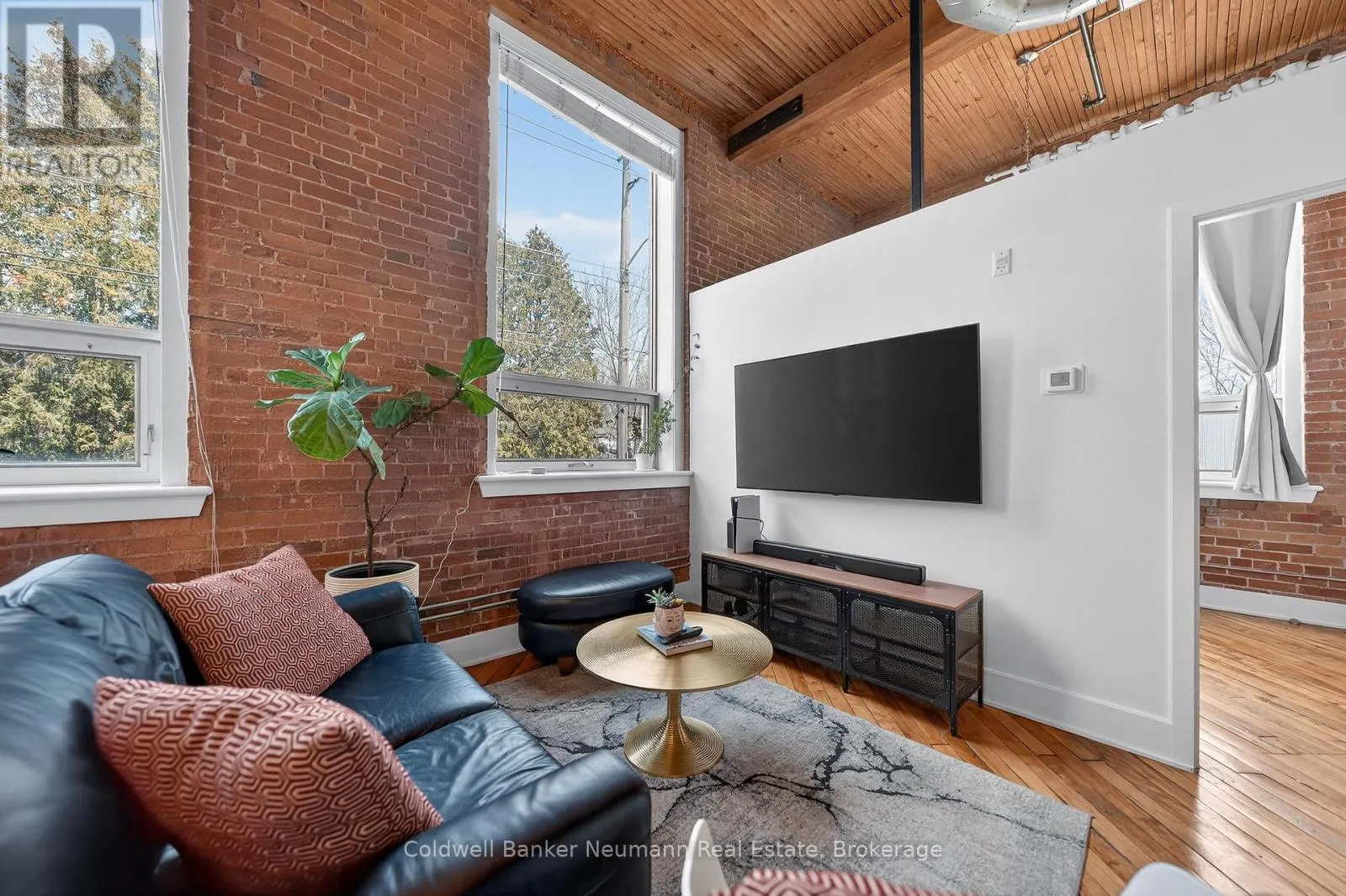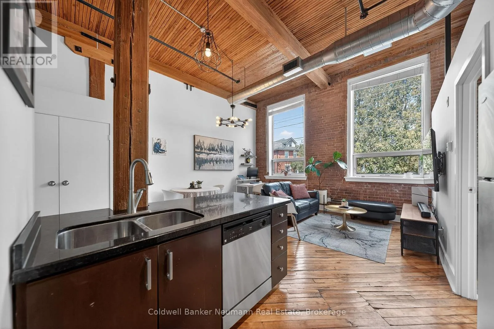 Cross Streets: Cross St & Arthur St S. ** Directions: Wellington - Neeve - Ontario. Authentic loft living in the heart of Guelph. Located in the highly desirable Mill Lofts, this corner unit is a one-bedroom, one-bathroom. it showcases the timeless appeal of true industrial design paired with thoughtful modern updates.Rich exposed brick walls set the tone throughout the space, adding warmth, texture, and undeniable character you simply won't find in newer builds. The open-concept layout is complemented by high ceilings and oversized windows, creating a bright and inviting atmosphere.The proffesionally remodeled bathroom by Urban Uplift, delivers a fresh, contemporary feel with updated finishes designed for everyday comfort.The kitchen flows seamlessly into the living area, making it ideal for both relaxed living and entertaining. Every corner of this unit reflects a balance of historic charm and practical functionality.Set in one of Guelph's most vibrant neighbourhoods, you're just steps to the GO Station, downtown amenities, and scenic trails along the Speed River-perfect for those who value both convenience and lifestyle. (id:27476)