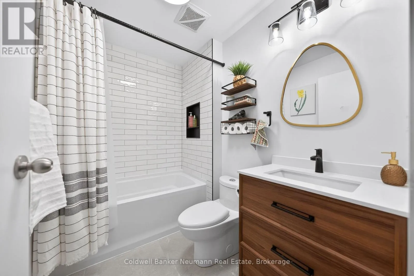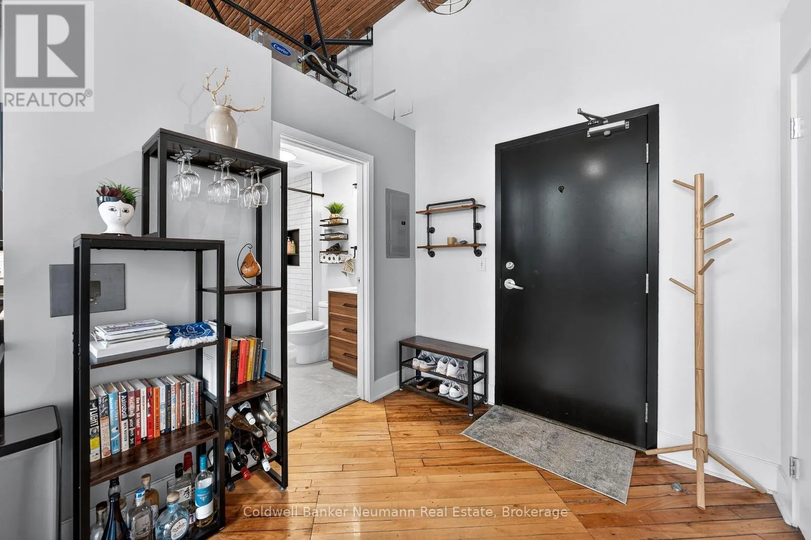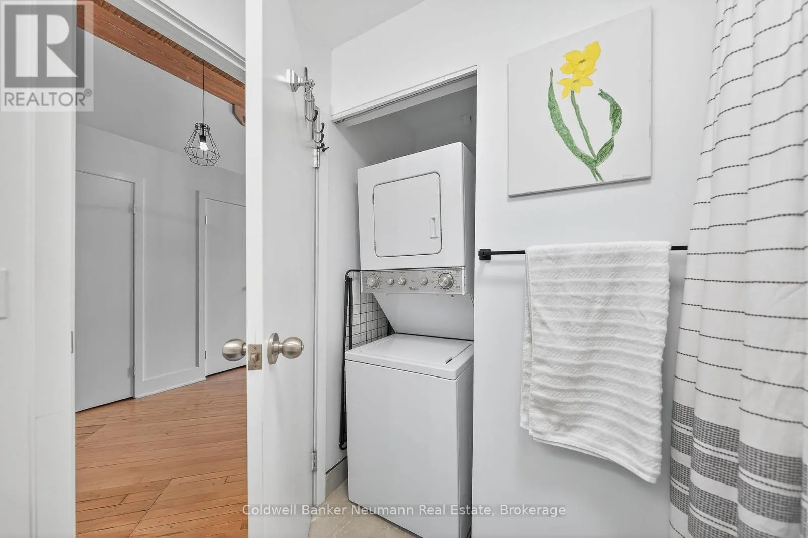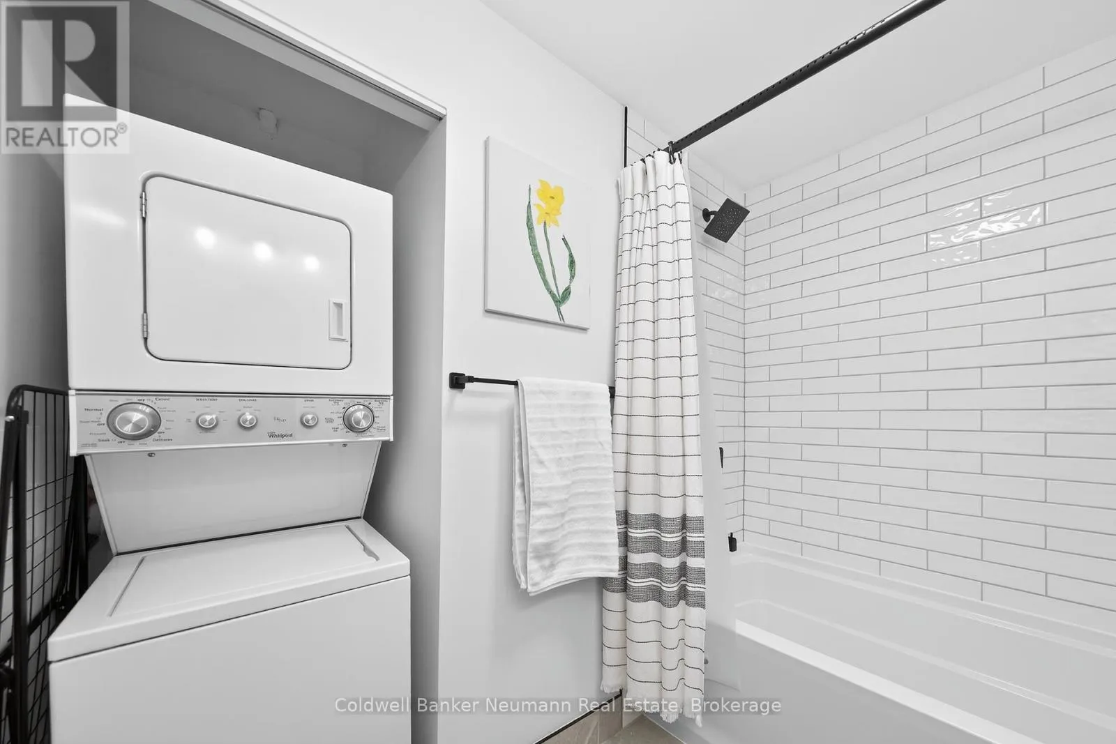 Cross Streets: Cross St & Arthur St S. ** Directions: Wellington - Neeve - Ontario. Authentic loft living in the heart of Guelph. Located in the highly desirable Mill Lofts, this corner unit is a one-bedroom, one-bathroom. it showcases the timeless appeal of true industrial design paired with thoughtful modern updates.Rich exposed brick walls set the tone throughout the space, adding warmth, texture, and undeniable character you simply won't find in newer builds. The open-concept layout is complemented by high ceilings and oversized windows, creating a bright and inviting atmosphere.The proffesionally remodeled bathroom by Urban Uplift, delivers a fresh, contemporary feel with updated finishes designed for everyday comfort.The kitchen flows seamlessly into the living area, making it ideal for both relaxed living and entertaining. Every corner of this unit reflects a balance of historic charm and practical functionality.Set in one of Guelph's most vibrant neighbourhoods, you're just steps to the GO Station, downtown amenities, and scenic trails along the Speed River-perfect for those who value both convenience and lifestyle. (id:27476)