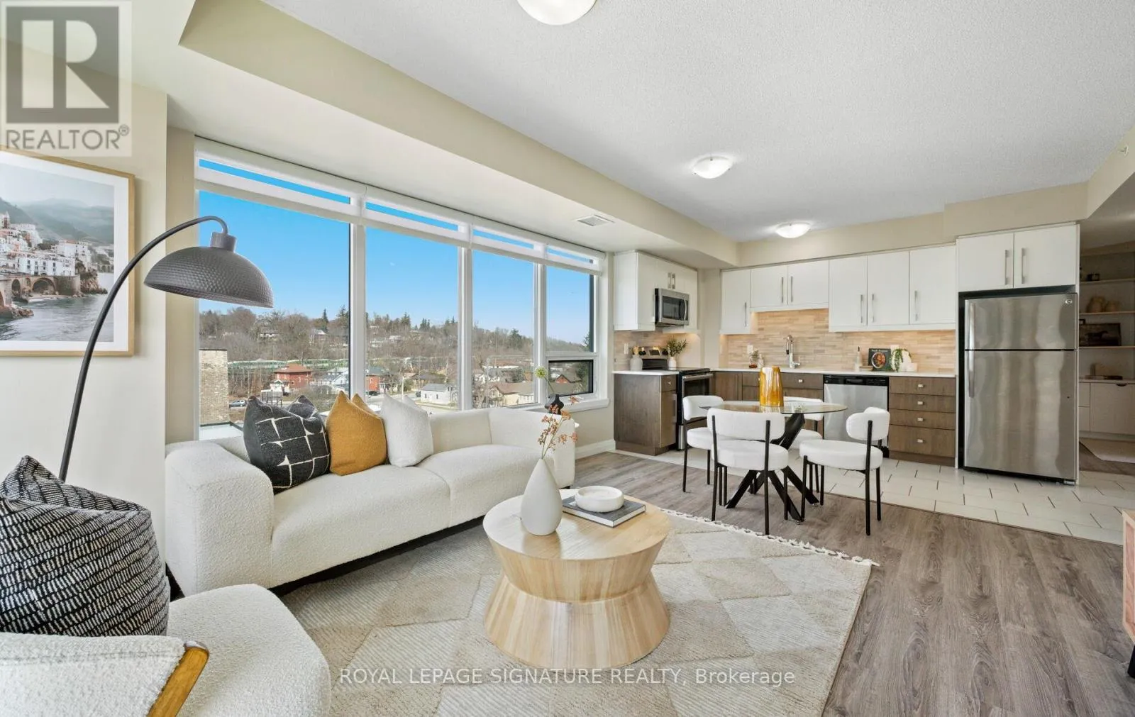 Elizabeth Street & Arthur Street South Welcome to Metalworks! This stunning 7th-floor corner unit offers beautiful river and city views and features a 2-bedroom plus den layout designed for both comfort and convenience. The suite includes in-suite laundry, a walk-in closet and ensuite bath off the primary bedroom, a storage locker and an underground parking space. Step out onto the private balcony to enjoy the river views. Residents enjoy full access to the exceptional Metalworks amenities, including a fully equipped fitness centre, entertainment lounge, guest suites, chef-inspired kitchen and dining space, outdoor courtyard with lounge areas and fire pits, library, speakeasy-style bar, games deck, concierge service and security. Ideally located steps from Guelph Central Station, providing easy access to GO and VIA Rail, GO and regional buses and Guelph Transit. Enjoy nearby scenic walking trails and a short stroll to local favourites such as the Sleeman Centre, River Run Centre, the Guelph Farmers' Market and the vibrant shops and restaurants of downtown Guelph. This is urban living at its best with nature, entertainment and transit right at your doorstep. (id:27476)