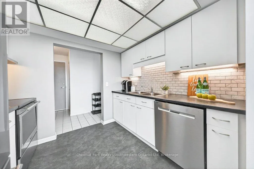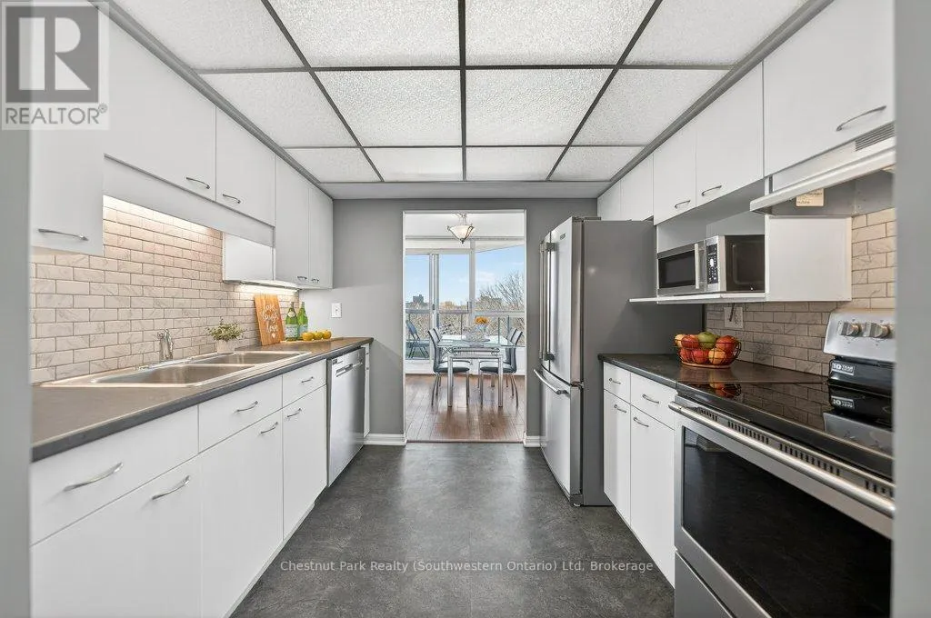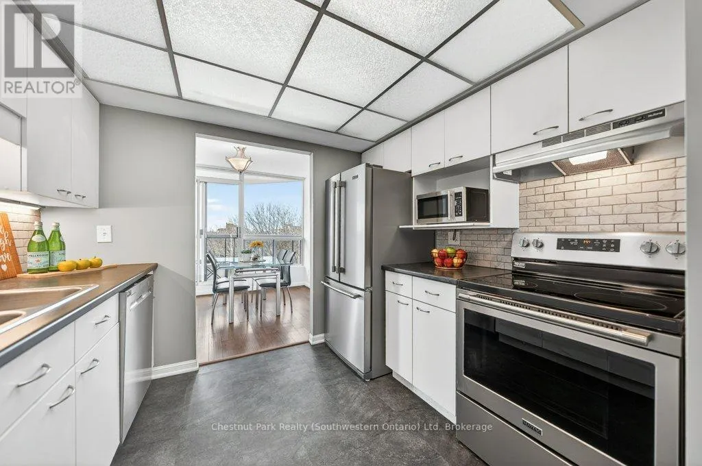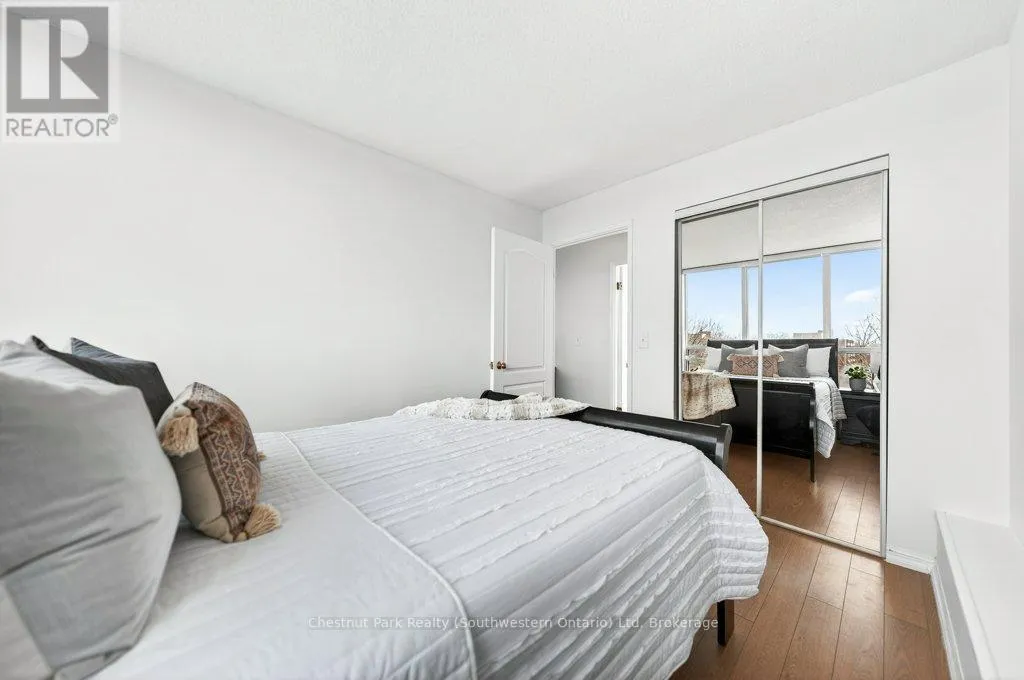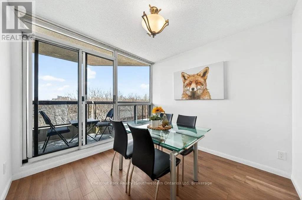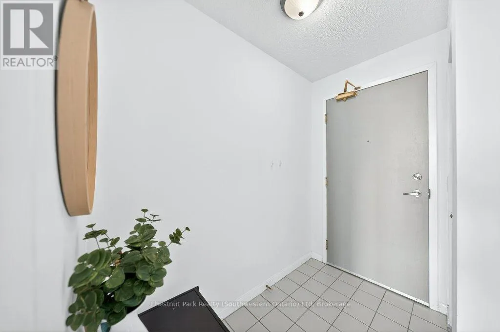 Cross Streets: Edinburgh Rd + Paisley. ** Directions: Edinburgh Rd left on Suffolk right on Bagot. Own the corner at an unbeatable price. 107 Bagot St, Unit 501 offers a rare fifth-floor layout in a building known for its solid construction (built 1992) and quiet living. At this price point, this is a strategic move for anyone wanting space, privacy, and long-term stability without the heavy mortgage. A major rarity for the city: this unit comes with TWO parking spots! Combined with a condo fee that includes water, this is a highly cost-effective home. As a west-facing corner unit, you get windows on two sides for natural light and extra privacy. The building is well-constructed, ensuring quiet living without the noise transfer found in newer builds-perfect for those who value peace and tranquility. This community has incredibly low turnover, a friendly atmosphere, and a highly-rated condo corporation that manages the property with pride. The interior has been freshly painted and features an open floor plan. Unlike small modern layouts, this unit offers a large living room and a dedicated, separate dining space. Both bedrooms are generously sized, featuring a primary bedroom large enough for a king-sized suite.You can also step onto your private balcony to take in unobstructed sunsets every evening. The heavy lifting is done: stainless steel kitchen appliances were updated in 2020, high-efficiency laundry in 2021, and the furnace was updated approximately 7 years ago. With Fibre Optic internet already in place, it is a perfect setup for those working from home or streaming your favorite shows. The building amenities add more value, featuring a party room, bike storage, a paint/workshop for hobbyists, and a large exclusive storage locker. Located in a quiet, established pocket, you are only minutes from downtown Guelph and major shopping. You get the benefits of a peaceful street with the convenience of the city just a short trip away. Two parking spots. New appliances. Stunning views. Peace and tranquility. 501-107 Bagot St is the smart, affordable sanctuary. (id:27476)