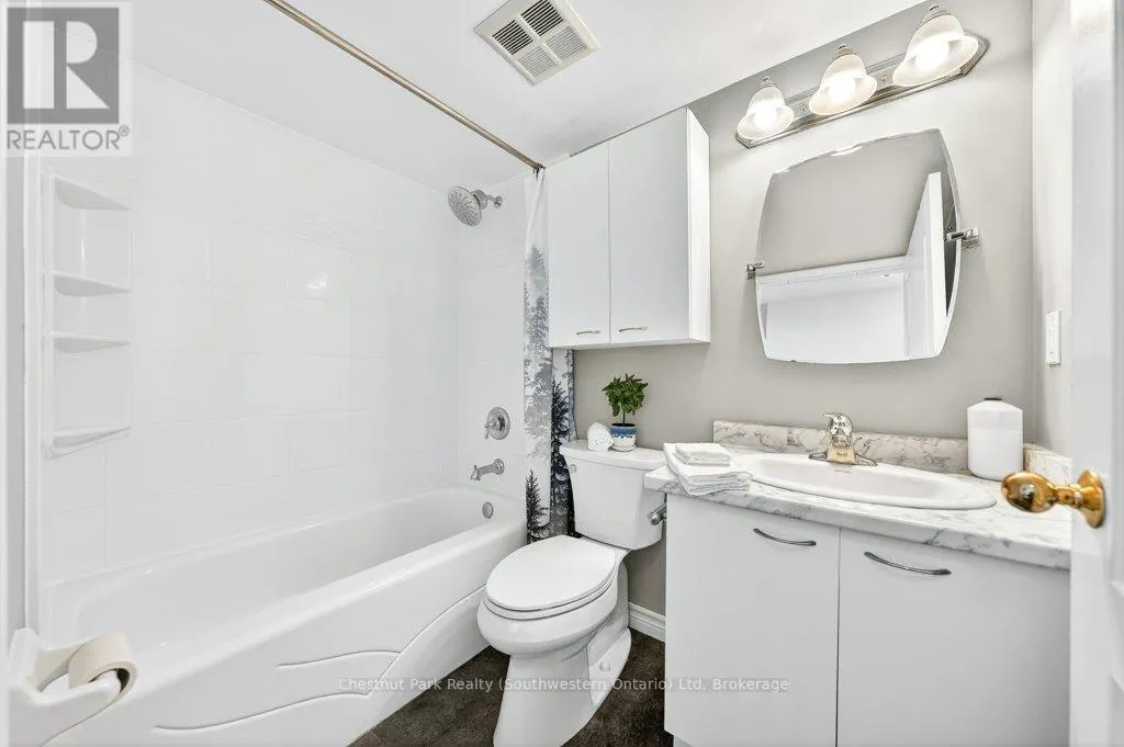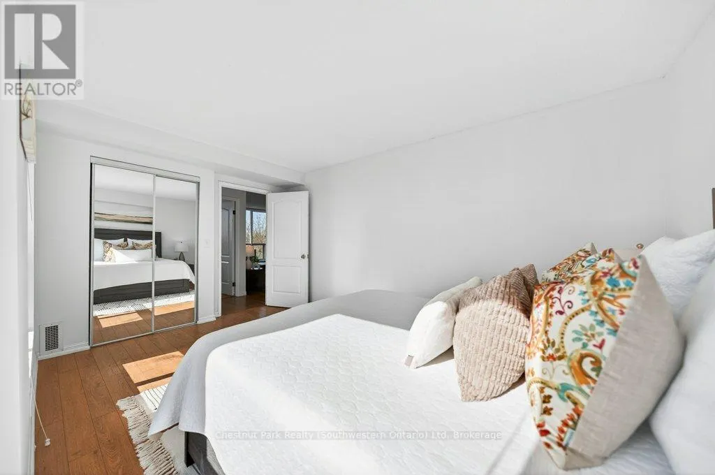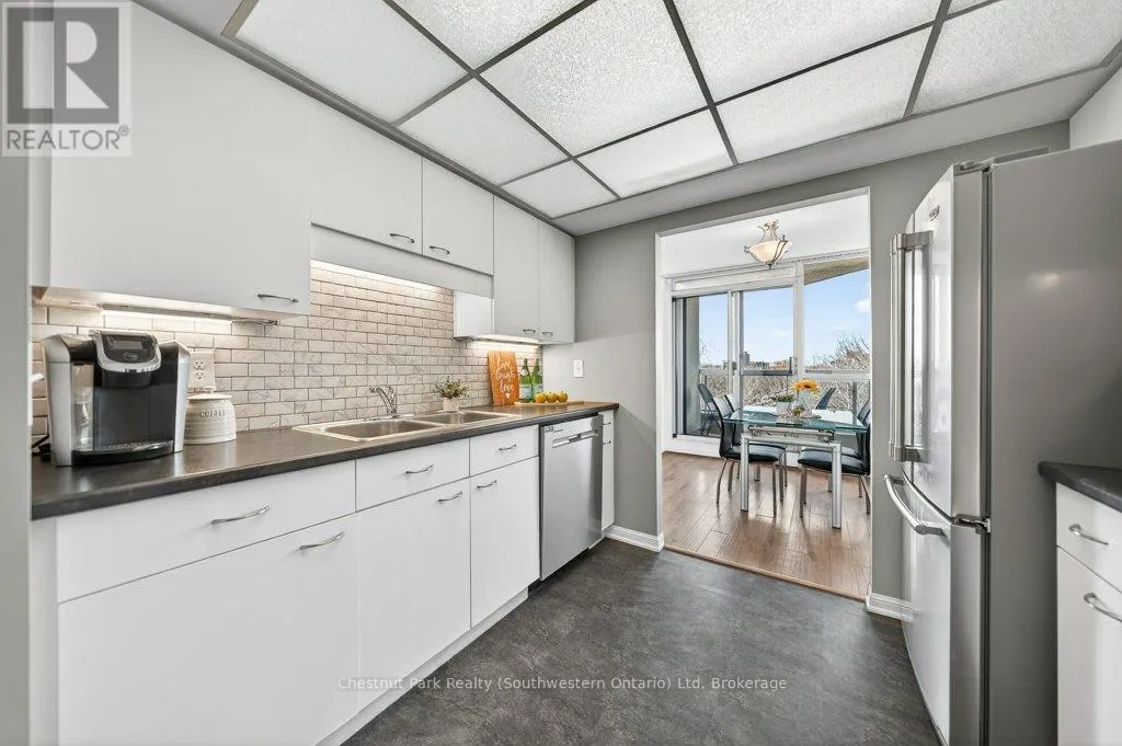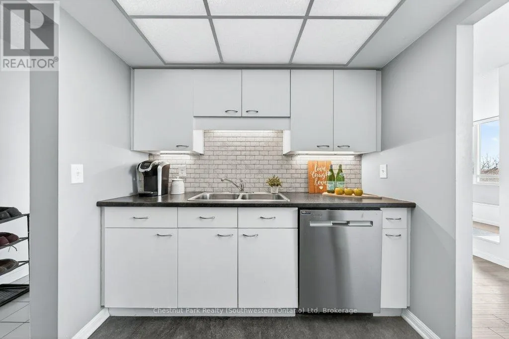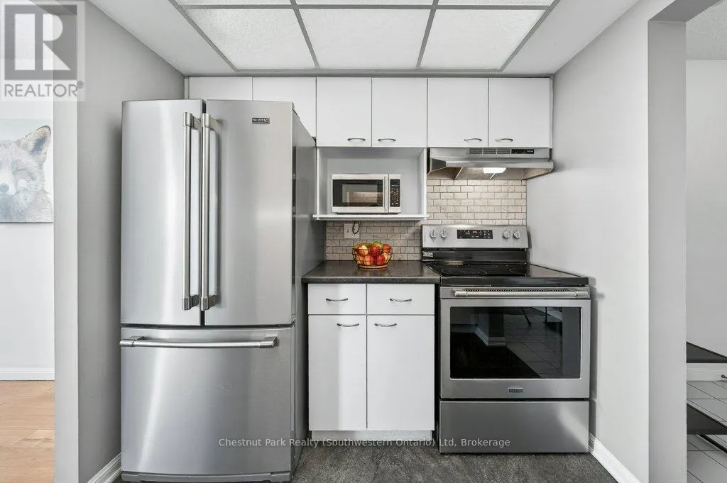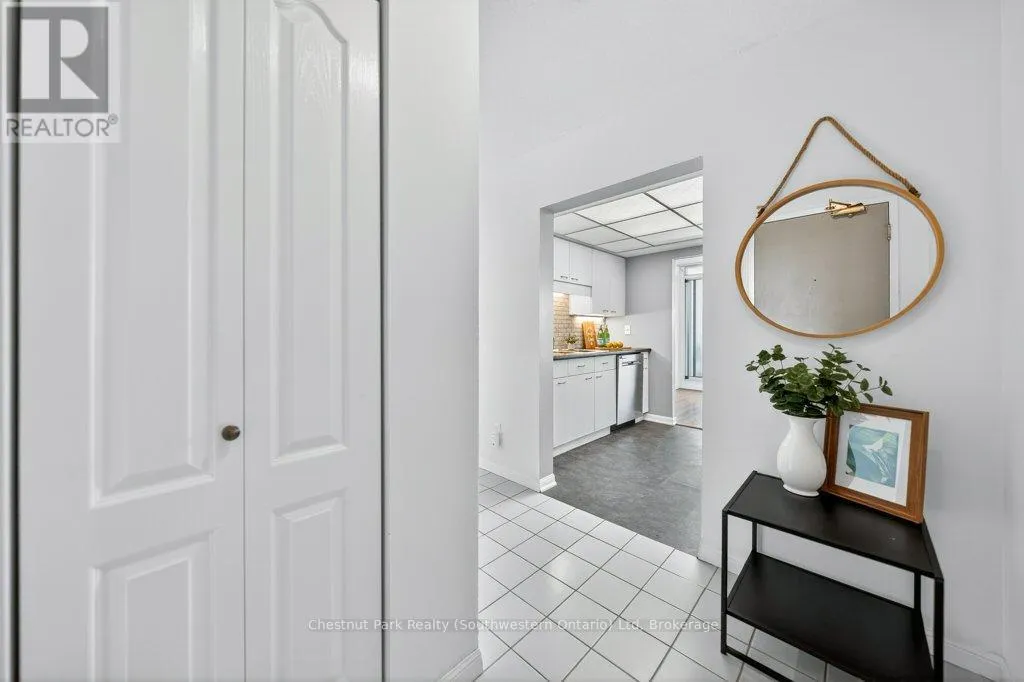 Cross Streets: Edinburgh Rd + Paisley. ** Directions: Edinburgh Rd left on Suffolk right on Bagot. Own the corner at an unbeatable price. 107 Bagot St, Unit 501 offers a rare fifth-floor layout in a building known for its solid construction (built 1992) and quiet living. At this price point, this is a strategic move for anyone wanting space, privacy, and long-term stability without the heavy mortgage. A major rarity for the city: this unit comes with TWO parking spots! Combined with a condo fee that includes water, this is a highly cost-effective home. As a west-facing corner unit, you get windows on two sides for natural light and extra privacy. The building is well-constructed, ensuring quiet living without the noise transfer found in newer builds-perfect for those who value peace and tranquility. This community has incredibly low turnover, a friendly atmosphere, and a highly-rated condo corporation that manages the property with pride. The interior has been freshly painted and features an open floor plan. Unlike small modern layouts, this unit offers a large living room and a dedicated, separate dining space. Both bedrooms are generously sized, featuring a primary bedroom large enough for a king-sized suite.You can also step onto your private balcony to take in unobstructed sunsets every evening. The heavy lifting is done: stainless steel kitchen appliances were updated in 2020, high-efficiency laundry in 2021, and the furnace was updated approximately 7 years ago. With Fibre Optic internet already in place, it is a perfect setup for those working from home or streaming your favorite shows. The building amenities add more value, featuring a party room, bike storage, a paint/workshop for hobbyists, and a large exclusive storage locker. Located in a quiet, established pocket, you are only minutes from downtown Guelph and major shopping. You get the benefits of a peaceful street with the convenience of the city just a short trip away. Two parking spots. New appliances. Stunning views. Peace and tranquility. 501-107 Bagot St is the smart, affordable sanctuary. (id:27476)