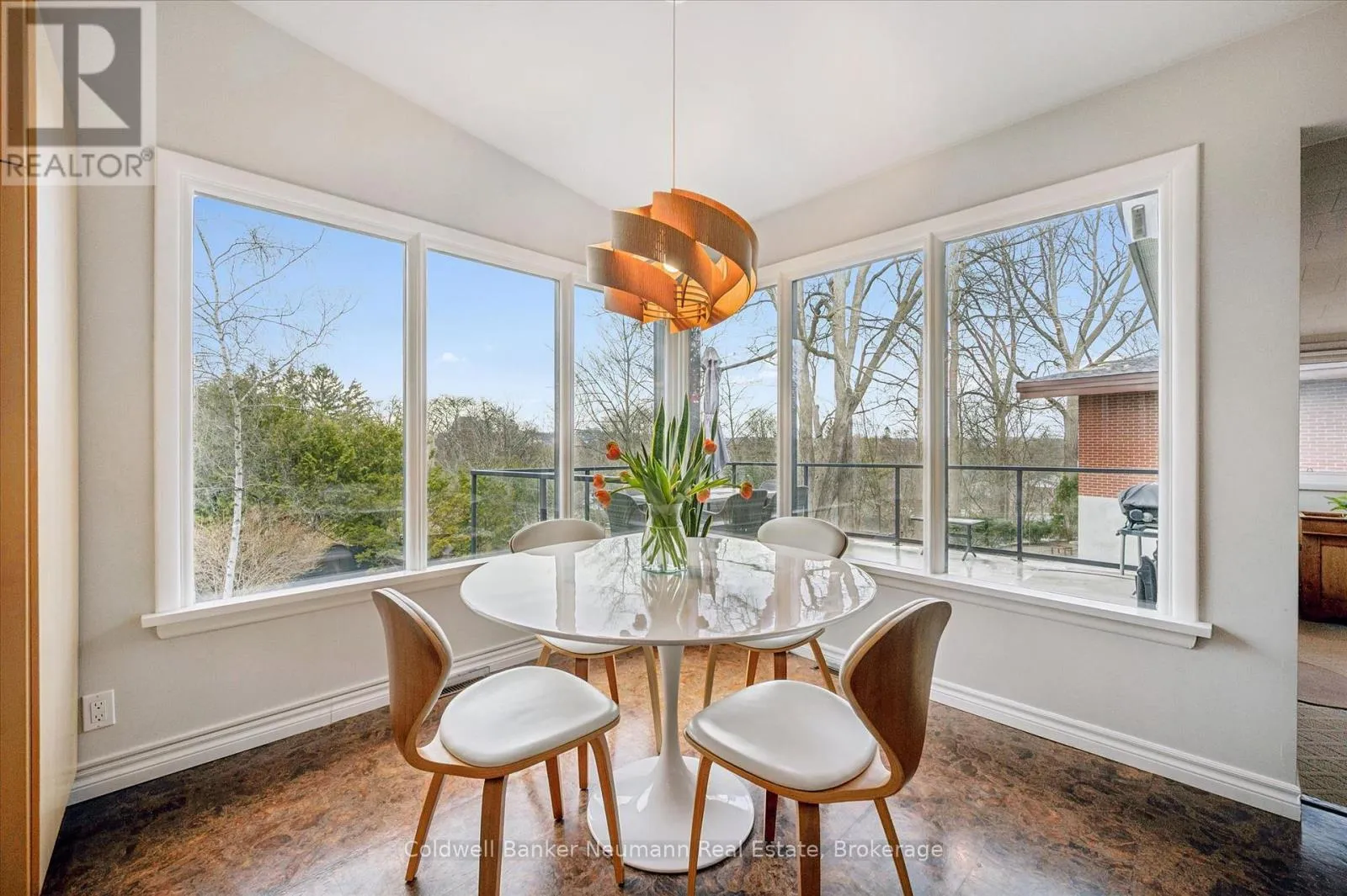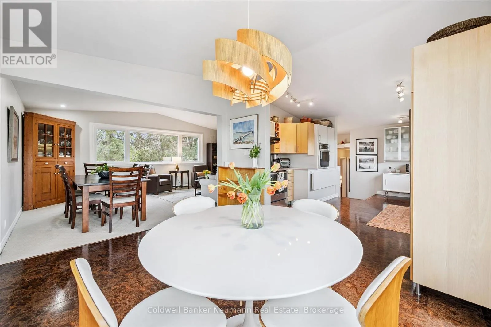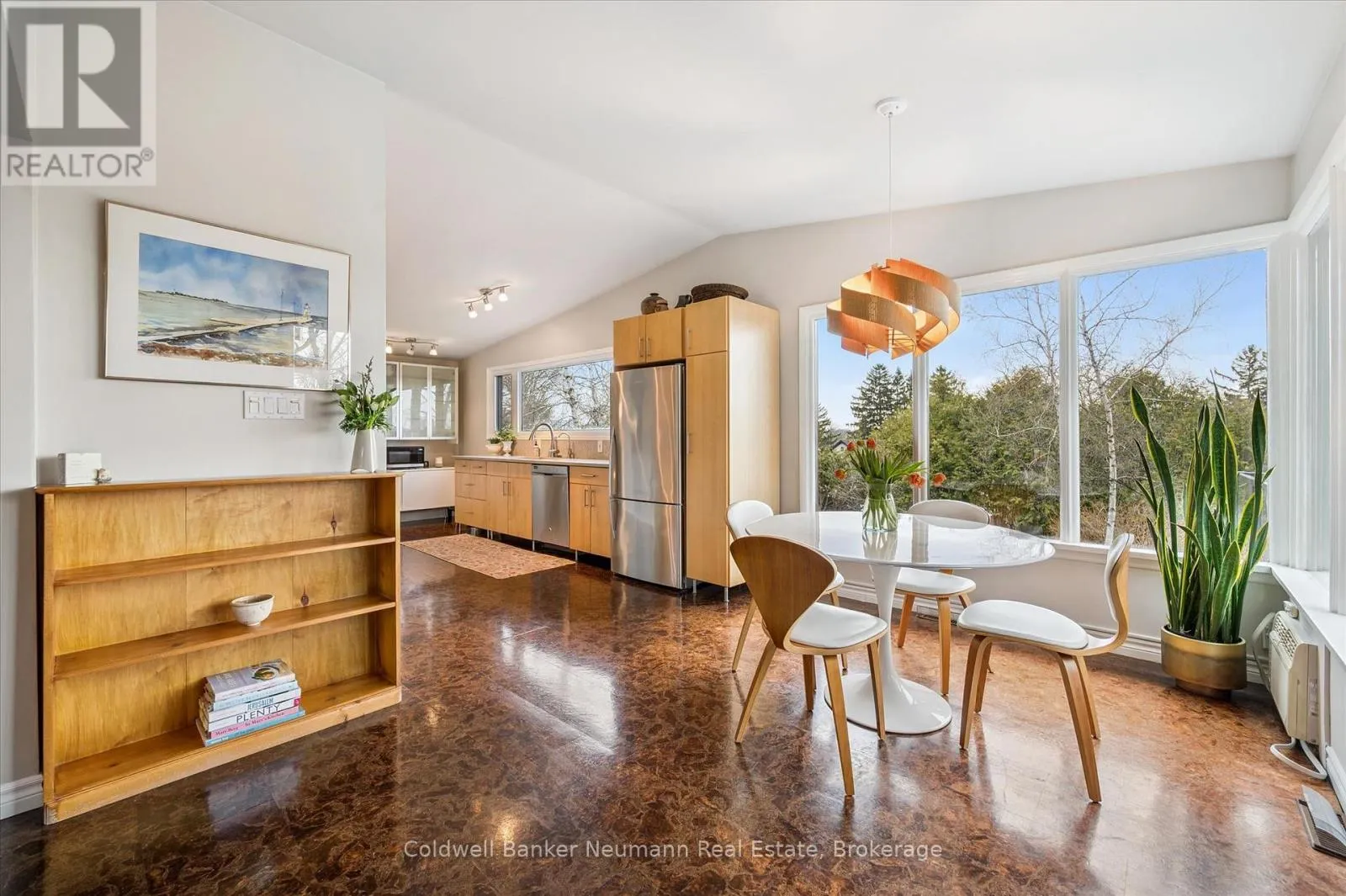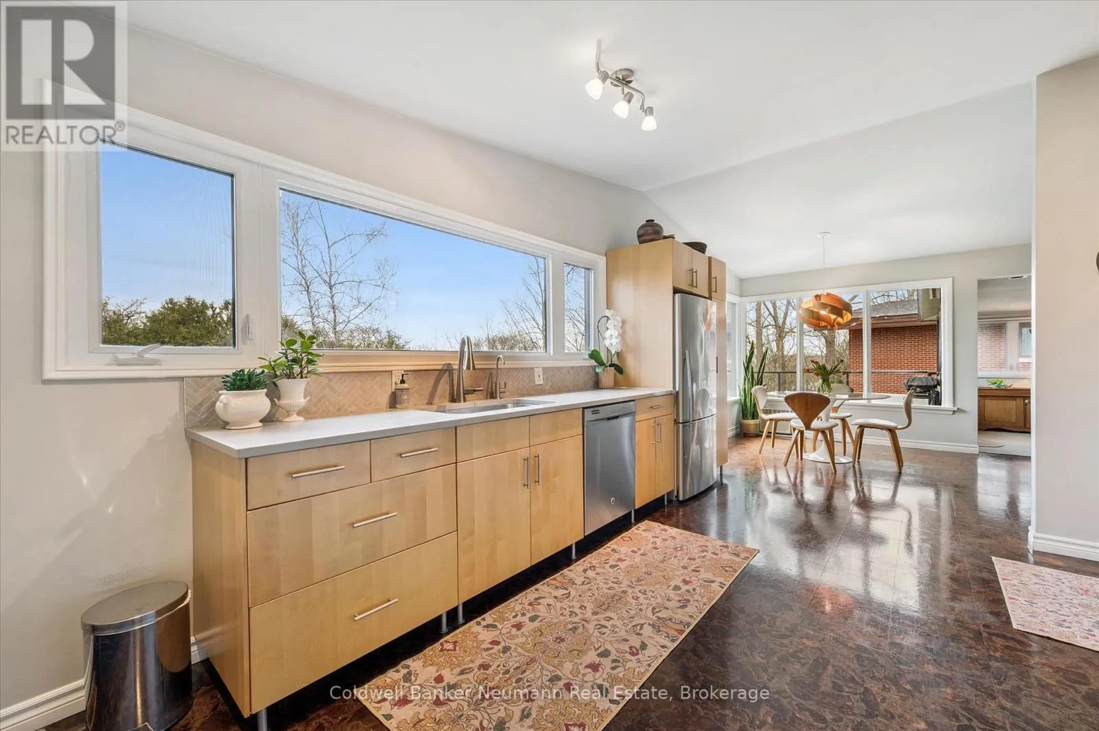 Cross Streets: Gordon at Dean. ** Directions: Gordon to Dean to Harcourt. Welcome to this architectural gem, nestled in Guelph's coveted Old University neighbourhood. This mid-century modern home commands panoramic views of downtown Guelph, proudly perched atop Gordon Street hill.Upon entry, a striking corner fireplace pays homage to classic mid-century design, immediately setting the tone for the home's timeless character and warmth. Thoughtfully designed for both everyday living and effortless entertaining, the home features an open-concept kitchen with an eat-in dining area framed by floor-to-ceiling windows overlooking the private backyard. This space flows smoothly into a sunlit living and dining room, where expansive front-facing views create an inviting atmosphere-ideal for hosting and relaxing. Adjacent to the kitchen, a beautifully appointed TV room is surrounded by windows on three sides, immersing the space in natural light and offering direct access to the deck. This private outdoor retreat overlooks the meticulously manicured yard and faces west-delivering unobstructed views and sunsets, all year-round.The primary bedroom enjoys peaceful views over the front yard, while the second bedroom overlooks the lush backyard. Both rooms feature generous built-in storage and ample closet space accompanied by a well-appointed four-piece bathroom. The lower-level walkout features a third bedroom which provides flexibility for growing families or guests, complemented by a three-piece bathroom. Additionally, there is a versatile space offering both an office and guest sleeping quarters. This walkout level connects seamlessly to the backyard and includes a mudroom with access to the laundry area and garage, offering both functionality and convenience. The backyard is exceptional, showcasing mature evergreens and meticulously maintained garden beds within a fully fenced setting. Lovingly maintained and thoughtfully cared for, this is a once-in-a-lifetime opportunity to own a distinctive piece of Guelph's architectural heritage. (id:27476)