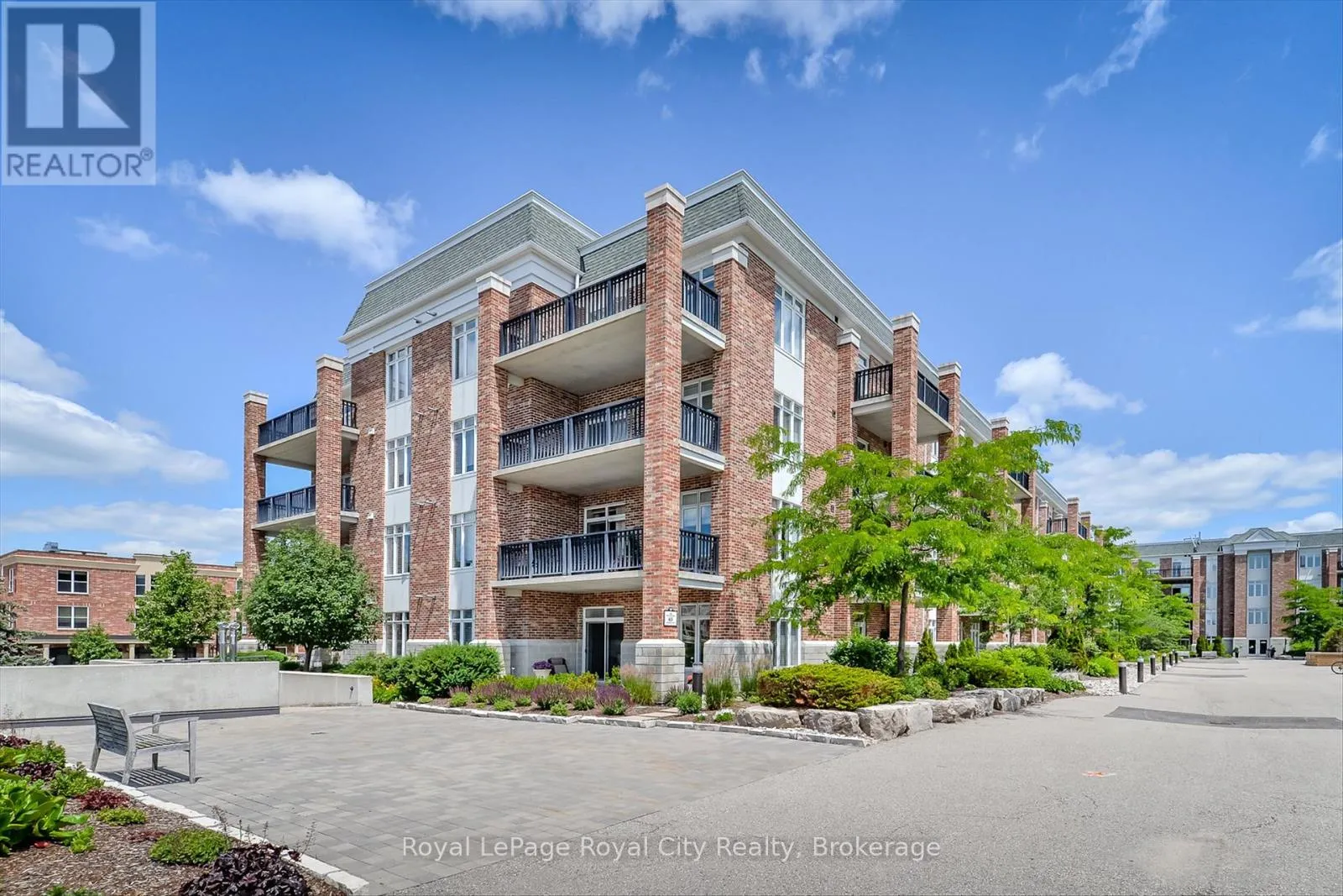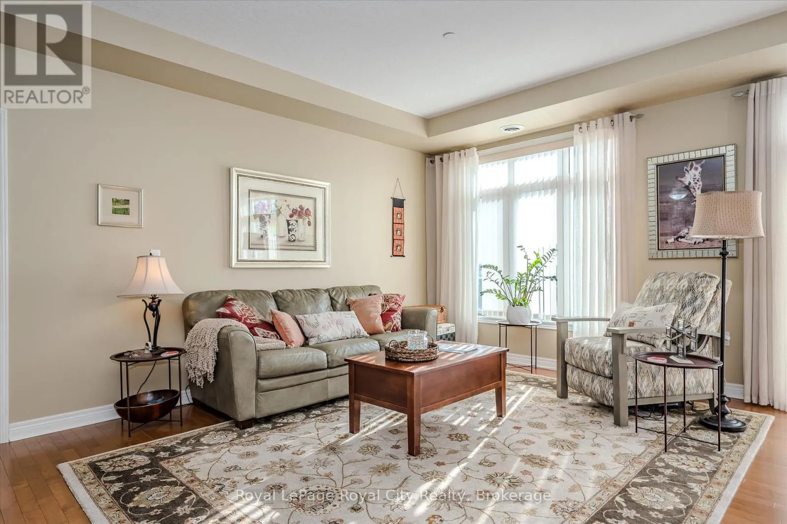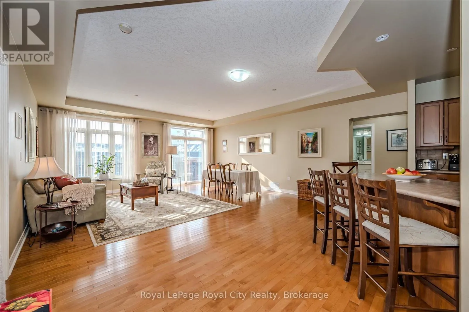Cross Streets: Stone and Village Green. ** Directions: Village Green Drive to Bayberry Drive. Welcome to the Wellington Suites at the Village by the Arboretum, a premier 55+ community in the heart of Guelph, thoughtfully designed with retirement living in mind. This spacious 1,354 square foot suite offers an exceptional lifestyle in one of the city's most unique and vibrant communities. Featuring two generously sized bedrooms, including a primary suite complete with a walk-in closet and a private three-piece ensuite with a convenient step-in shower. A second full four-piece bathroom provides comfort and flexibility for guests or visiting family. The open-concept kitchen is equipped with a breakfast bar and flows seamlessly into the bright and inviting living room, which is bathed in natural light from large windows and features sliding doors that lead to a private south-facing balcony overlooking the serene courtyard. Additional highlights include beautiful hardwood flooring throughout the main living area, an in-suite laundry room, and a bonus room that can serve as a home office, pantry, or extra storage space. A large storage locker adds to the practicality, while the exclusively owned underground parking space located right next to the elevator provides ease of access directly to the fourth floor. Life at the Village is about so much more than just your home - it's about living well every day. This exceptional adult community offers an impressive community canter, with amenities designed for connection, wellness, and fun. Residents enjoy access to an indoor pool, hot tub, sauna, tennis courts, putting greens, and a billiards room. The Village Centre also hosts over 100 hobby and interest groups, along with fitness classes, social clubs, and community events. Plus, everyday convenience is right at your doorstep with on-site services including a pharmacy, doctors office, and LifeLabs. The Village isn't just a place to live - its a lifestyle in one of Guelphs most sought-after adult communities. (id:27476)