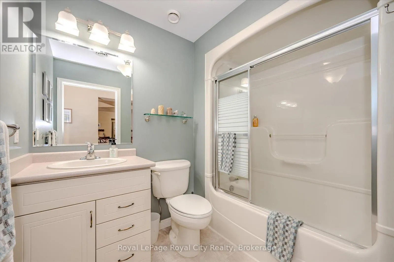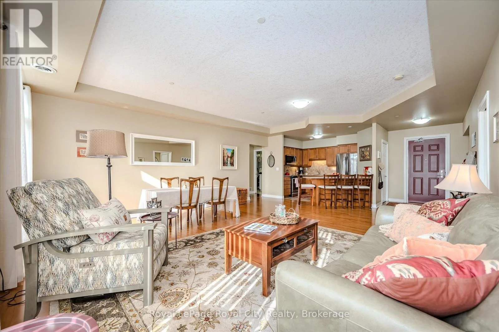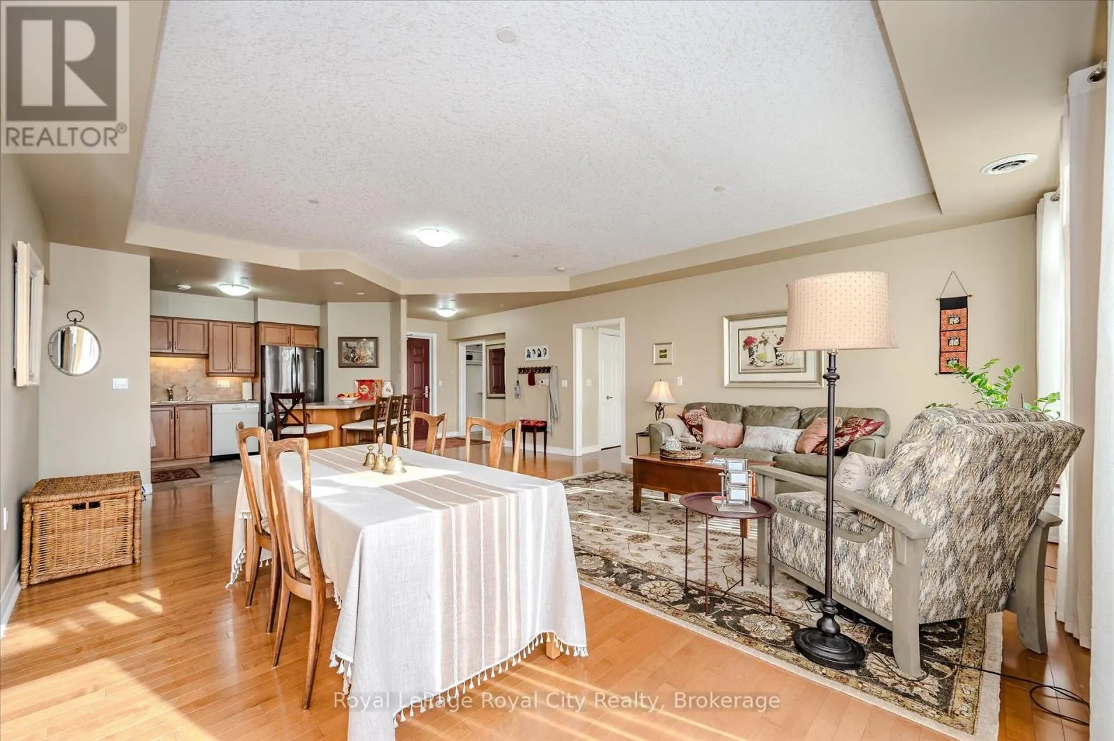 Cross Streets: Stone and Village Green. ** Directions: Village Green Drive to Bayberry Drive. Welcome to the Wellington Suites at the Village by the Arboretum, a premier 55+ community in the heart of Guelph, thoughtfully designed with retirement living in mind. This spacious 1,354 square foot suite offers an exceptional lifestyle in one of the city's most unique and vibrant communities. Featuring two generously sized bedrooms, including a primary suite complete with a walk-in closet and a private three-piece ensuite with a convenient step-in shower. A second full four-piece bathroom provides comfort and flexibility for guests or visiting family. The open-concept kitchen is equipped with a breakfast bar and flows seamlessly into the bright and inviting living room, which is bathed in natural light from large windows and features sliding doors that lead to a private south-facing balcony overlooking the serene courtyard. Additional highlights include beautiful hardwood flooring throughout the main living area, an in-suite laundry room, and a bonus room that can serve as a home office, pantry, or extra storage space. A large storage locker adds to the practicality, while the exclusively owned underground parking space located right next to the elevator provides ease of access directly to the fourth floor. Life at the Village is about so much more than just your home - it's about living well every day. This exceptional adult community offers an impressive community canter, with amenities designed for connection, wellness, and fun. Residents enjoy access to an indoor pool, hot tub, sauna, tennis courts, putting greens, and a billiards room. The Village Centre also hosts over 100 hobby and interest groups, along with fitness classes, social clubs, and community events. Plus, everyday convenience is right at your doorstep with on-site services including a pharmacy, doctors office, and LifeLabs. The Village isn't just a place to live - its a lifestyle in one of Guelphs most sought-after adult communities. (id:27476)