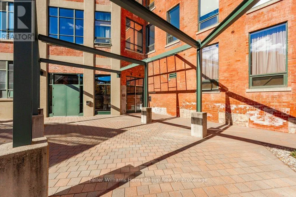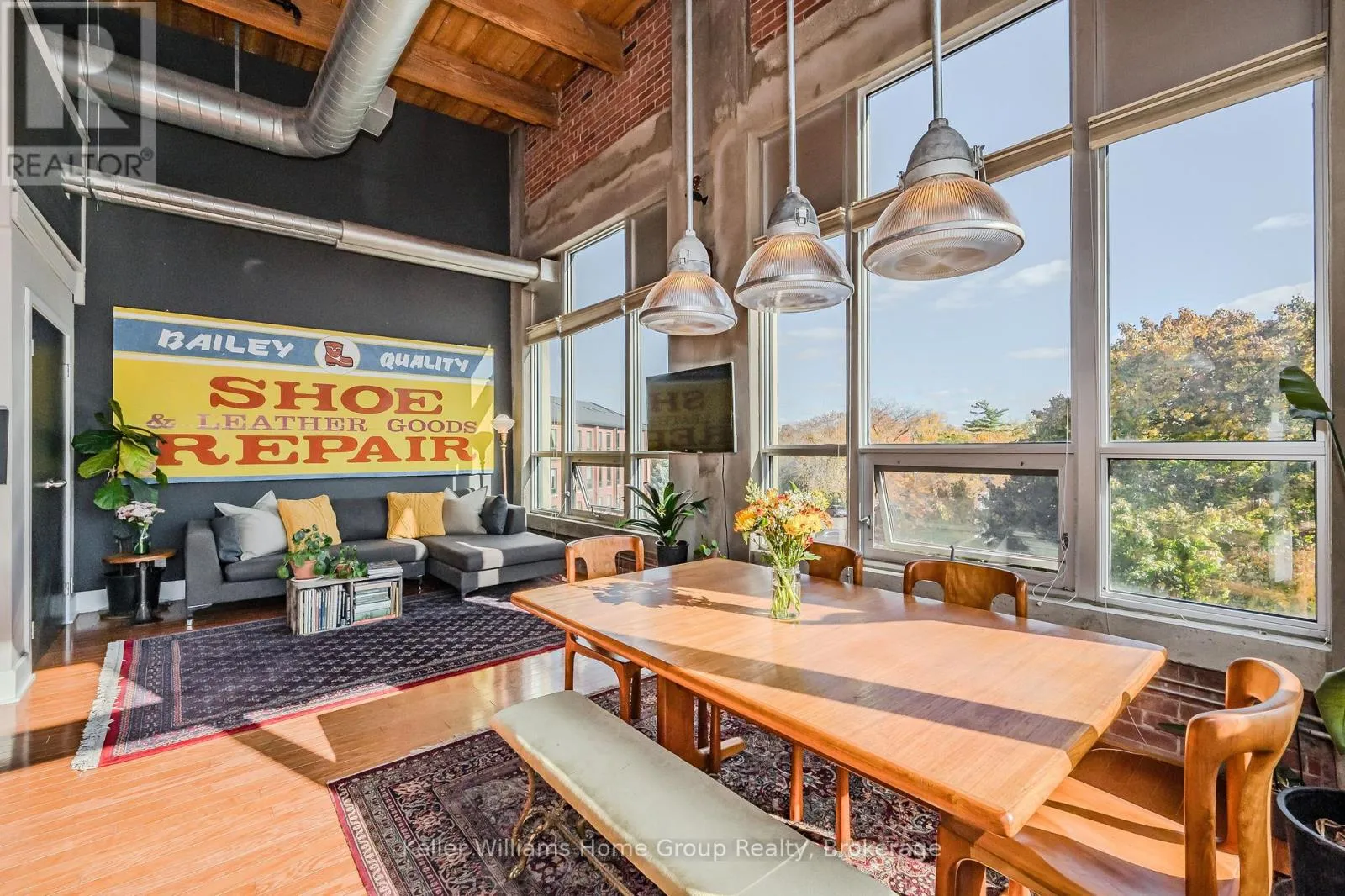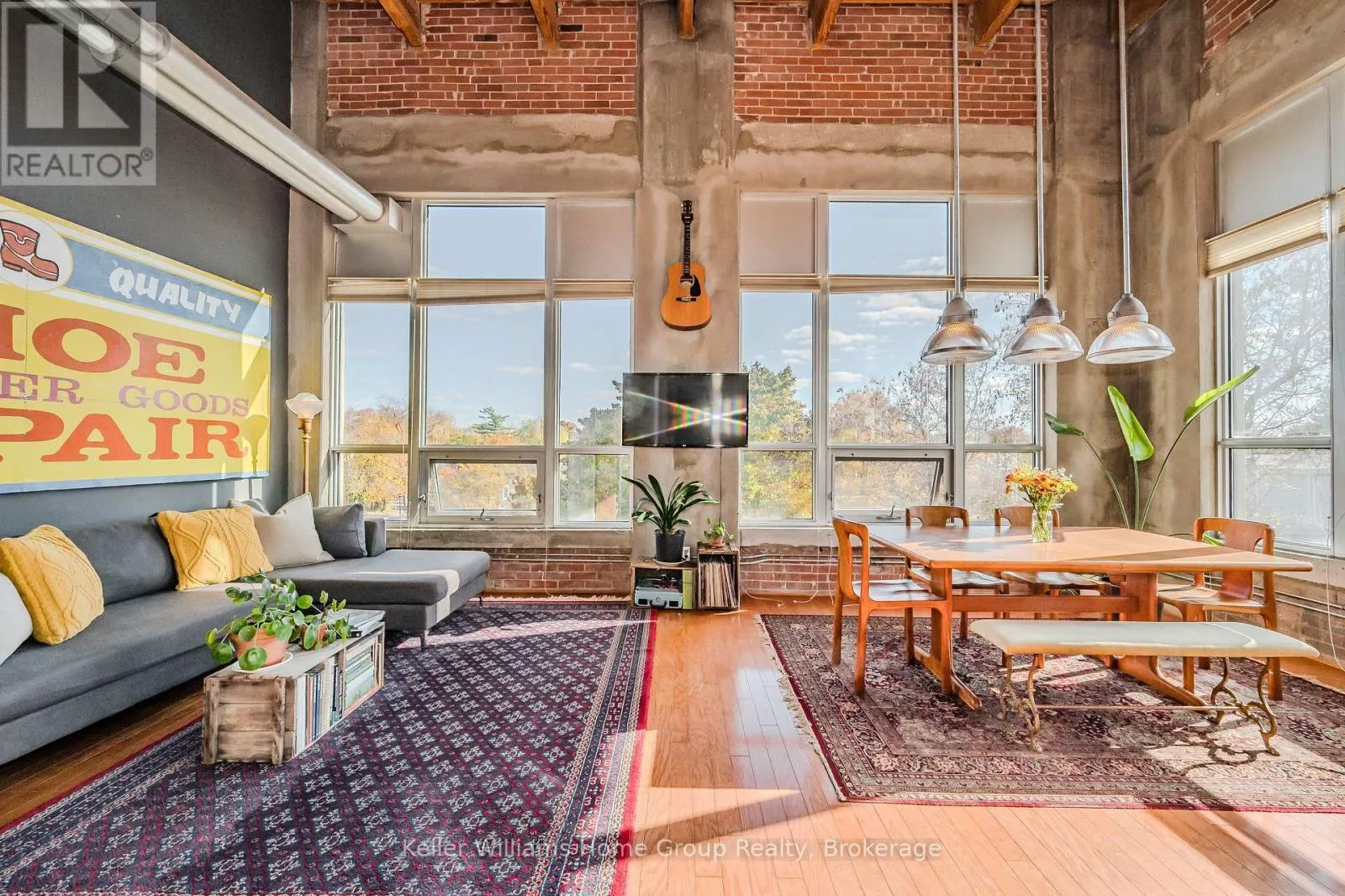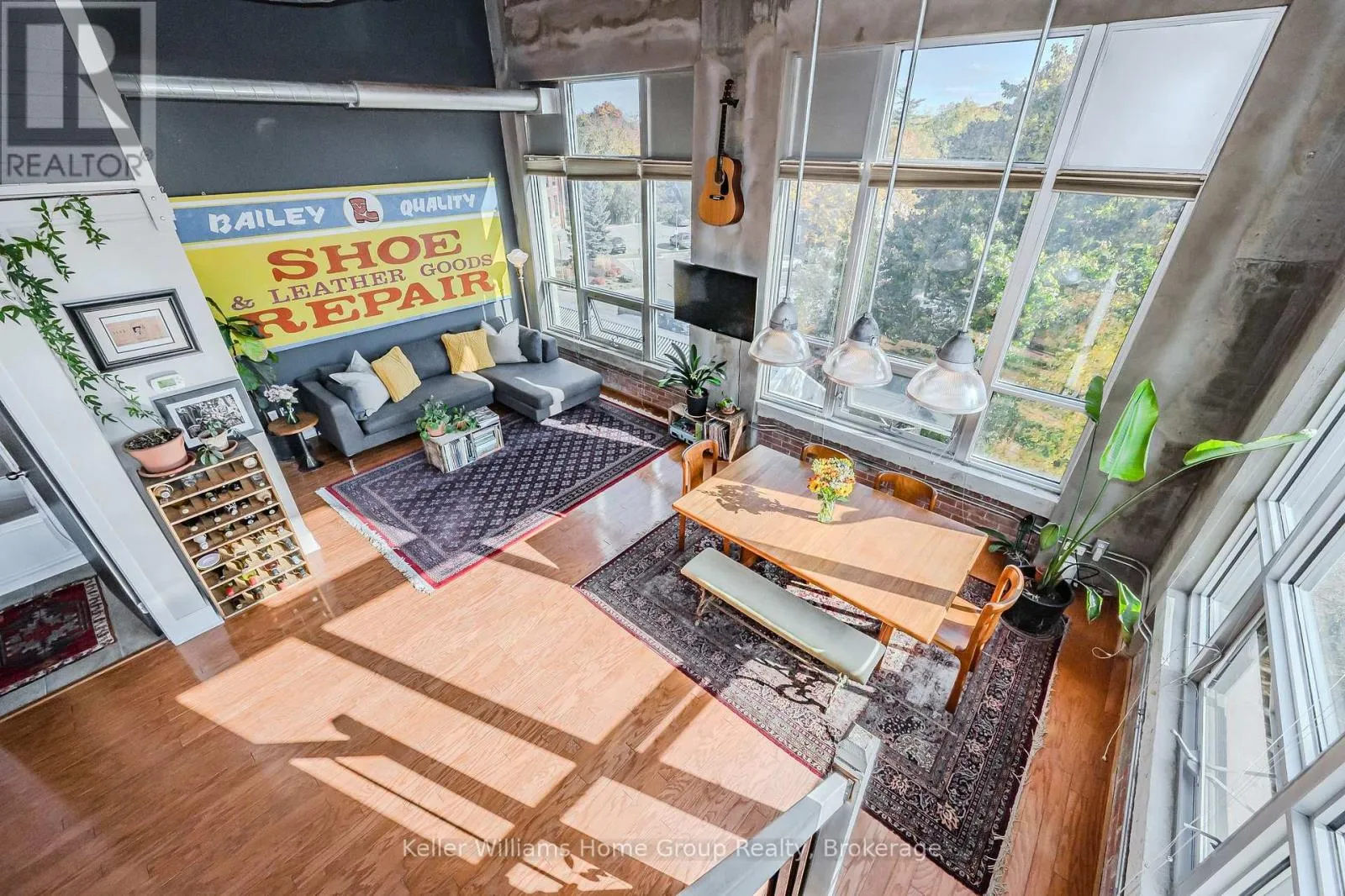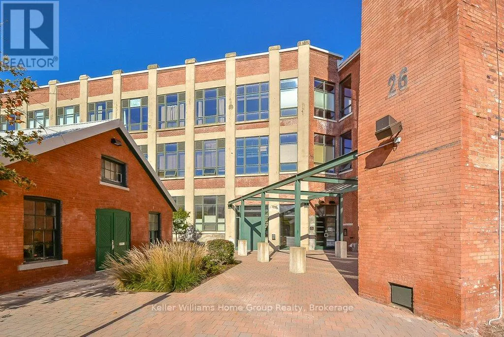 Cross Streets: Located within The Mill Lofts at 26 Ontario Street between Arthur Street and Neeve Street. Park in Visitor Parking. ** Directions: Wellington to Neeve, Neeve to Ontario St, Park in Visitiors at 26 Ontario St. Show Stopping Corner Loft in the Iconic Guelph Mill Lofts. Welcome to this stunning, move in ready loft in the highly sought after Guelph Mill, a beautifully restored 1904 spinning factory rich in history and character. Located in the vibrant St. Patrick's Ward, this top floor corner unit offers a rare blend of industrial charm and modern living just a short walk from downtown Guelph. Enjoy easy access to local amenities, including the River Run Performing Arts Centre, farmers market, Sleeman Centre, outdoor skating rink at City Hall, the GO Station, scenic river trails, charming cafés, and Standing Room Only, Canada's smallest bar. Inside, you will be captivated by soaring 18 foot ceilings, exposed wood beams, and striking brick walls that highlight the building's heritage. The open concept layout features hardwood floors and oversized windows that fill the space with natural light while offering sweeping city views, including both sunrise and sunset. The bright eat in kitchen offers ample cupboard and counter space, ideal for everyday living or entertaining. Upstairs, the spacious loft style bedroom provides a private retreat with a dedicated office or flexible space. The large 4 piece bathroom includes a granite countertop and basin sink, while in suite laundry is conveniently tucked away. Vintage lighting from the 1920s completes the industrial aesthetic. Unit #302 stands out for its natural light, flexible layout, and impressive views. Additional features include a basement locker, dedicated parking near the entrance, and access to a separate party building for hosting. Condo fees include all utilities except electricity, making budgeting simple. Do not miss your chance to own this exceptional loft in one of Guelph's most iconic buildings. Book your private showing today. (id:27476)