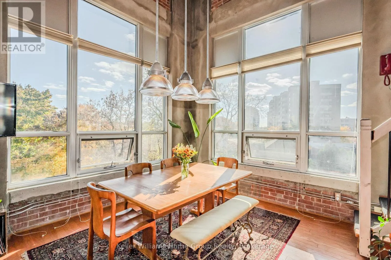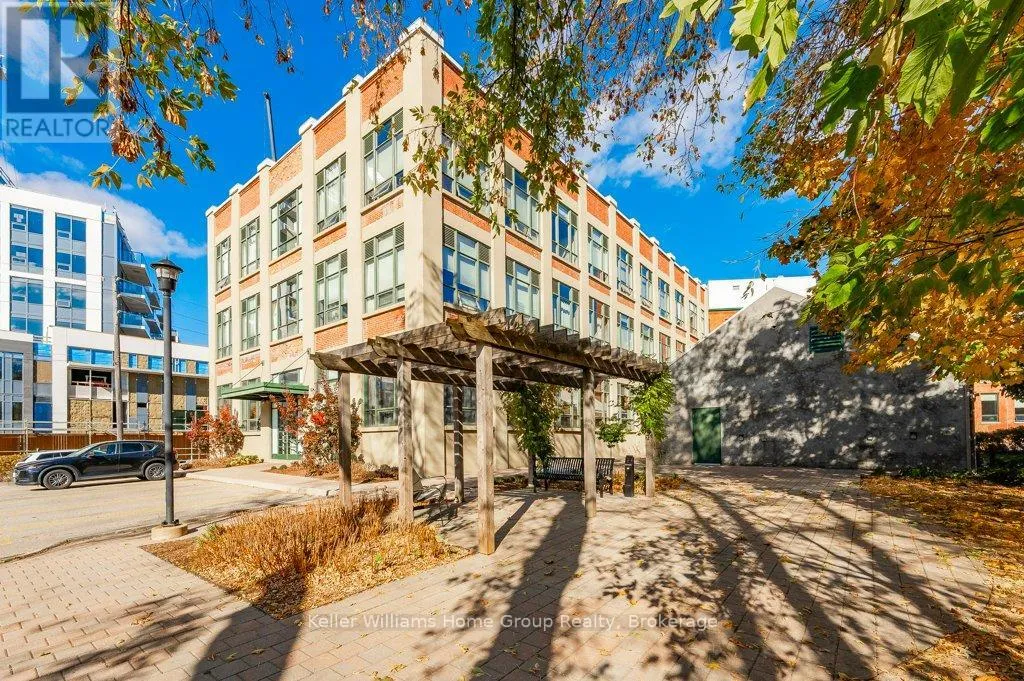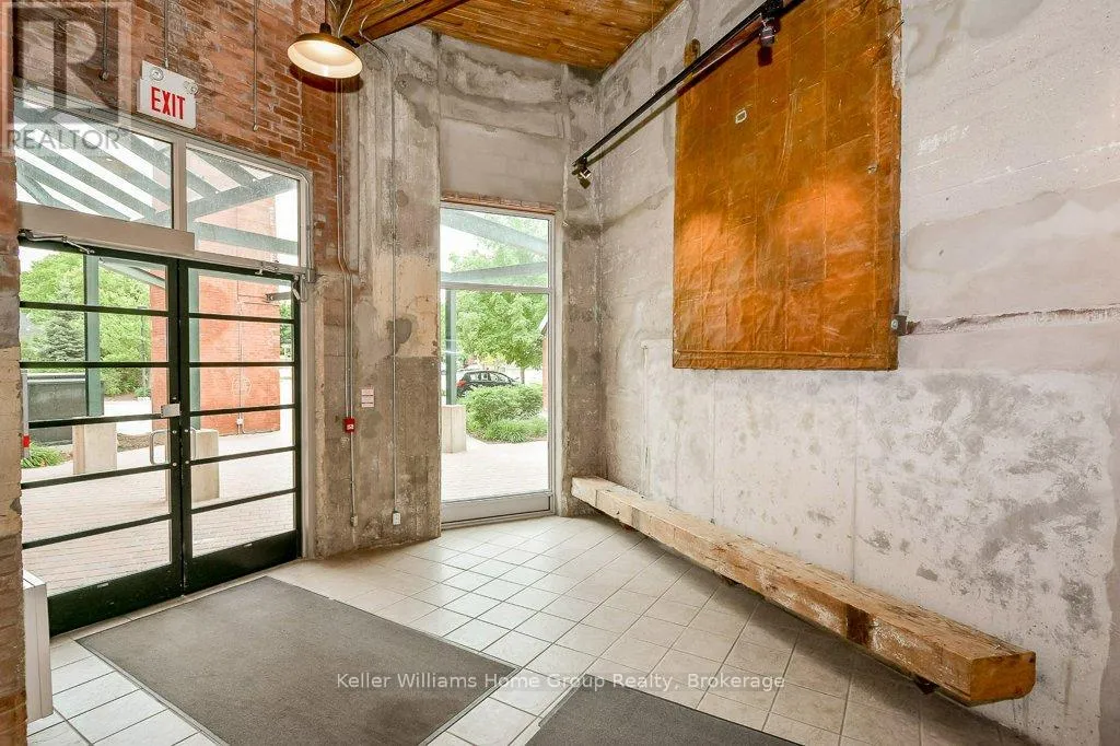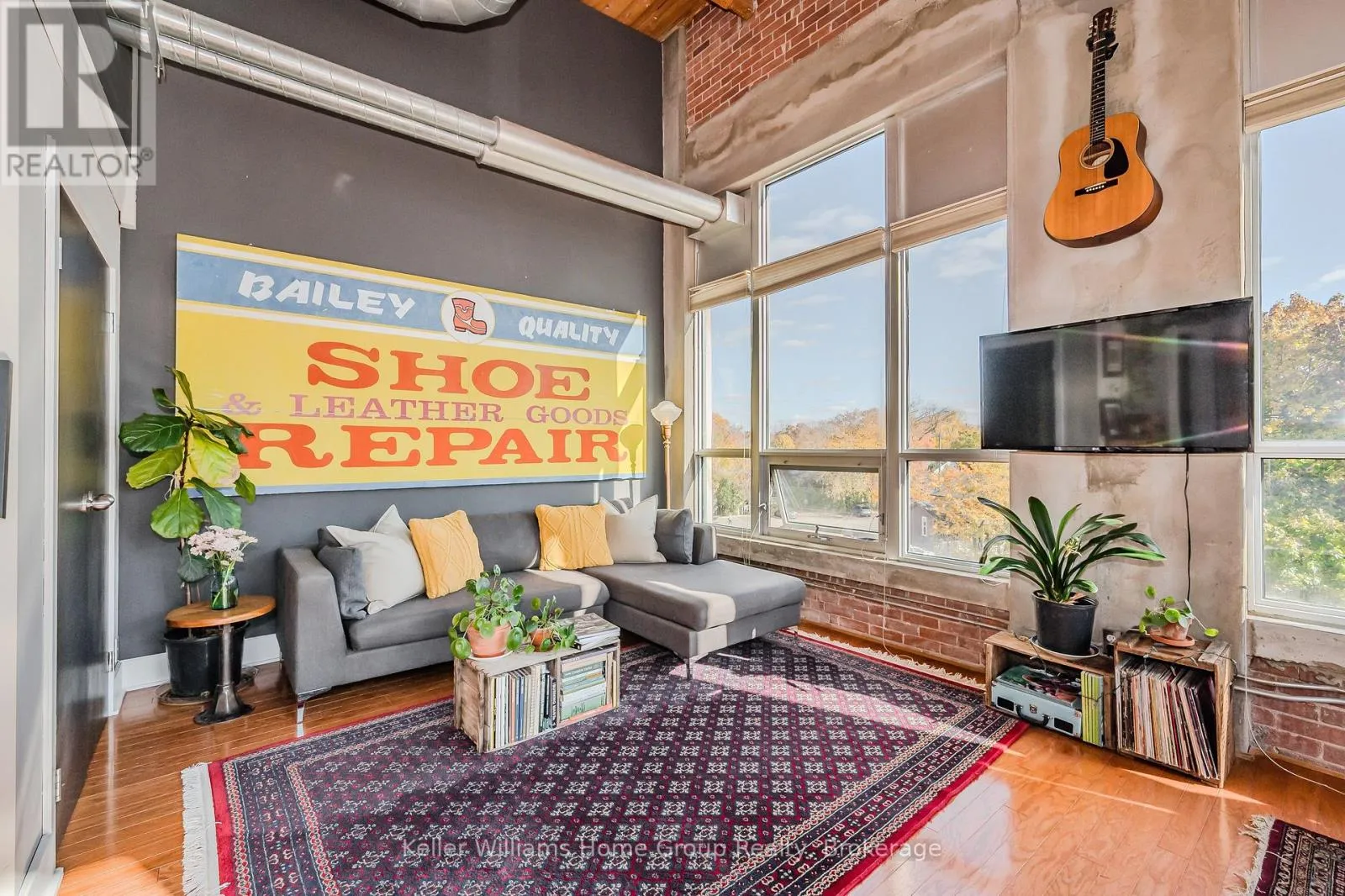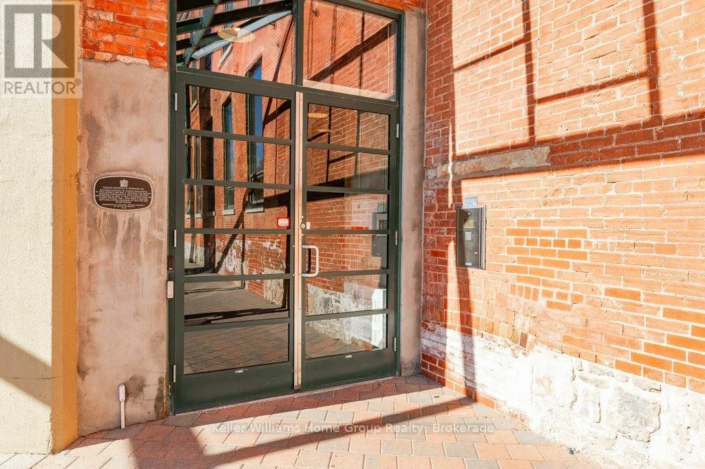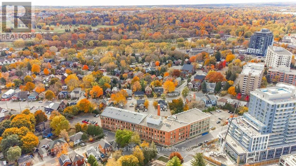 Cross Streets: Located within The Mill Lofts at 26 Ontario Street between Arthur Street and Neeve Street. Park in Visitor Parking. ** Directions: Wellington to Neeve, Neeve to Ontario St, Park in Visitiors at 26 Ontario St. Show Stopping Corner Loft in the Iconic Guelph Mill Lofts. Welcome to this stunning, move in ready loft in the highly sought after Guelph Mill, a beautifully restored 1904 spinning factory rich in history and character. Located in the vibrant St. Patrick's Ward, this top floor corner unit offers a rare blend of industrial charm and modern living just a short walk from downtown Guelph. Enjoy easy access to local amenities, including the River Run Performing Arts Centre, farmers market, Sleeman Centre, outdoor skating rink at City Hall, the GO Station, scenic river trails, charming cafés, and Standing Room Only, Canada's smallest bar. Inside, you will be captivated by soaring 18 foot ceilings, exposed wood beams, and striking brick walls that highlight the building's heritage. The open concept layout features hardwood floors and oversized windows that fill the space with natural light while offering sweeping city views, including both sunrise and sunset. The bright eat in kitchen offers ample cupboard and counter space, ideal for everyday living or entertaining. Upstairs, the spacious loft style bedroom provides a private retreat with a dedicated office or flexible space. The large 4 piece bathroom includes a granite countertop and basin sink, while in suite laundry is conveniently tucked away. Vintage lighting from the 1920s completes the industrial aesthetic. Unit #302 stands out for its natural light, flexible layout, and impressive views. Additional features include a basement locker, dedicated parking near the entrance, and access to a separate party building for hosting. Condo fees include all utilities except electricity, making budgeting simple. Do not miss your chance to own this exceptional loft in one of Guelph's most iconic buildings. Book your private showing today. (id:27476)