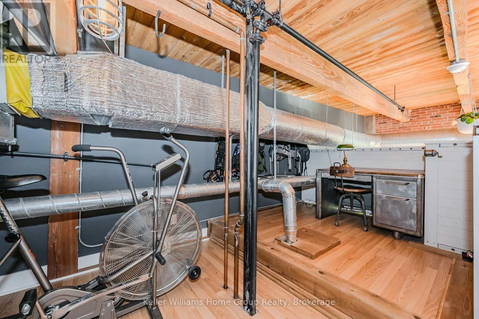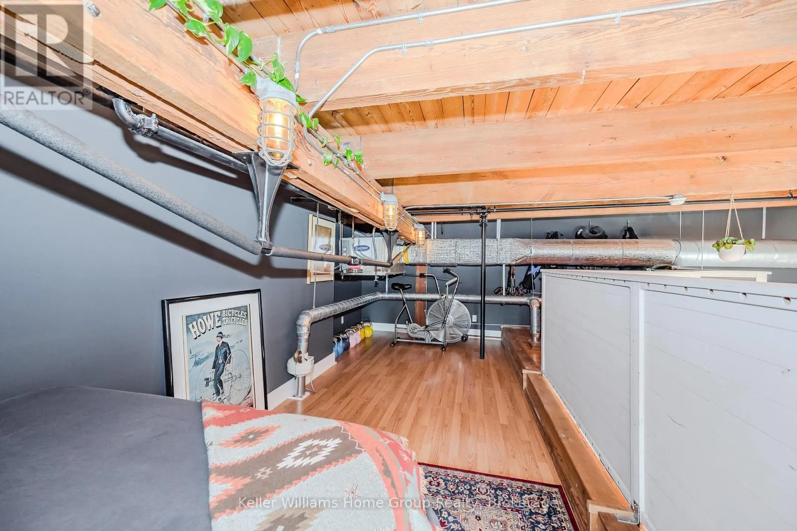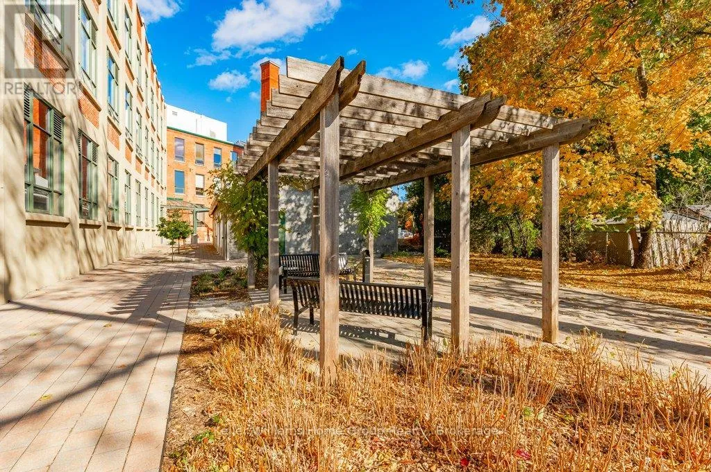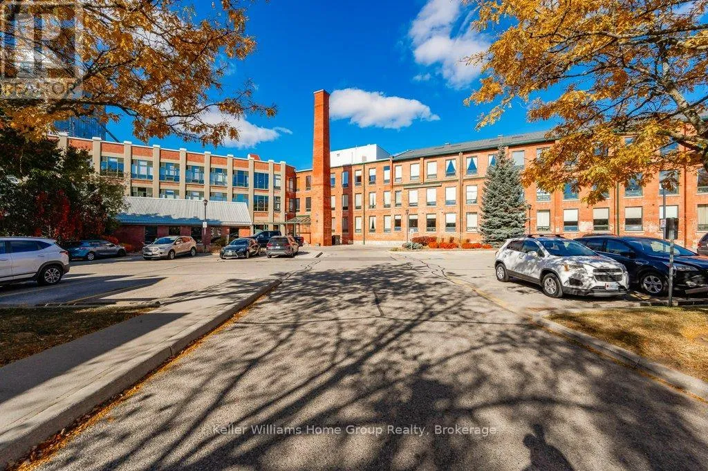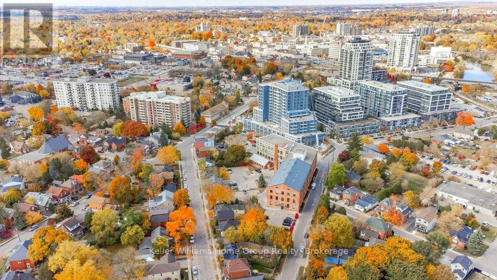Cross Streets: Located within The Mill Lofts at 26 Ontario Street between Arthur Street and Neeve Street. Park in Visitor Parking. ** Directions: Wellington to Neeve, Neeve to Ontario St, Park in Visitiors at 26 Ontario St. Show Stopping Corner Loft in the Iconic Guelph Mill Lofts. Welcome to this stunning, move in ready loft in the highly sought after Guelph Mill, a beautifully restored 1904 spinning factory rich in history and character. Located in the vibrant St. Patrick's Ward, this top floor corner unit offers a rare blend of industrial charm and modern living just a short walk from downtown Guelph. Enjoy easy access to local amenities, including the River Run Performing Arts Centre, farmers market, Sleeman Centre, outdoor skating rink at City Hall, the GO Station, scenic river trails, charming cafés, and Standing Room Only, Canada's smallest bar. Inside, you will be captivated by soaring 18 foot ceilings, exposed wood beams, and striking brick walls that highlight the building's heritage. The open concept layout features hardwood floors and oversized windows that fill the space with natural light while offering sweeping city views, including both sunrise and sunset. The bright eat in kitchen offers ample cupboard and counter space, ideal for everyday living or entertaining. Upstairs, the spacious loft style bedroom provides a private retreat with a dedicated office or flexible space. The large 4 piece bathroom includes a granite countertop and basin sink, while in suite laundry is conveniently tucked away. Vintage lighting from the 1920s completes the industrial aesthetic. Unit #302 stands out for its natural light, flexible layout, and impressive views. Additional features include a basement locker, dedicated parking near the entrance, and access to a separate party building for hosting. Condo fees include all utilities except electricity, making budgeting simple. Do not miss your chance to own this exceptional loft in one of Guelph's most iconic buildings. Book your private showing today. (id:27476)