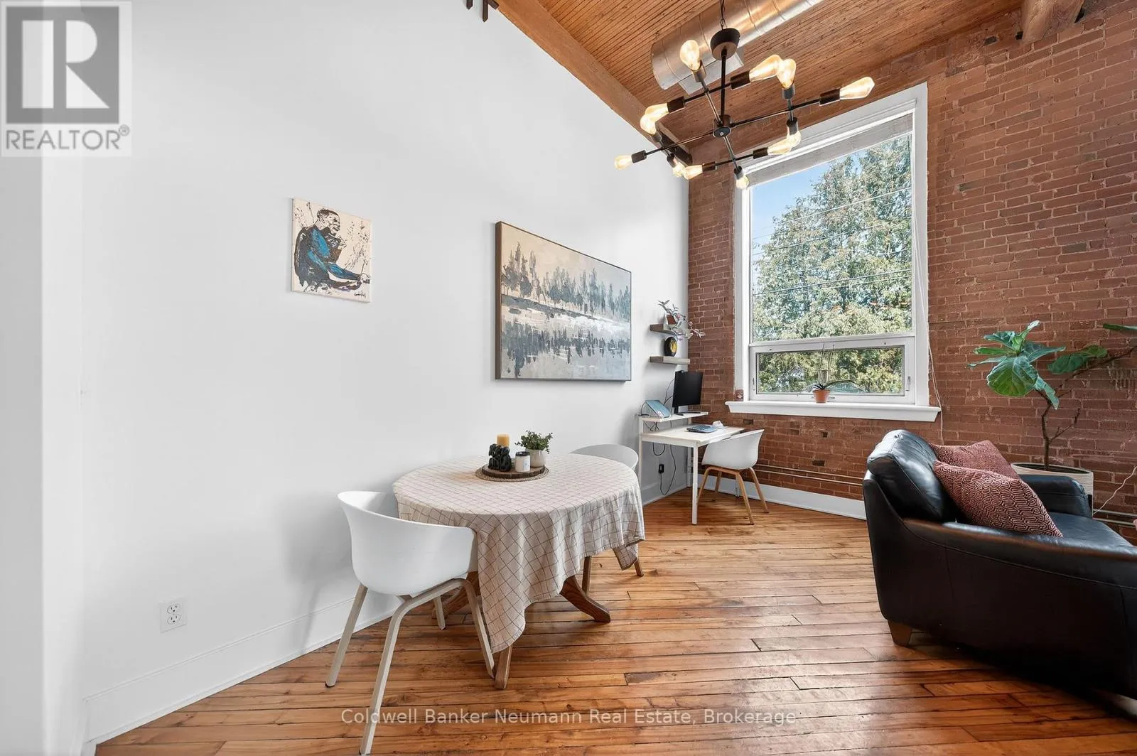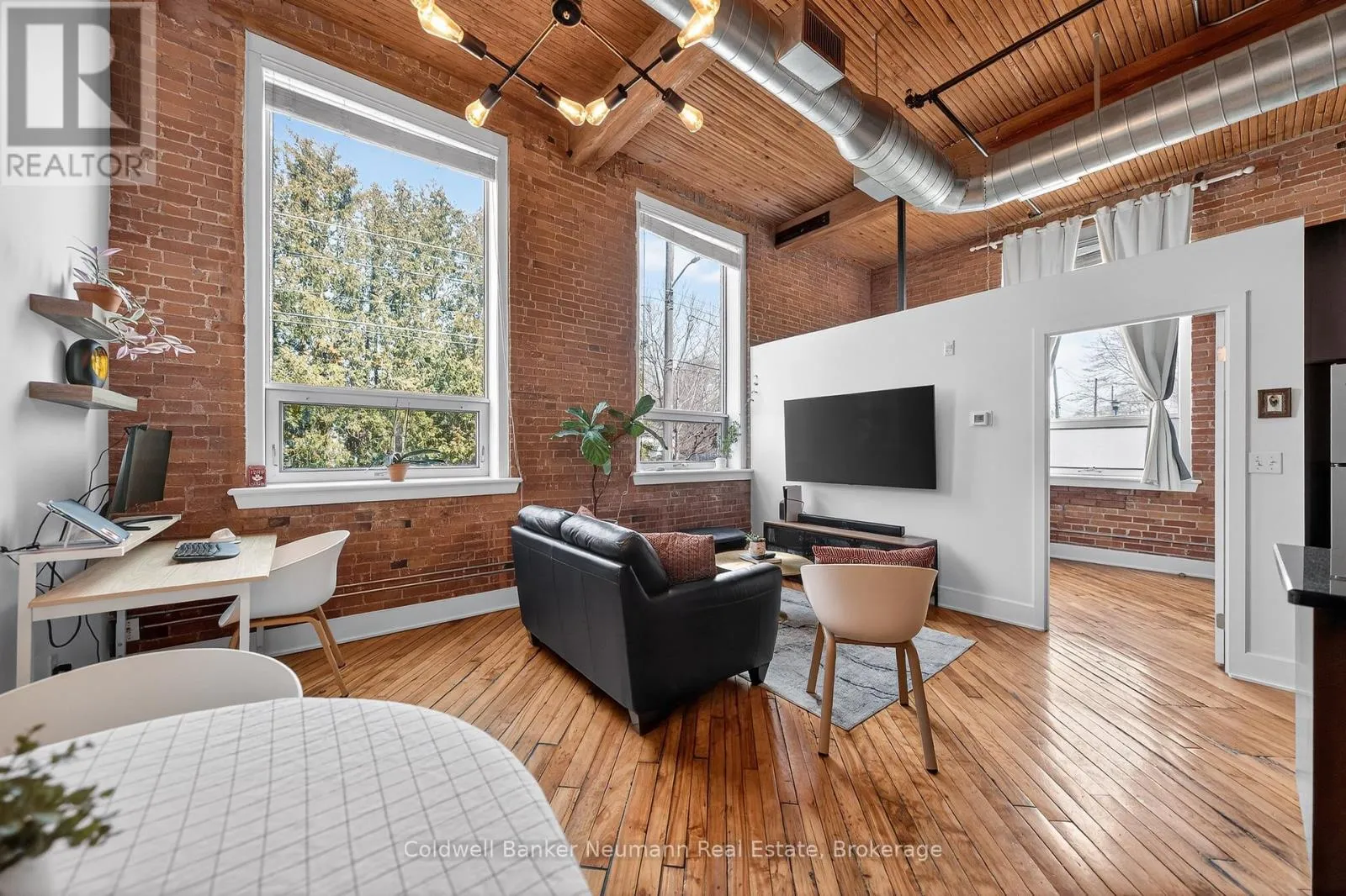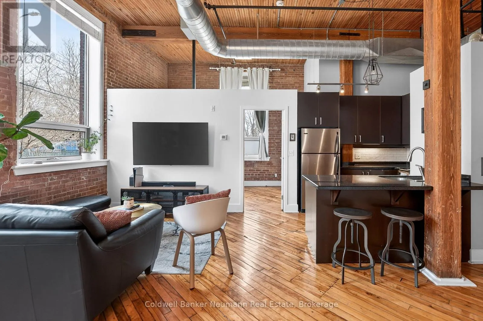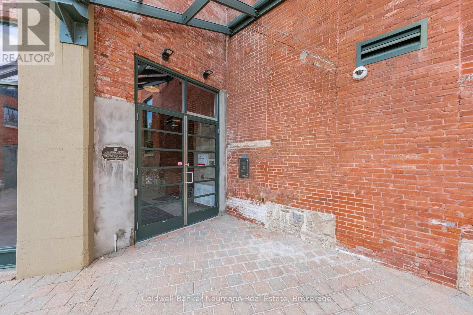 Cross Streets: Cross St & Arthur St S. ** Directions: Wellington - Neeve - Ontario. Authentic loft living in the heart of Guelph. Located in the highly desirable Mill Lofts, this corner unit is a one-bedroom, one-bathroom. it showcases the timeless appeal of true industrial design paired with thoughtful modern updates.Rich exposed brick walls set the tone throughout the space, adding warmth, texture, and undeniable character you simply won't find in newer builds. The open-concept layout is complemented by high ceilings and oversized windows, creating a bright and inviting atmosphere.The professionally remodeled bathroom by Urban Uplift, delivers a fresh, contemporary feel with updated finishes designed for everyday comfort.The kitchen flows seamlessly into the living area, making it ideal for both relaxed living and entertaining. Includes one dedicated parking space and storage locker for added convenience. Every corner of this unit reflects a balance of historic charm and practical functionality.Set in one of Guelph's most vibrant neighbourhoods, you're just steps to the GO Station, downtown amenities, and scenic trails along the Speed River-perfect for those who value both convenience and lifestyle. (id:27476)