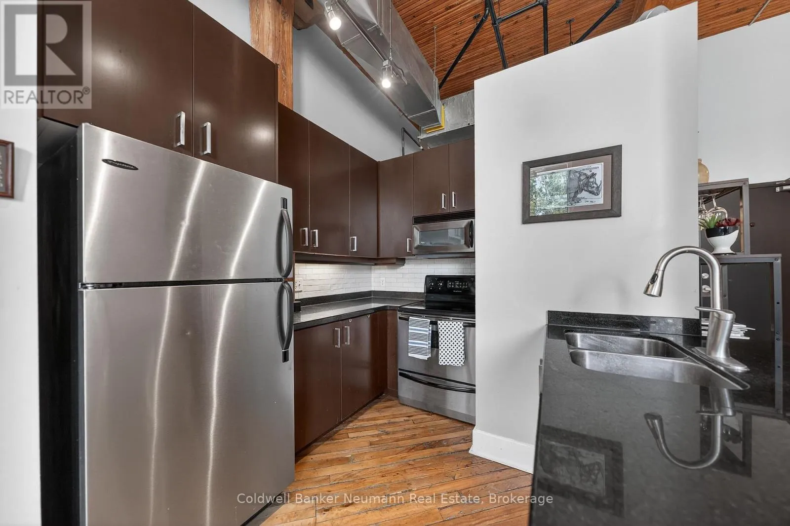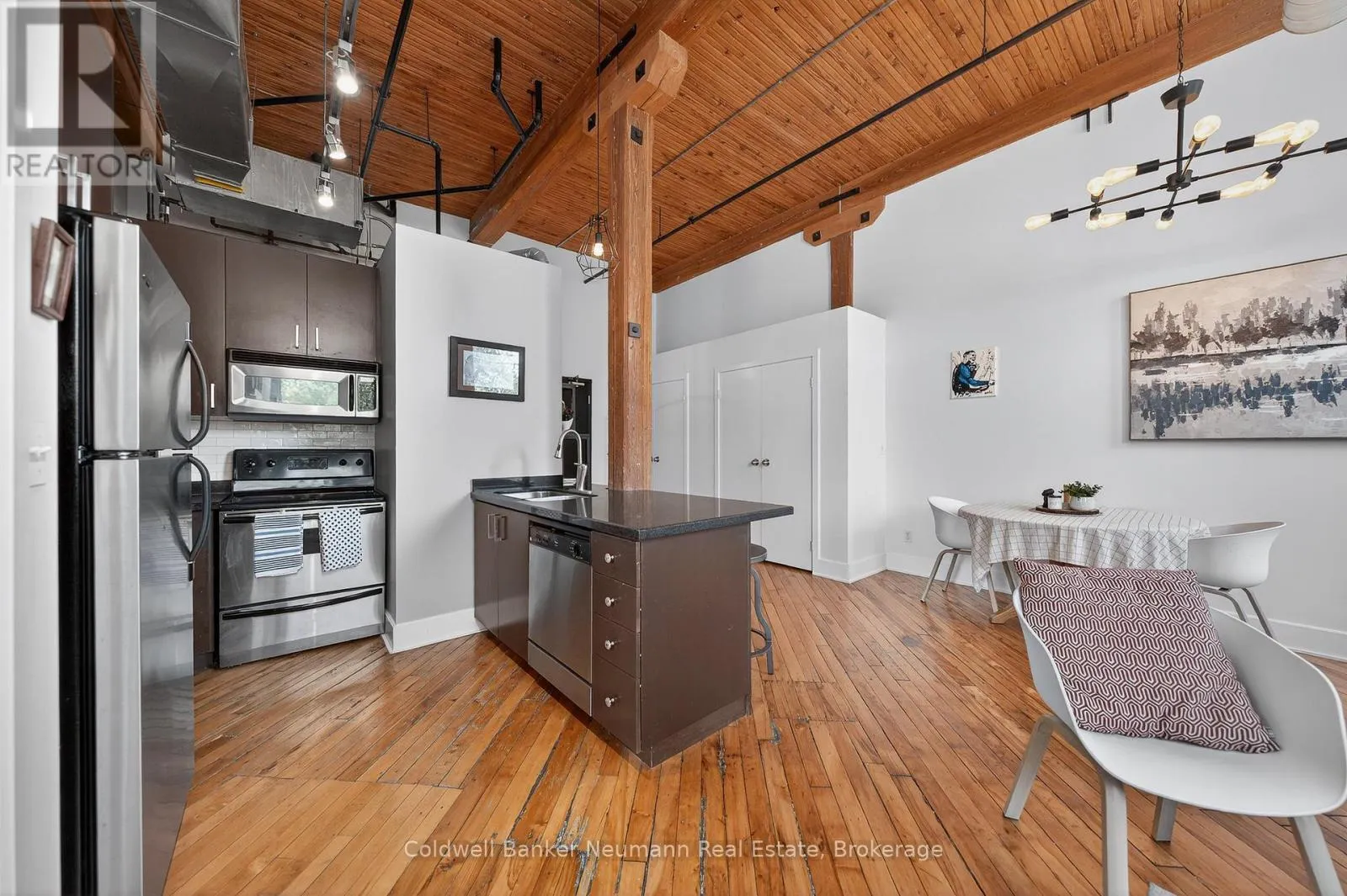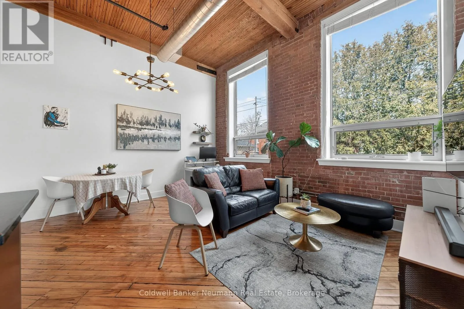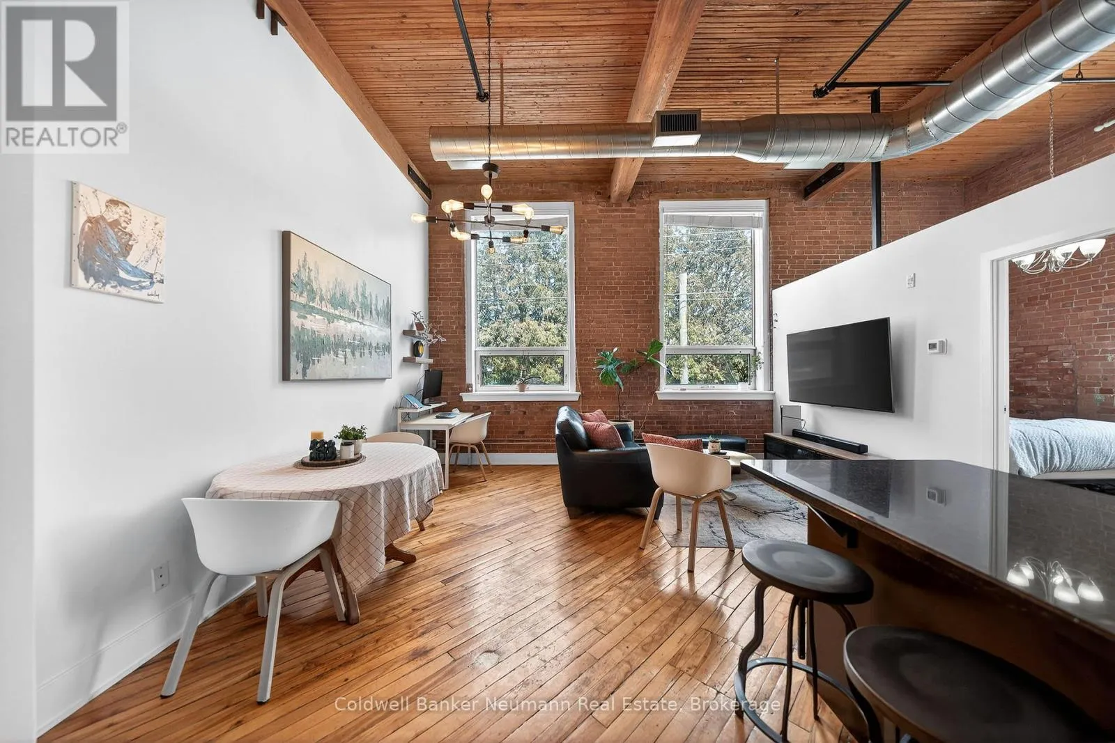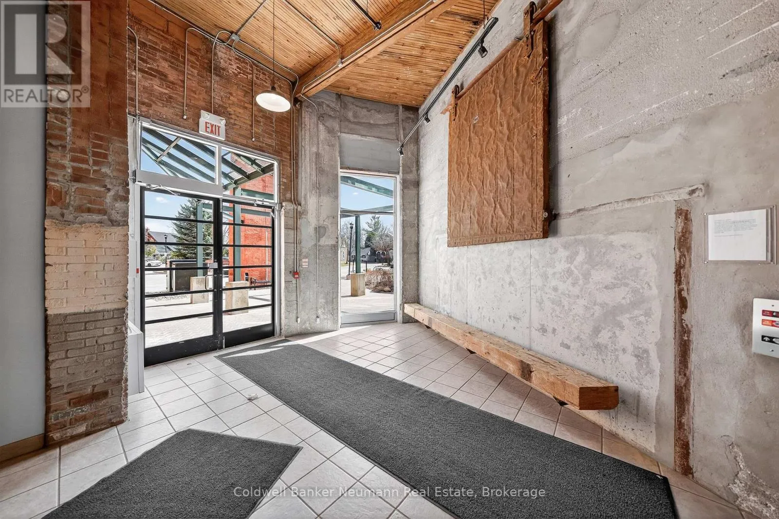 Cross Streets: Cross St & Arthur St S. ** Directions: Wellington - Neeve - Ontario. Authentic loft living in the heart of Guelph. Located in the highly desirable Mill Lofts, this corner unit is a one-bedroom, one-bathroom. it showcases the timeless appeal of true industrial design paired with thoughtful modern updates.Rich exposed brick walls set the tone throughout the space, adding warmth, texture, and undeniable character you simply won't find in newer builds. The open-concept layout is complemented by high ceilings and oversized windows, creating a bright and inviting atmosphere.The professionally remodeled bathroom by Urban Uplift, delivers a fresh, contemporary feel with updated finishes designed for everyday comfort.The kitchen flows seamlessly into the living area, making it ideal for both relaxed living and entertaining. Includes one dedicated parking space and storage locker for added convenience. Every corner of this unit reflects a balance of historic charm and practical functionality.Set in one of Guelph's most vibrant neighbourhoods, you're just steps to the GO Station, downtown amenities, and scenic trails along the Speed River-perfect for those who value both convenience and lifestyle. (id:27476)