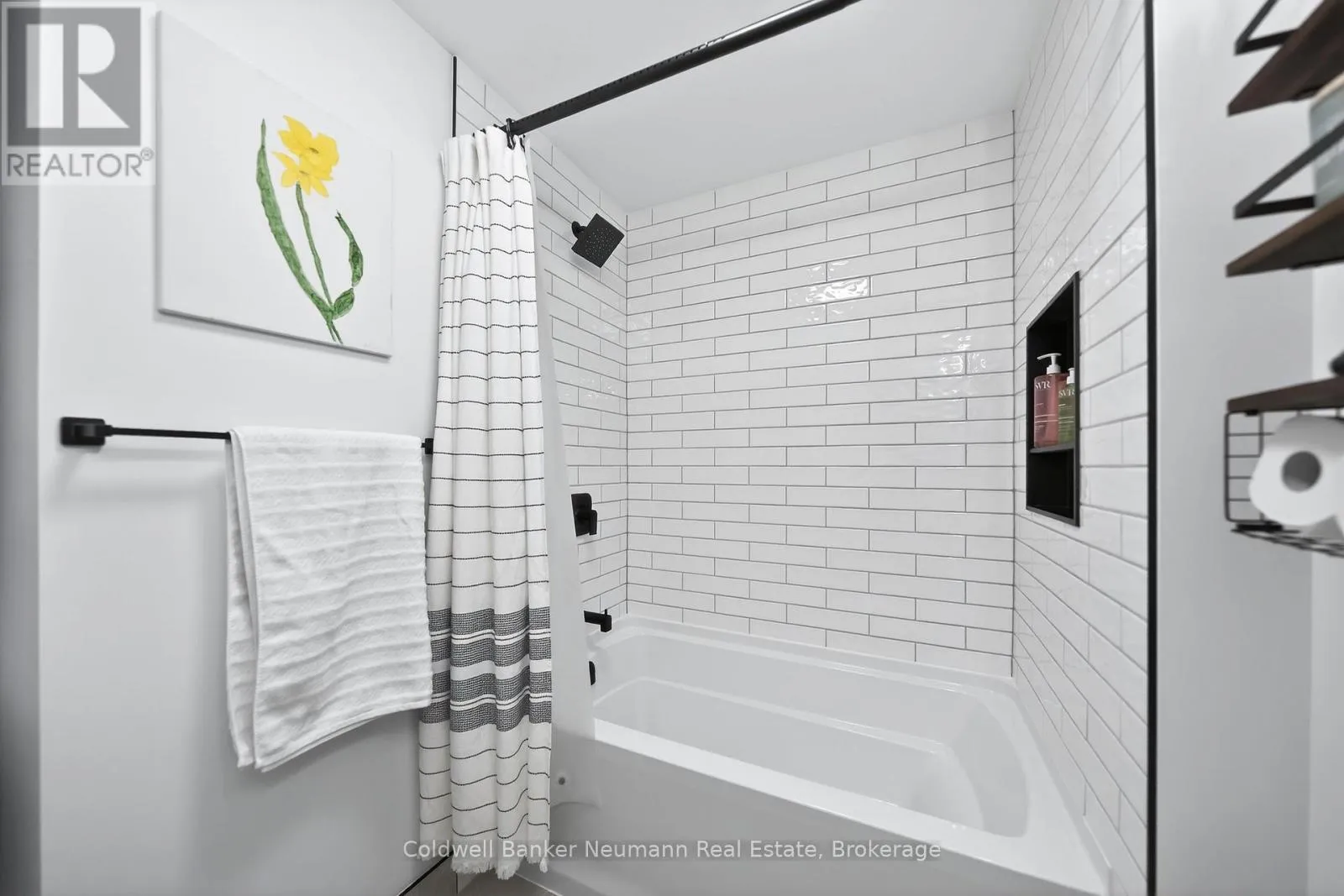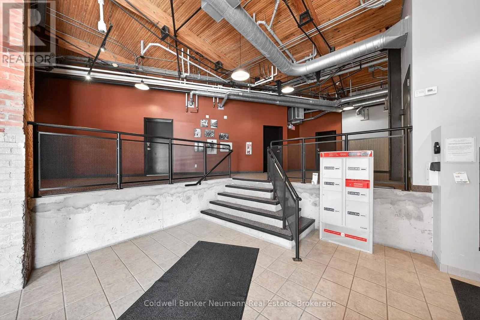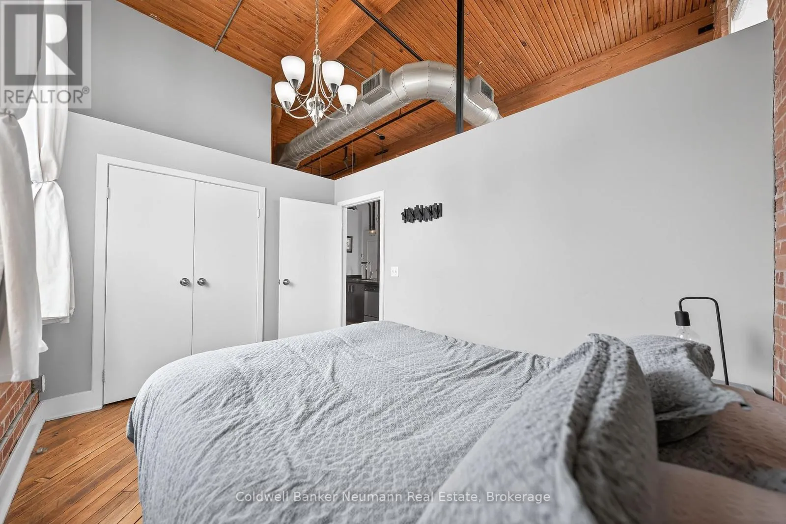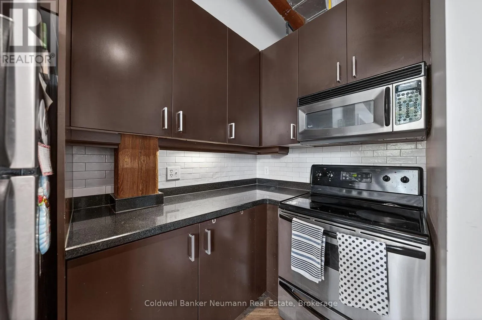 Cross Streets: Cross St & Arthur St S. ** Directions: Wellington - Neeve - Ontario. Authentic loft living in the heart of Guelph. Located in the highly desirable Mill Lofts, this corner unit is a one-bedroom, one-bathroom. it showcases the timeless appeal of true industrial design paired with thoughtful modern updates.Rich exposed brick walls set the tone throughout the space, adding warmth, texture, and undeniable character you simply won't find in newer builds. The open-concept layout is complemented by high ceilings and oversized windows, creating a bright and inviting atmosphere.The professionally remodeled bathroom by Urban Uplift, delivers a fresh, contemporary feel with updated finishes designed for everyday comfort.The kitchen flows seamlessly into the living area, making it ideal for both relaxed living and entertaining. Includes one dedicated parking space and storage locker for added convenience. Every corner of this unit reflects a balance of historic charm and practical functionality.Set in one of Guelph's most vibrant neighbourhoods, you're just steps to the GO Station, downtown amenities, and scenic trails along the Speed River-perfect for those who value both convenience and lifestyle. (id:27476)
