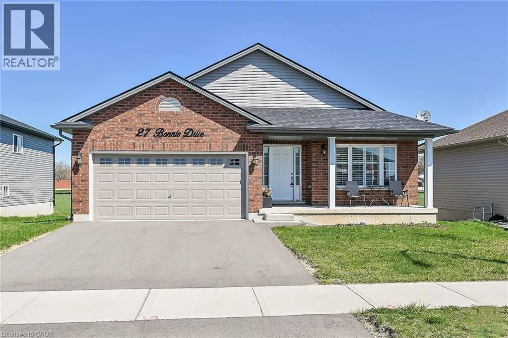 PARKVIEW RD TO MAPLEVIEW DR TO LEFT ON HELEN DR TO LEFT ON ALEXIS DRIVE TO RIGHT ON BONNIE DRIVE Welcome Home to 27 Bonnie Drive! Truly Stunning, Beautifully upgraded open concept 2 bedroom, 2 bathroom Bungalow built in 2021 on sought after Bonnie Drive and situated on premium lot 57â x 102â lot backing onto school field area with fenced yard. Incredible curb appeal with attached double garage, recent paved double driveway, tasteful landscaping, brick & complimenting sided exterior, inviting front porch, & private back yard with concrete patio area. The gorgeous interior features 1428 sq ft of distinguished living space highlighted by hardwood floors throughout, upgraded kitchen cabinetry with breakfast bar & stainless steel appliances, formal dining area, large main floor living room, additional main floor family room, 2 spacious bedrooms including primary suite with 3 pc ensuite bathroom, desired MF laundry, & primary 4 pc bathroom. The unfinished basement provides the opportunity to double your living space or offers great storage. Ideal for those looking for main floor living, young family, or the first time Buyer. Conveniently located close to schools, shopping, parks, splash pad, pool, & amenities. Easy access to Port Dover, Hamilton, Brantford, Ancaster, & 403. Shows well. Call today to view this lovingly maintained Bungalow and Enjoy Hagersville Living at its Finest! (id:27476)