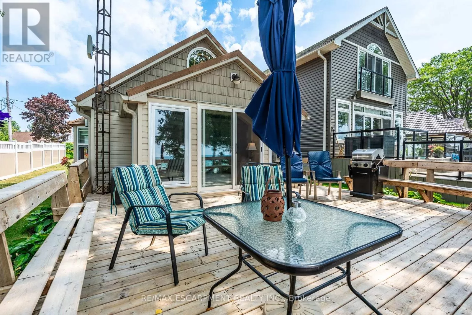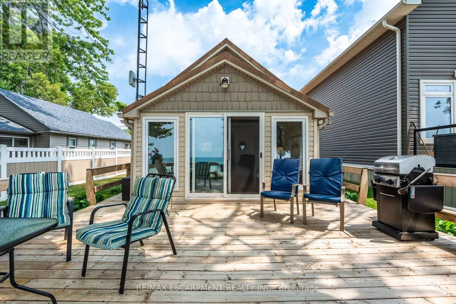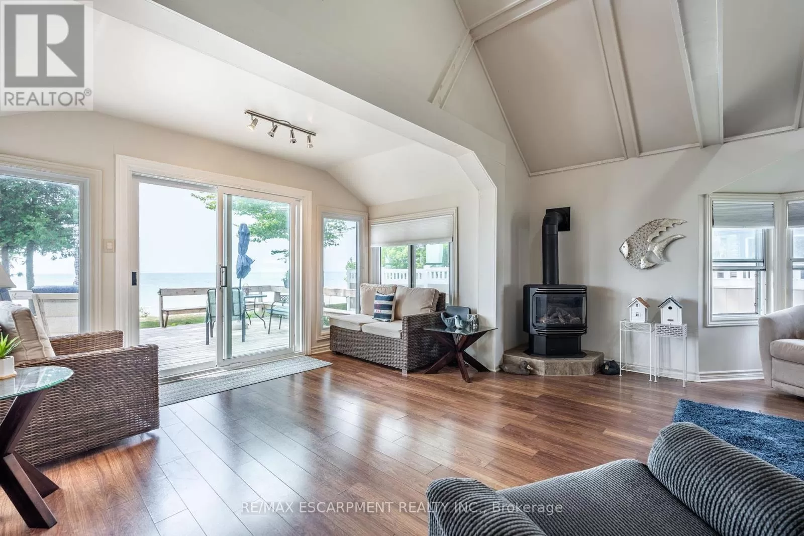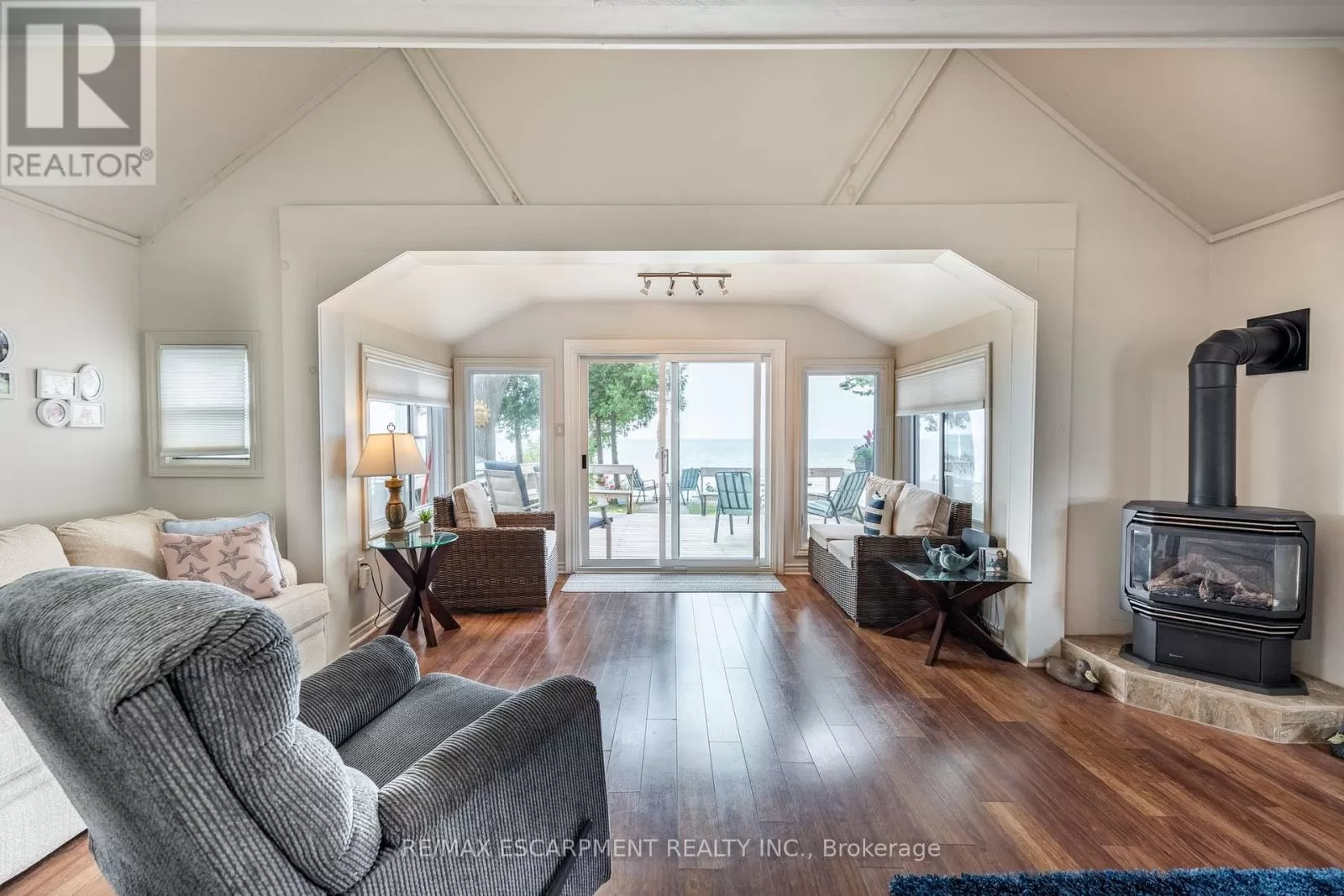 Cross Streets: South Cost Drive. ** Directions: HWY 3 - Sandusk Road - Lakeside Drive. Four-season home located directly on Lake Erie in the Peacock Point community. The property features an open-concept layout with water and sky views, a natural gas fireplace, and a modern 3-piece bathroom. The kitchen includes stainless steel appliances, ample cabinetry, and generous counter space. A spacious loft provides additional room for sleeping, office use, or storage. Outdoor spaces include front and rear decks, a lower patio, and a second seating area overlooking the lake. Additional features include a cistern for fresh water, seasonal water service through the Peacock Point Community system (Spring to Fall, annual cost: $315.00), a professionally built concrete break wall with steel stairs to the sand and gravel shoreline, a steel roof (2019), Fence (2024), parking for three vehicles, a holding tank for wastewater, an owned hot water tank, and on-site natural gas and electricity. Flexible closing is available. Recent survey available. (id:27476)