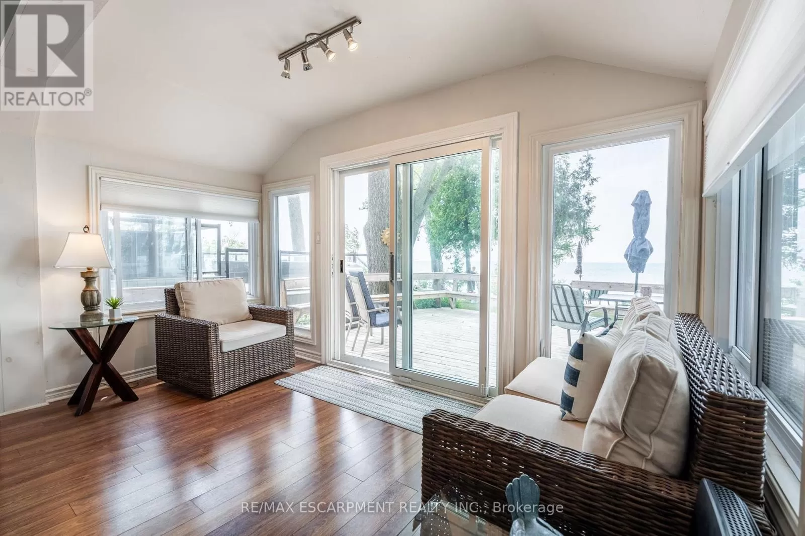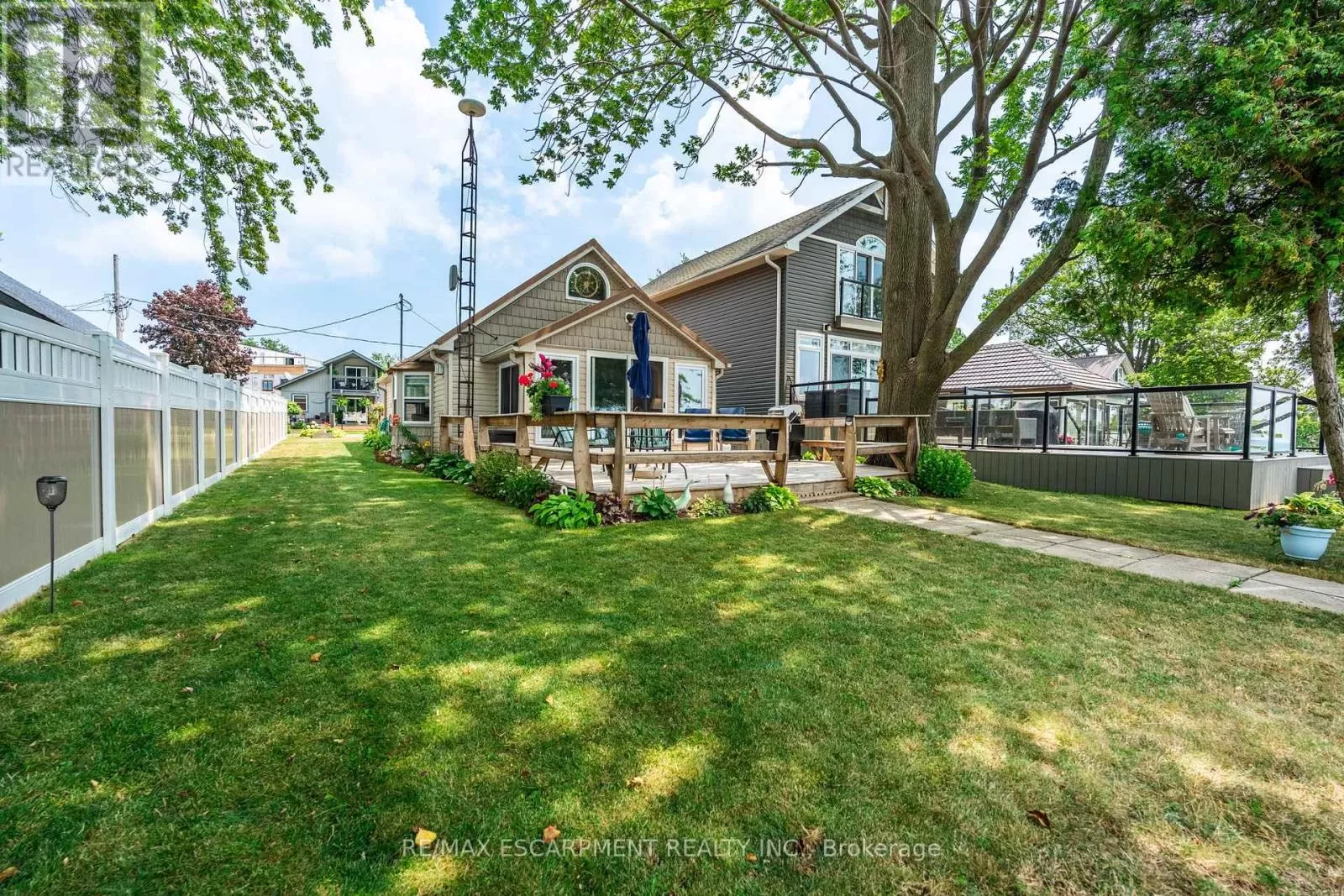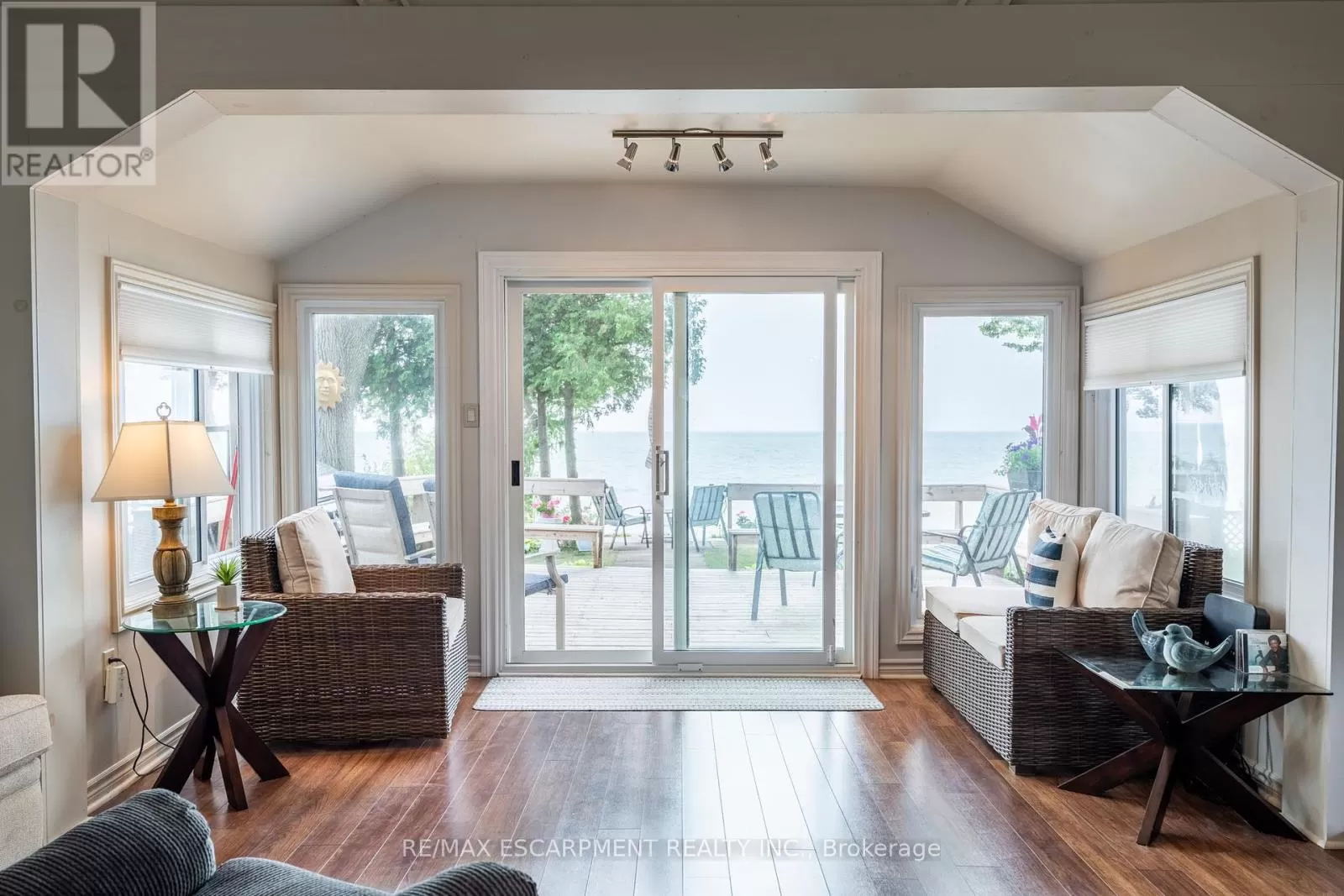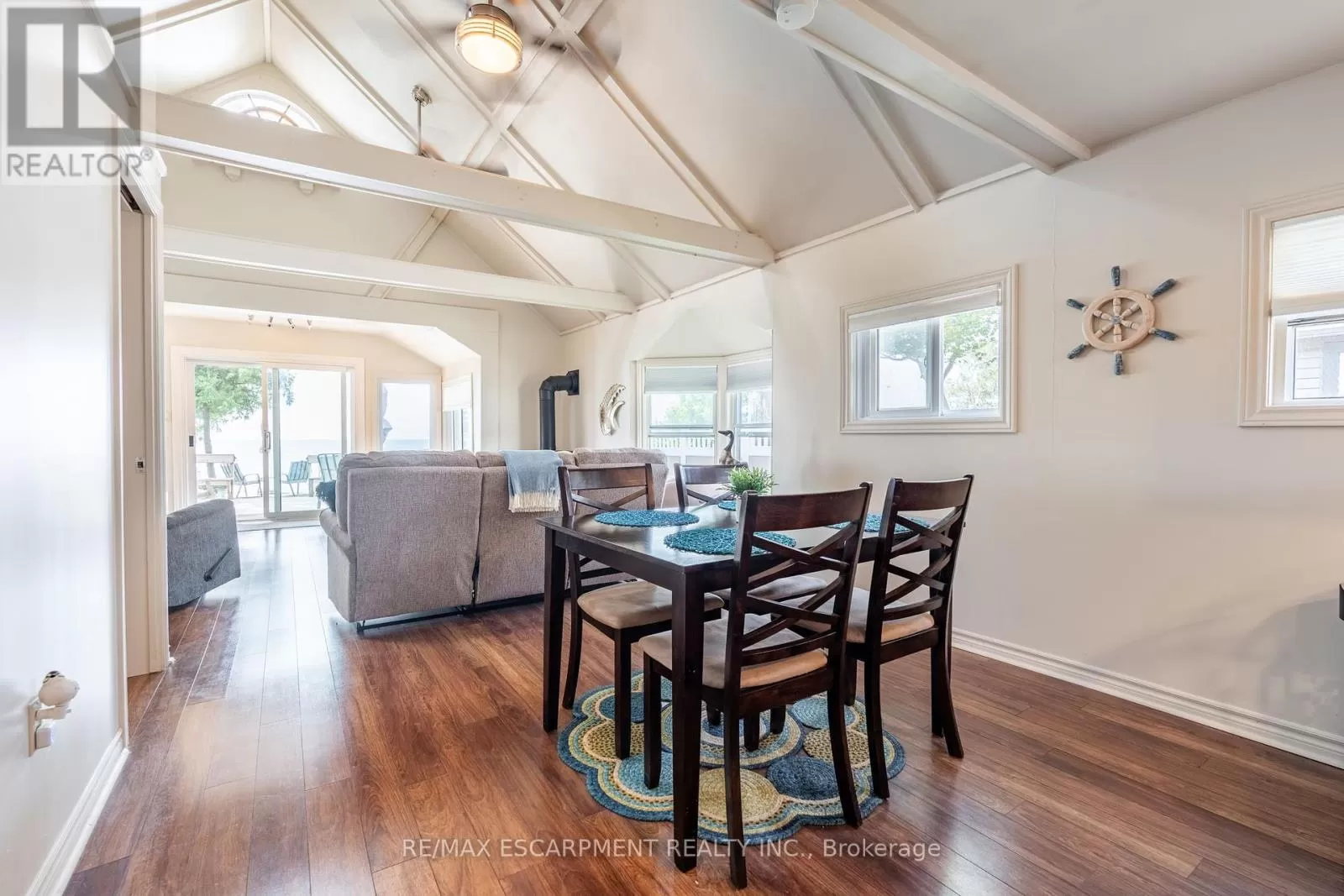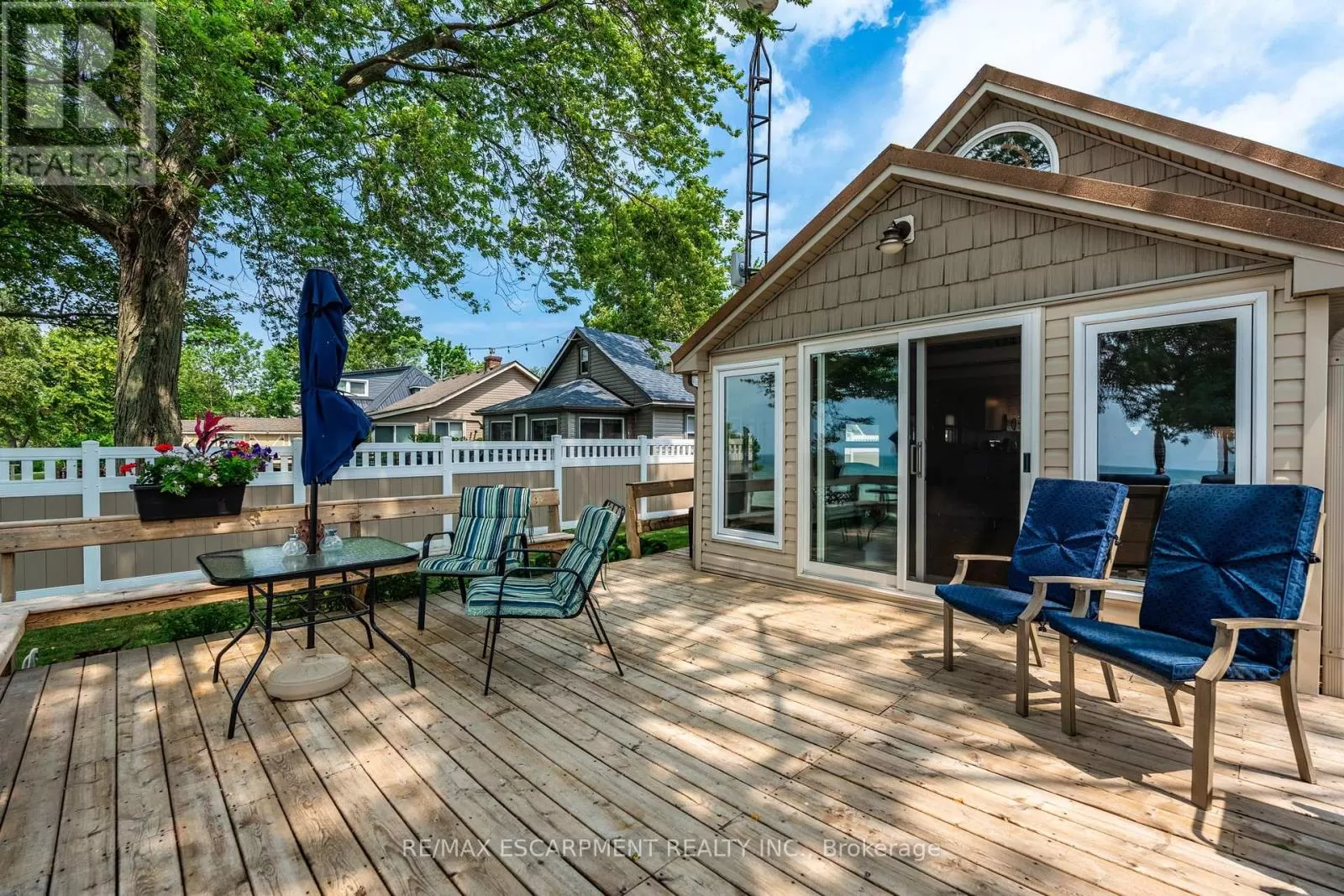 Cross Streets: South Cost Drive. ** Directions: HWY 3 - Sandusk Road - Lakeside Drive. Four-season home located directly on Lake Erie in the Peacock Point community. The property features an open-concept layout with water and sky views, a natural gas fireplace, and a modern 3-piece bathroom. The kitchen includes stainless steel appliances, ample cabinetry, and generous counter space. A spacious loft provides additional room for sleeping, office use, or storage. Outdoor spaces include front and rear decks, a lower patio, and a second seating area overlooking the lake. Additional features include a cistern for fresh water, seasonal water service through the Peacock Point Community system (Spring to Fall, annual cost: $315.00), a professionally built concrete break wall with steel stairs to the sand and gravel shoreline, a steel roof (2019), Fence (2024), parking for three vehicles, a holding tank for wastewater, an owned hot water tank, and on-site natural gas and electricity. Flexible closing is available. Recent survey available. (id:27476)