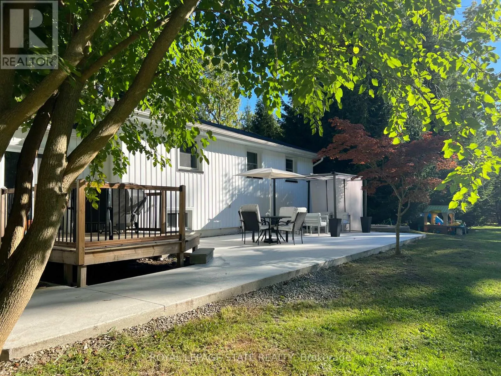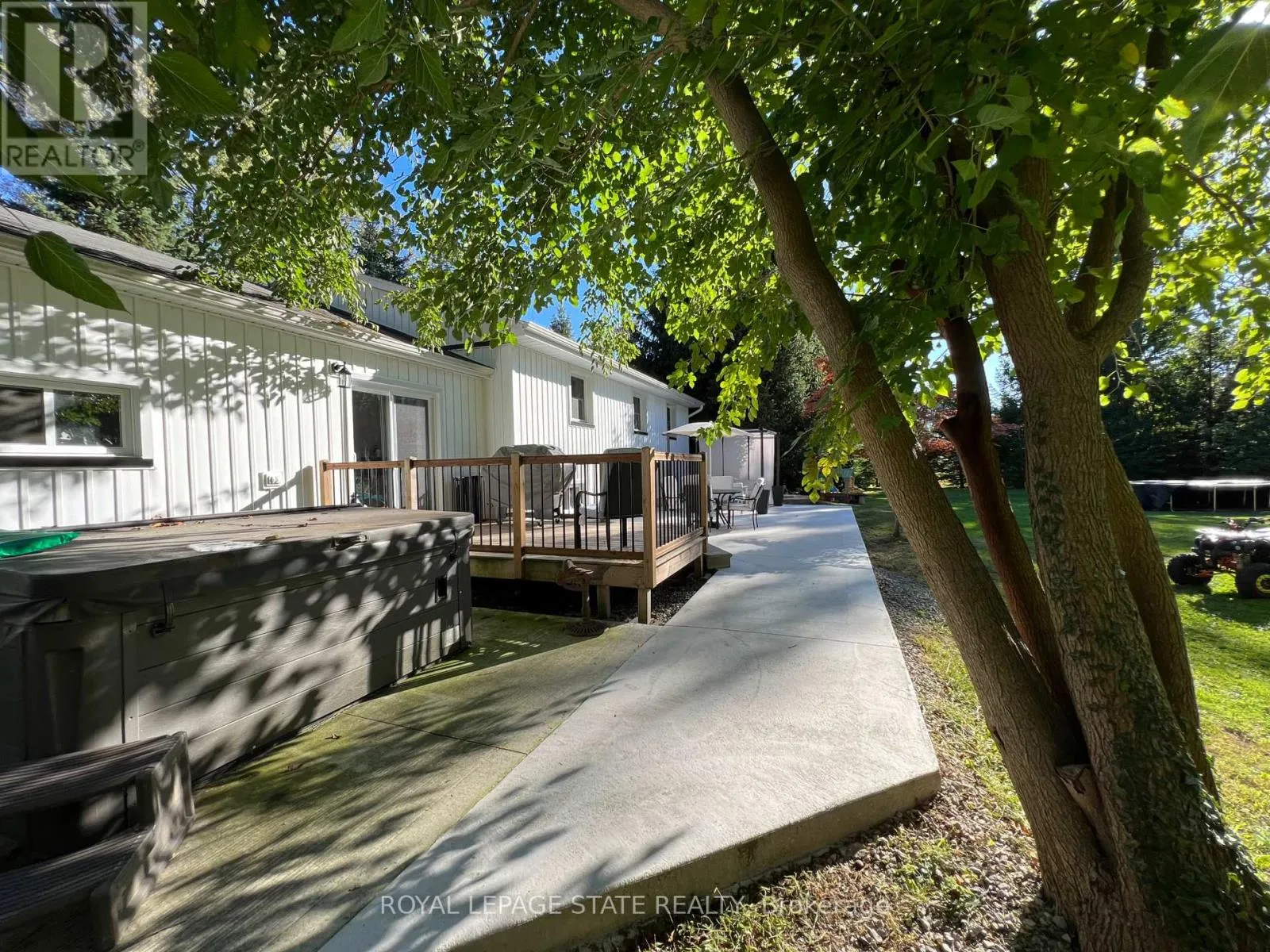 Cross Streets: Jarrett Place. ** Directions: Corner of Diltz Road and Jarrett Place. Country living close to town & all amenities! This 3+1, 2.5 bath bungalow on sought after 173 x 300 private mature treed lot. Great curb appeal with brick & vinyl sided exterior with attached garage, ample parking, deck, large patio and private mature treed backyard. Breezeway foyer to open interior layout: kitchen with breakfast bar, stainless steel appliances, spacious living/dining room with electric fireplace, 3 beds, 4 pc main bath & 2 pc guest, basement with family room, bedroom, 3 pc bath, laundry & storage. Enjoy the private yard, deck, new patio (2025), hot tub (as-is) and large lawn area, edged with mature trees. Shed with power. Updates include Furnace Oct 25, Septic 2022, 24-25; windows, weeping tile and waterproofing, rear concrete patio, some siding, main bathroom, interior painting throughout, interior doors & trim, laminate flooring & carpeting in bedrooms (original hardwood underneath). RSA (id:27476)