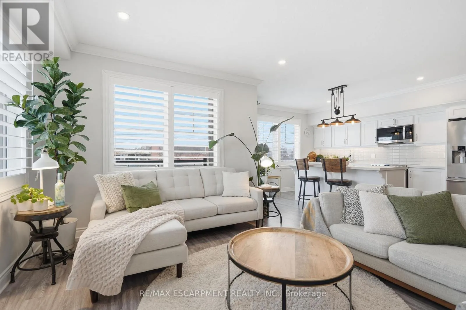 Cross Streets: Argyle St & Haddington. ** Directions: South on Hwy 6/Upper James to Argyle St S, East on Haddington. Rarely offered corner unit in Harrison Flats. This bright 2-bedroom, 2-bath condo offers carefree living in one of Caledonia's most sought-after buildings-ideal for downsizers, professionals, and couples alike. The northwest-facing suite is filled with natural light and showcases beautiful afternoon sun and evening sunsets, enhanced by oversized windows throughout, all fitted with quality 4.5" shutters. Enjoy year-round use of the covered corner balcony-perfect for relaxing, reading, or taking in the vibrant community across the street, including the arena, events centre, library, park, and baseball diamond. The spacious primary bedroom features a 3-piece ensuite and two closets, while the generous second bedroom includes a walk-in closet. All closets are outfitted with California Closet organizers. Additional highlights include a full-size washer/dryer combo in a large in-suite laundry room with extra storage, two above-ground side-by-side parking spaces, and excellent building amenities such as a party room, common BBQ area, bike racks, and visitor parking. Conveniently located for commuters to Hamilton, Burlington, Toronto, Kitchener, and Niagara. Move in and enjoy elegant, low-maintenance living in a welcoming, established community. (id:27476)