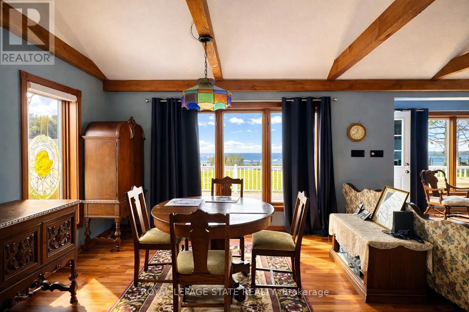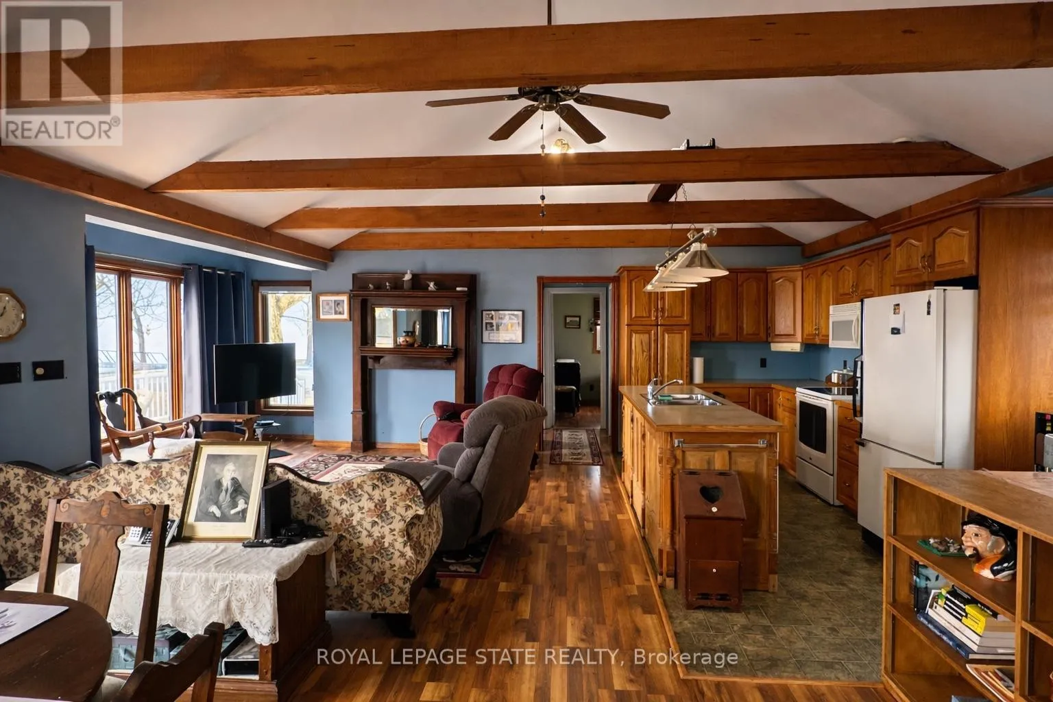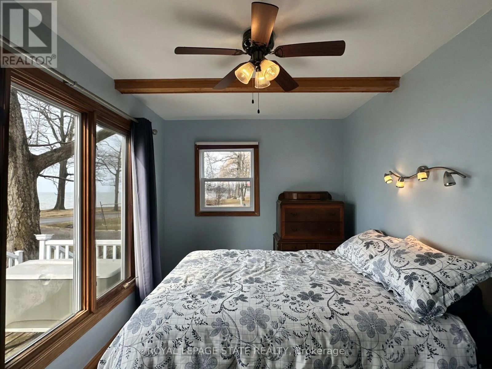 Cross Streets: Lakeshore Rd. ** Directions: Rainham Road, South on Haldimand Dunnville Townline Rd, left on Lakeshore, right on Edgewater Place. Waterfront retreat on a quiet road owning the north and south (waterside) of the road. This year-round 2-bedroom home offers the perfect blend of relaxation and recreation, featuring just over 70 feet of Lake Erie water frontage and 2022 Wilkinson built break wall, plus a natural sand and pebble beach for endless summer enjoyment. Step inside to a bright, open-concept living/dining/kitchen space highlighted by vaulted, beamed ceilings and a wall of windows showcasing lake views and awesome sunsets. The inviting layout is ideal for both everyday living and entertaining. The home includes a basement (1992) providing ample storage space and development potential, while the expansive deck is perfect for morning coffee or hosting family and friends against a beautiful waterfront backdrop. Plenty of driveway parking accommodates all your vehicles and recreational toys. Additional updates include roof shingles and the added peace of mind of a backup generator. A rare opportunity to own a lakeside escape-perfect as a year-round residence or weekend getaway! (id:27476)