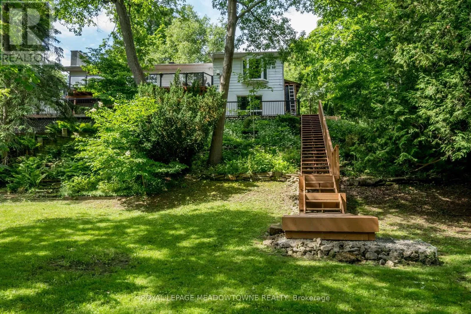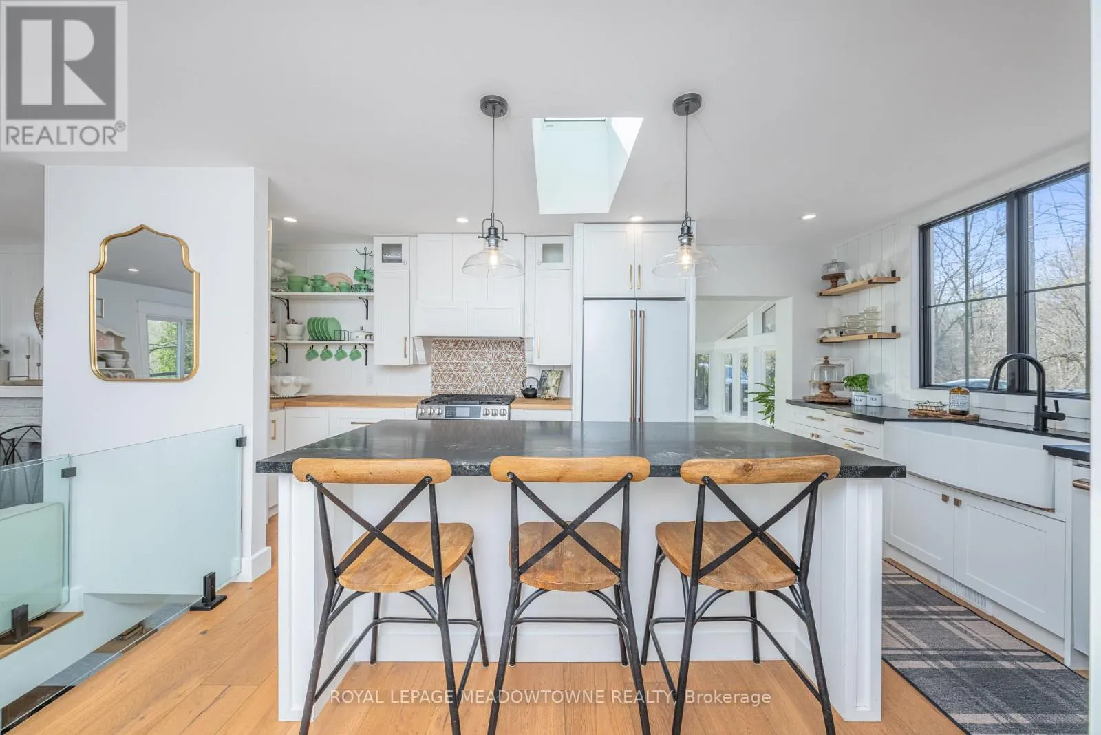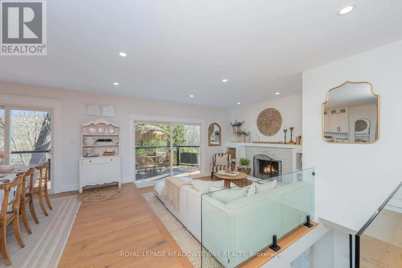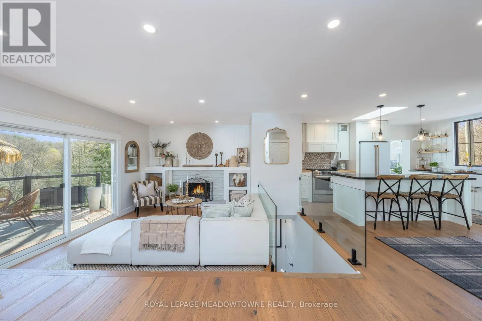Cross Streets: Main St / Mountain St. ** Directions: . Welcome to this beautifully reimagined 4-bedroom home, privately nestled along a quiet gravel lane in the scenic village of Glen Williams. Set on nearly an acre with uninterrupted, year-round views of the Credit River, this property offers a rare fusion of peaceful nature and modern elegance. Step into the inviting sunroom -- bathed in natural light, its the perfect space to welcome guests, set up a creative home office, or simply relax with a good book. Inside, the main floor features stunning white oak floors and a breezy, open-concept layout that effortlessly connects the kitchen, dining, and living areas -- ideal for both everyday life and memorable entertaining. At the heart of the home, the chef-inspired kitchen combines functionality with elevated design. It boasts top-of-the-line Café appliances, ample cabinetry, and a striking picture window above the sink, framing views of the surrounding landscape. Upstairs, the serene primary suite offers a generous retreat, complete with a contemporary ensuite and space to unwind. Glass railings lead to the fully finished walkout basement, where abundant natural light and luxury vinyl plank flooring create a warm, open ambiance. This level includes a spacious family room, an additional bedroom and full bathroom, plus a versatile workshop area that could easily serve as a guest suite or creative studio. Outside, expansive decks provide a front-row seat to the river's beauty -- perfect for morning coffee, weekend lounging, or evenings under the stars. Offering the best of both worlds, this secluded escape is just seven minutes from the Georgetown GO Station, putting city access within easy reach while enjoying the charm and tranquility of Glen Williams. (id:27476)