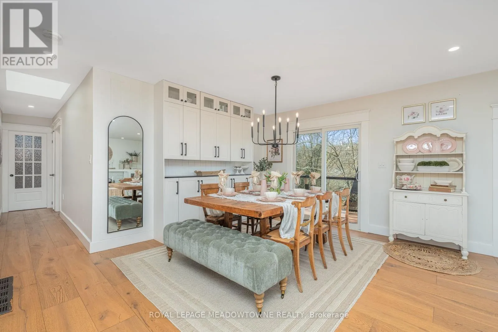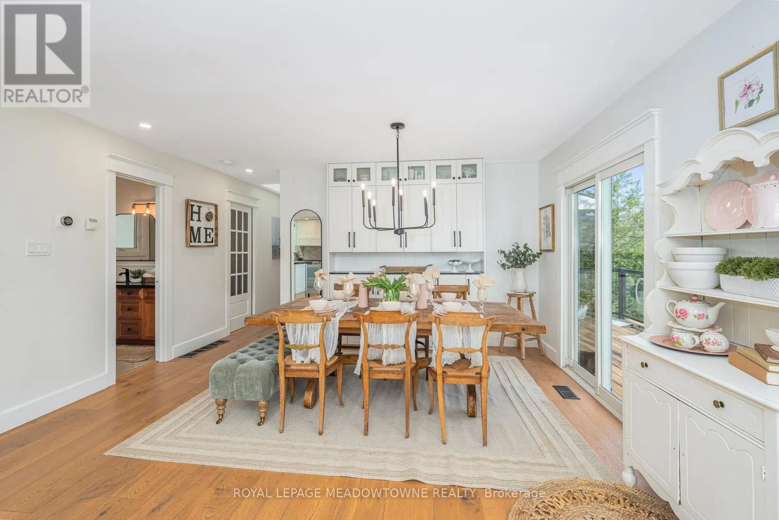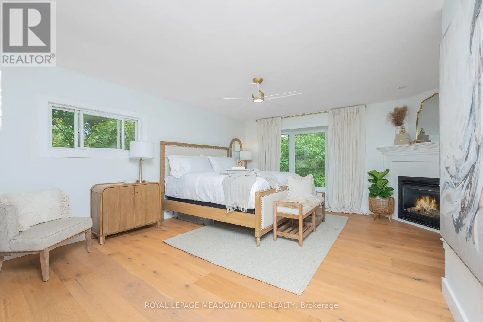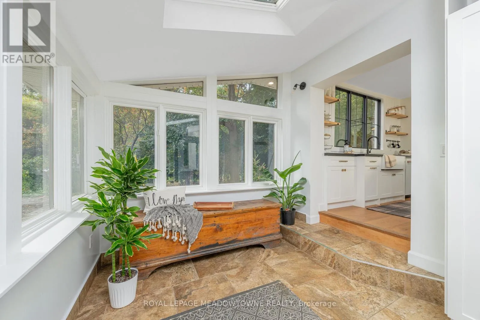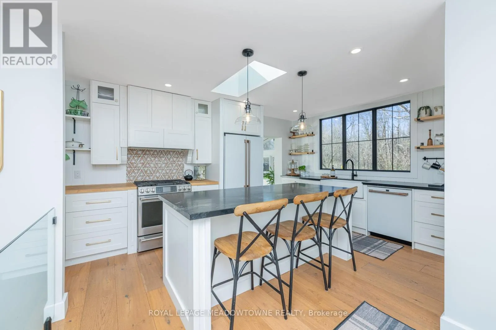 Cross Streets: Main St / Mountain St. ** Directions: . Welcome to this beautifully reimagined 4-bedroom home, privately nestled along a quiet gravel lane in the scenic village of Glen Williams. Set on nearly an acre with uninterrupted, year-round views of the Credit River, this property offers a rare fusion of peaceful nature and modern elegance. Step into the inviting sunroom -- bathed in natural light, its the perfect space to welcome guests, set up a creative home office, or simply relax with a good book. Inside, the main floor features stunning white oak floors and a breezy, open-concept layout that effortlessly connects the kitchen, dining, and living areas -- ideal for both everyday life and memorable entertaining. At the heart of the home, the chef-inspired kitchen combines functionality with elevated design. It boasts top-of-the-line Café appliances, ample cabinetry, and a striking picture window above the sink, framing views of the surrounding landscape. Upstairs, the serene primary suite offers a generous retreat, complete with a contemporary ensuite and space to unwind. Glass railings lead to the fully finished walkout basement, where abundant natural light and luxury vinyl plank flooring create a warm, open ambiance. This level includes a spacious family room, an additional bedroom and full bathroom, plus a versatile workshop area that could easily serve as a guest suite or creative studio. Outside, expansive decks provide a front-row seat to the river's beauty -- perfect for morning coffee, weekend lounging, or evenings under the stars. Offering the best of both worlds, this secluded escape is just seven minutes from the Georgetown GO Station, putting city access within easy reach while enjoying the charm and tranquility of Glen Williams. (id:27476)