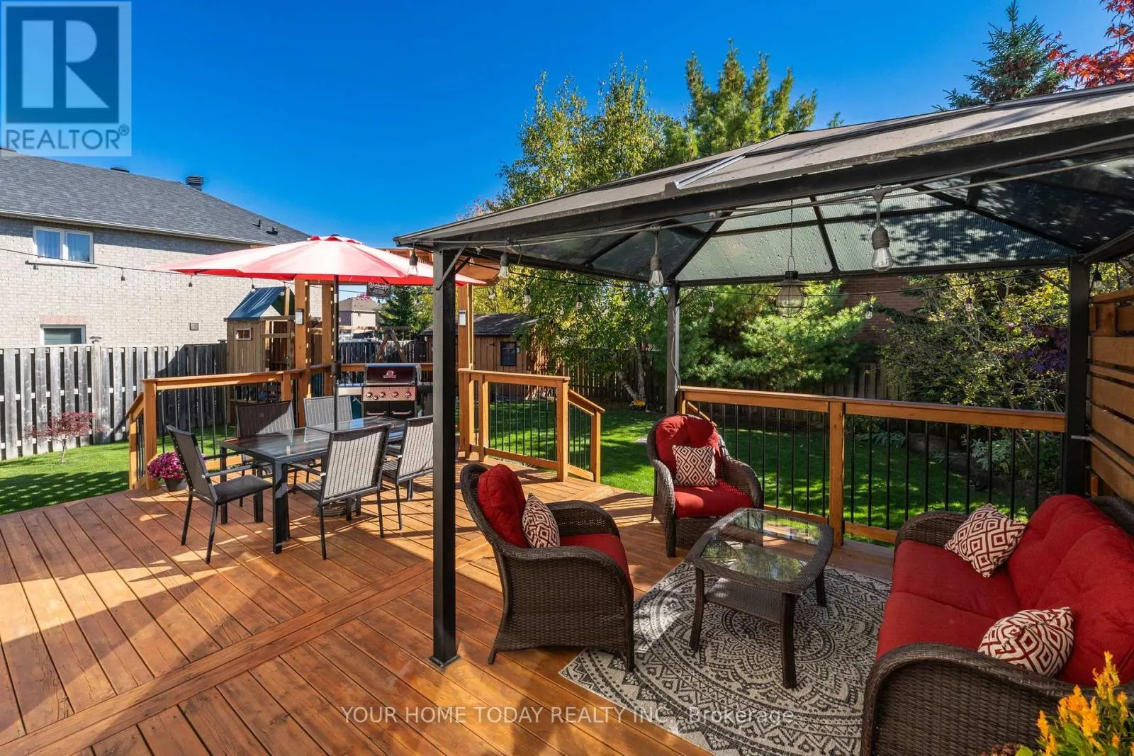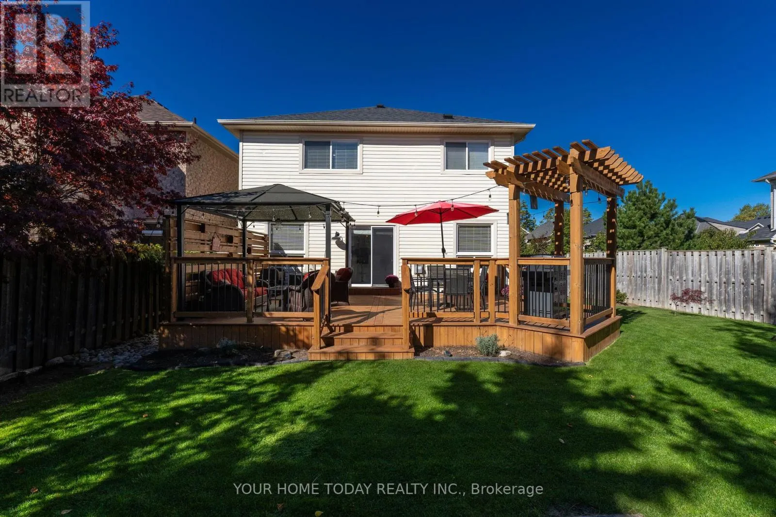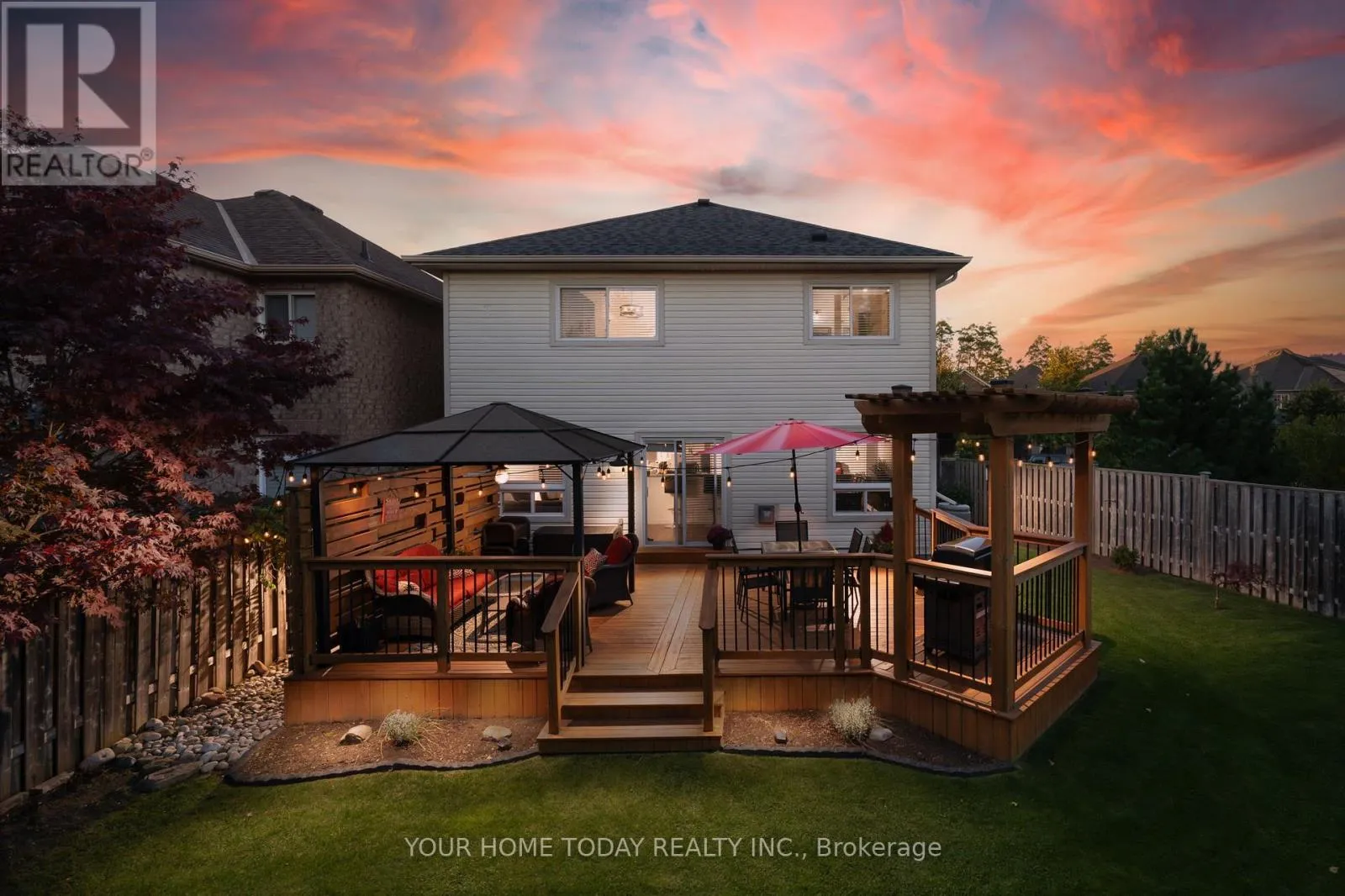 Cross Streets: Trafalgar and Berton. ** Directions: Trafalgar, Berton, Atwood, Mowat. An inviting covered porch welcomes you into this lovely family home that has been updated with attention to detail and a designer flair. The main level features stylish flooring, pot lights and tasteful finishes throughout. The kitchen enjoys neutral white cabinetry, subway tile backsplash, breakfast bar, pantry and walkout to a party-sized deck overlooking the nicely landscaped and very private yard. A large dining room with corner gas fireplace is ideal for entertaining a crowd while the sun-filled living room (open to the breakfast area) is perfect for family time. A nicely updated powder room and garage access complete the level. The upper level offers the same flair and attention to detail found on the main level with three spacious bedrooms and two full bathrooms. The primary bedroom enjoys a luxurious 3-piece ensuite and a superb walk-in closet with built-in shelving and two separate pocket doors. Two remaining bedrooms share the nicely updated 4-piece bathroom. An office nook/den overlooking the staircase completes the level. The lower level, also decorated with a designer flair, adds to the living space with a rec room featuring an eye-catching built-in fireplace, an enviable laundry room and plenty of storage/utility space. For your outdoor fun - the backyard offers a huge deck with privacy panel, pergola and gazebo overlooking the large pie-shaped yard complete with mature trees and lovely gardens. A good-sized shed and play structure add to the enjoyment. Wrapping up the package is the well-equipped garage with attached shelving, loft storage and slatwall panels for added convenience. Located in a quiet family friendly neighbourhood just steps to community sports field, park and trail and close to Trafalgar Sports Park, schools, hospital, fairgrounds, downtown shops, library and more. Easy access to main roads for commuters is a bonus! (id:27476)
