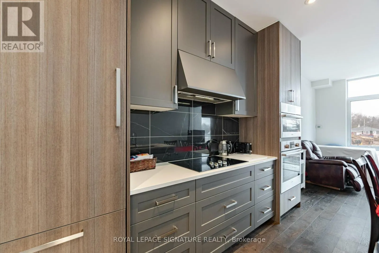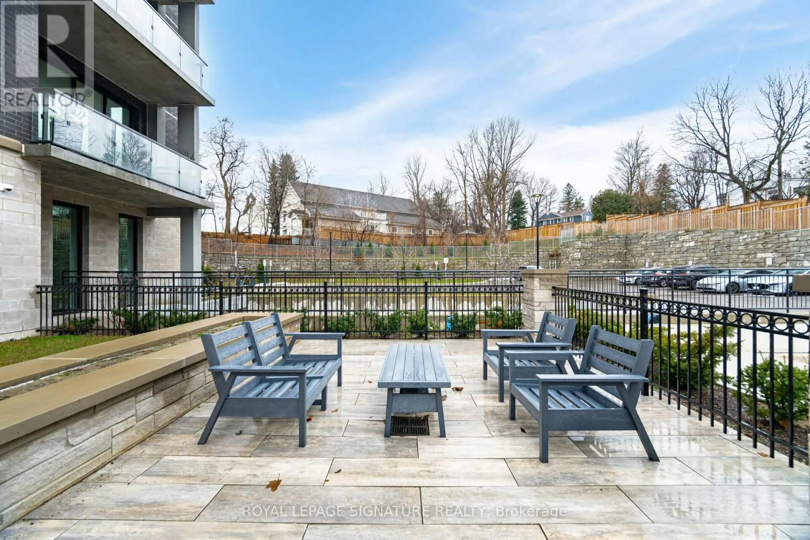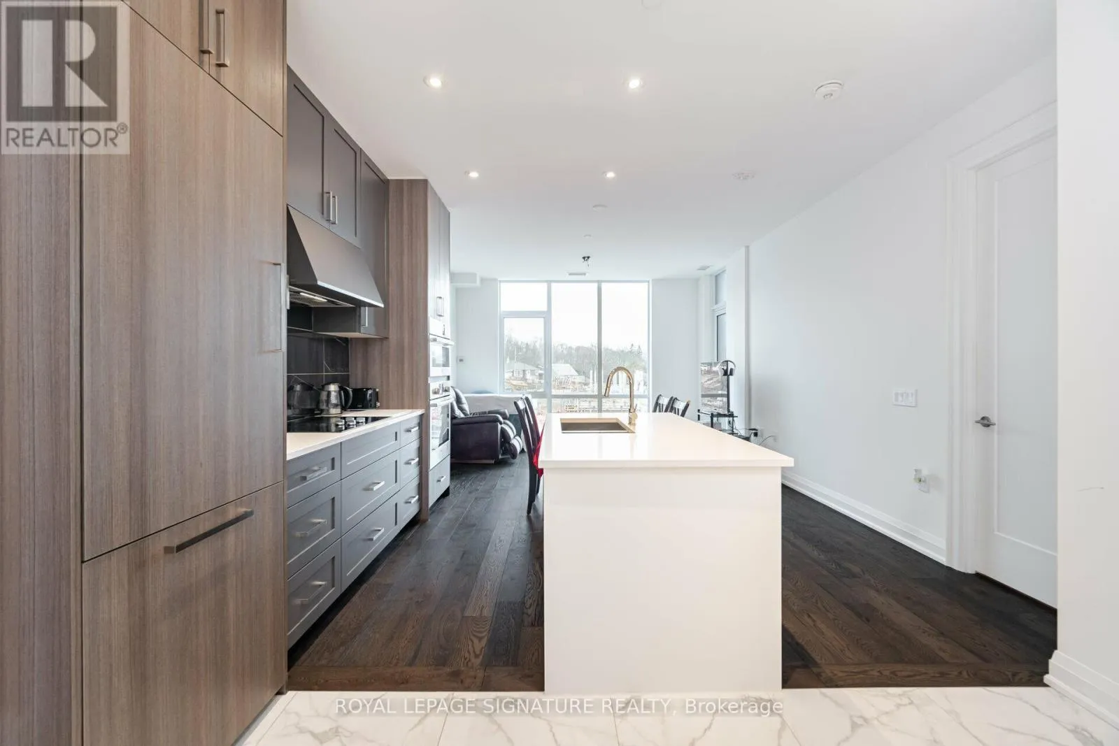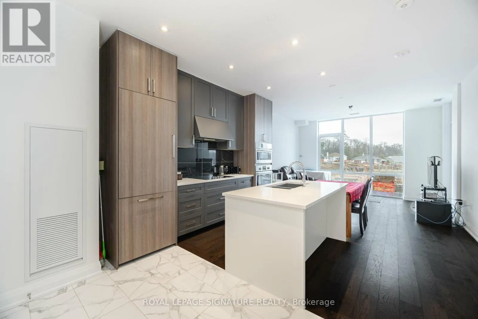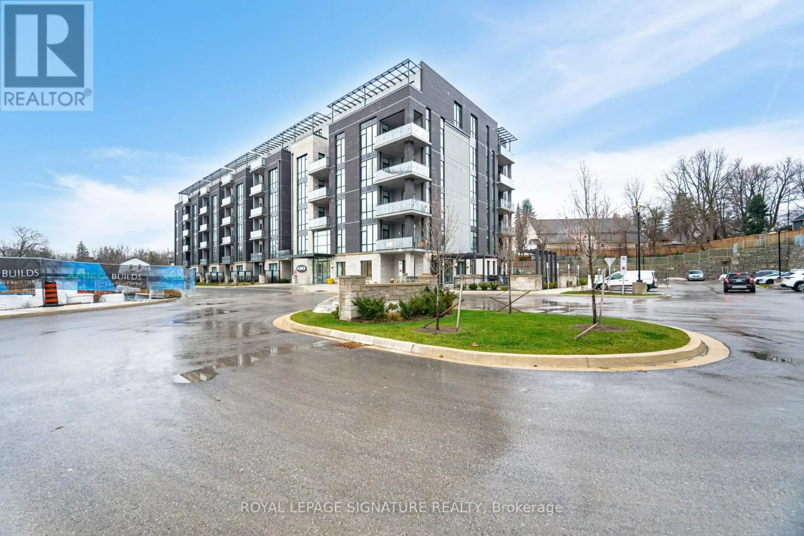 Mill St. and Guelph St. Luxurious, well designed 1-Bedroom Condo in a new, one of a kind boutique building with premium finishes throughout in the heart of Georgetown. Discover modern living in this beautifully designed, 845 sqft spacious unit. Perfect for anyone seeking a low-maintenance, stylish home in a prime location. This bright, spacious and inviting unit features an open-concept layout with large windows that fill the space with natural light. Enjoy the ease of engineered hardwood and tiled flooring throughout this carpet-free condo, offering a clean and modern aesthetic. The sleek kitchen features Quartz countertops, an island, ample storage, and modern integrated appliances, making it perfect for both cooking and entertaining. The generously sized bedroom offers comfort and tranquility, complete with a walk-in closet. The primary 4-piece bathroom is spacious and impeccably modern. This is complemented by a convenient 2-piece powder room for guests. A separate in-suite laundry room, complete with a sink, adds practical convenience to this al ready exceptional home. Residents of this boutique building enjoy a host of premium amenities, including a cozy reading room, a party room for entertaining, a BBQ terrace for outdoor gatherings, and a well-equipped gym to support an active lifestyle. Located in the downtown area, you will be steps away from all conveniences - GO station, shopping, restaurants, cafes, parks, schools, art galleries and all the charm Georgetown has to offer. This condo combines luxury, elegance, comfort, and practicality in a premier location. Schedule your private viewing today. (id:27476)
