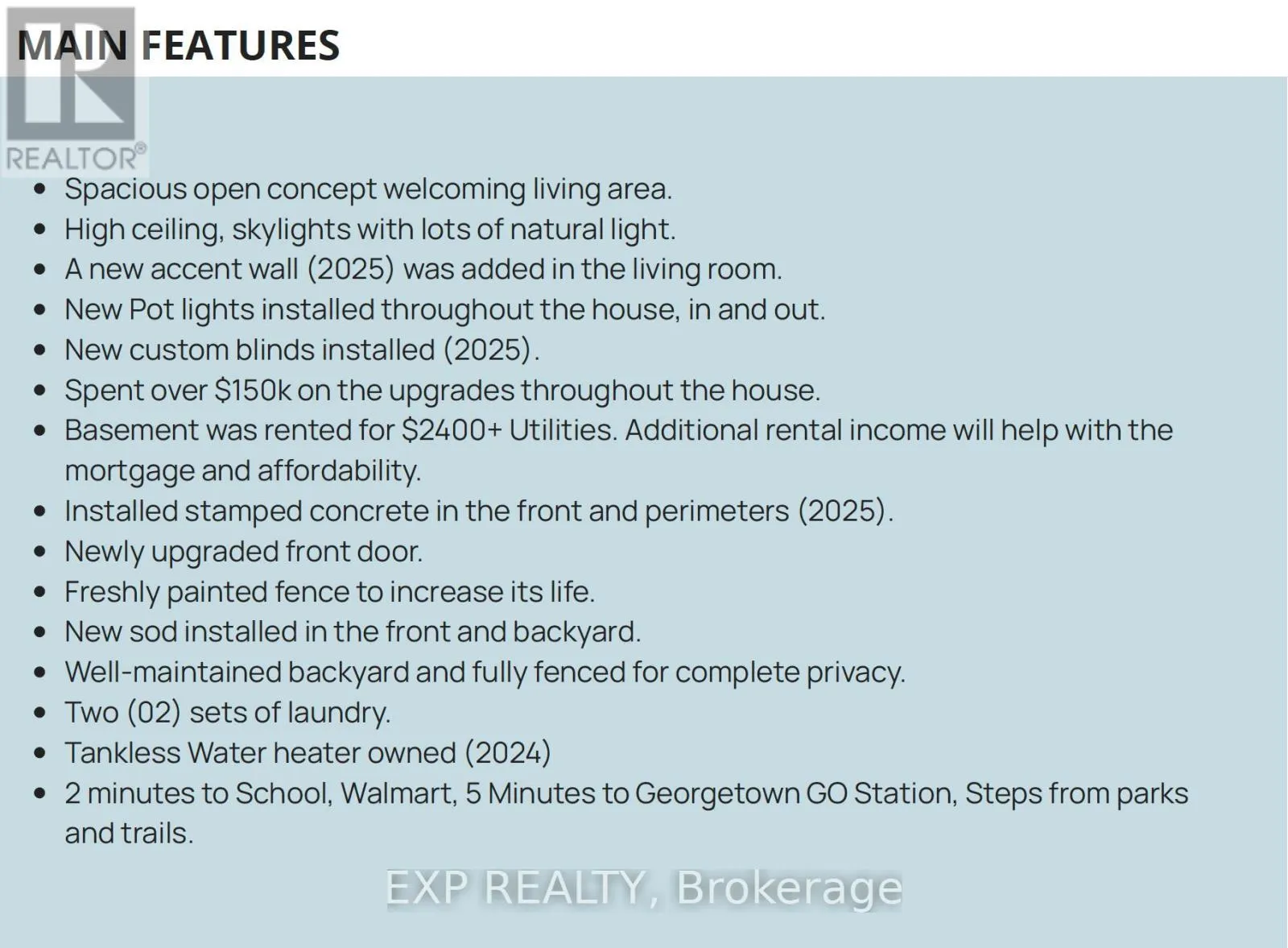 Cross Streets: Sinclair and Mountainview Road S. ** Directions: Intersection lights of Sinclair and Mountainview Road S. This detached home offers 6 bedrooms (3 main floor + 3 legal basement) & 4 full bathrooms with a legal basement completed in Nov 2024, and was rented for $2,400 plus utilities, located in the heart of Georgetown. Walking distance to Schools, Walmart, mall, trails and parks. The main floor features an open-concept layout with a newly installed accent wall and skylights. Fully functional kitchen with quartz countertops & ample cabinetry. The dining area has big windows providing lots of natural light. Pot lights and custom blinds were installed throughout the house. The basement is finished with a separate laundry, huge windows, and new pot lights, perfect for a growing family, multi-generational living, or generating rental income. Brand new exterior pot lights (2025), stamped concrete (2025) driveway, patio and sidewalks, huge backyard has new sod (2025) installed throughout. (id:27476)