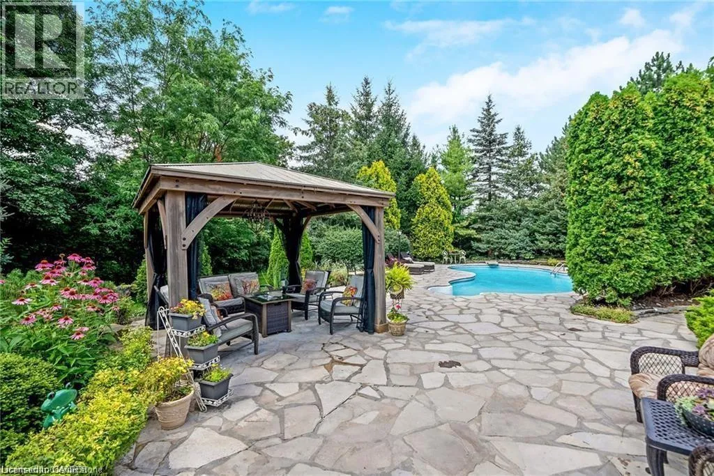 25 Side Road Dublin Line North Trillium Terrace Welcome to this ULTRA-PRIVATE SECRET GARDEN - A Rare Executive Country Estate Property backing onto Blue Springs Golf Club (Home of PGA Canada) w/ the most stunning yard that will rival any luxury resort. This prestigious all-brick home features open concept living + fully finished basement. It is nestled on a stunning 1.38-ACRE LOT (including a beautiful side lot for added privacy) in a quiet enclave of distinguished executive homes. There is a sense of space as you enter the grand foyer w/ its 9' ceilings and curved staircase. The heart of this home is the gourmet EI kitchen which overlooks the WO to the stunning yard and living room w/ vaulted ceiling, fireplace and additional WO to the yard. There is a main level office located off the front entrance and convenient main level laundry w/ tub. The upper floor has 3 generous bedrooms (there were 4 - can easily convert back), one being the primary bedroom with his/her closets and 5-pc ensuite. The basement features an over-sized 4th bedroom, RI for bathroom, a 2nd office, gym, family room and workshop. The dream yard will take your breath away and includes a pavilion for dining al fresco, heated pool, koi pond w/ waterfall, golf-themed bar, screened-in pergola, extensive hardscaping (2000+ SF of flagstone installed on 3 of concrete for stability) and professional low-maintenance landscaping - the ultimate space for entertaining. Additional features: 3-car garage, parking for 10+ in the driveway, garage entry to home, replaced exterior doors, no rentals, energy efficient gas pool heater (2018), pool liner and cover (2025), furnace (2017), well pump (2024); water softener, UV system, HWT all owned; all windows replaced and home re-insulated, extensive UG sprinklers (including side lot), 12 x 16 double-sided pine Mennonite-built shed. Peaceful location close to golf, trails, lake, 15 minutes to 401. This is your opportunity to finally make a luxury move to the country ... let's get you in there for summer! (id:27476)