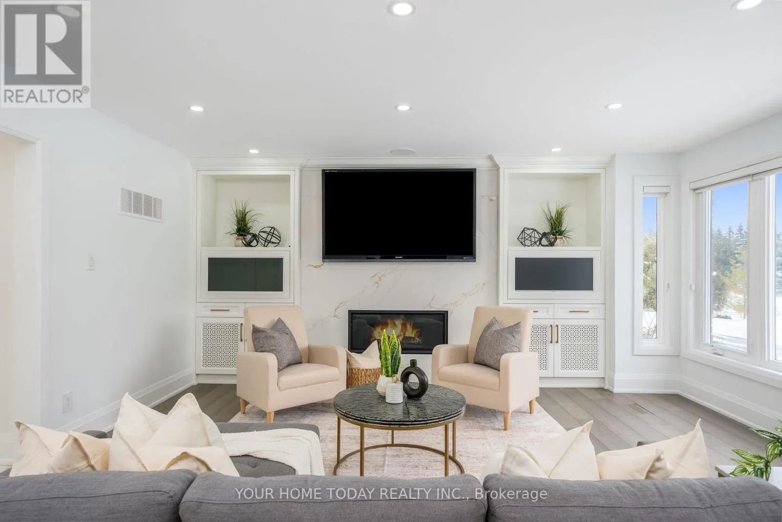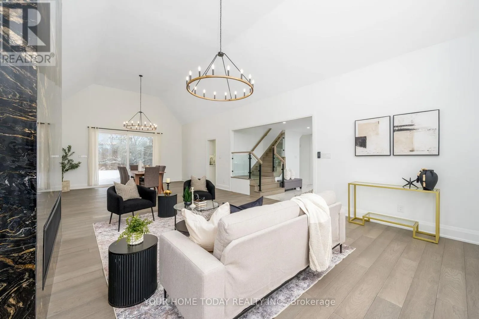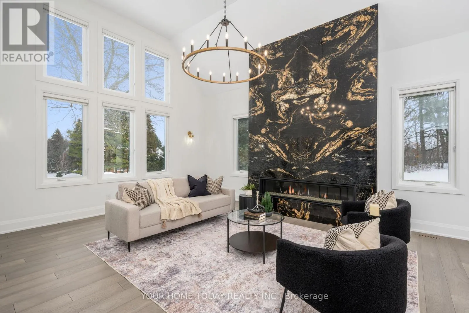 Cross Streets: Trafalgar and 15 Sideroad. ** Directions: Trafalgar, 15 Sdrd., Chantelay. Situated in a quiet executive enclave and set well back from the road on a private and breathtaking, 1.5 acre lot with no homes directly behind, this striking custom-built home offers classic design enhanced by exceptional modern updates. Extensively renovated over the past five years with designer flair and meticulous attention to detail, the home showcases gorgeous, engineered hardwood and ceramic flooring, abundant pot lighting and a consistent upscale aesthetic throughout. At the heart of the home is a chef-inspired kitchen featuring an oversized island with waterfall edge and seating, quartz countertops and premium appliances. Floor-to-ceiling cabinetry with glass accents and a walkout to the patio complete this stunning space. The inviting family room offers a toasty fireplace framed by custom built-in shelving, while the combined living and dining rooms impress with vaulted ceilings, expansive windows, and a striking fireplace set against an eye-catching feature wall. A sleek glass-railed staircase leads to the upper level where four generously sized bedrooms and a loft await. The upper foyer is both stylish and functional, featuring built-in organizers for added storage and a large window that fills the space with natural light. The primary retreat includes a walk-in closet with custom organizers, a decadent ensuite and access to a finished loft area above the garage - perfect as a sitting room, office or studio. A second primary suite enjoys ensuite access to another beautifully appointed bathroom and built-in closet organizers. Two additional bedrooms share a lavish main bath. The unfinished basement offers a wide-open canvas ready to be customized to suit your needs. Parking is plentiful with space for 10 vehicles in the driveway plus an attached 3 car garage. Ideally located close to schools, parks, trails, recreation centre, shopping and more with easy access to main roads for commuters. This is executive living at its finest! (id:27476)