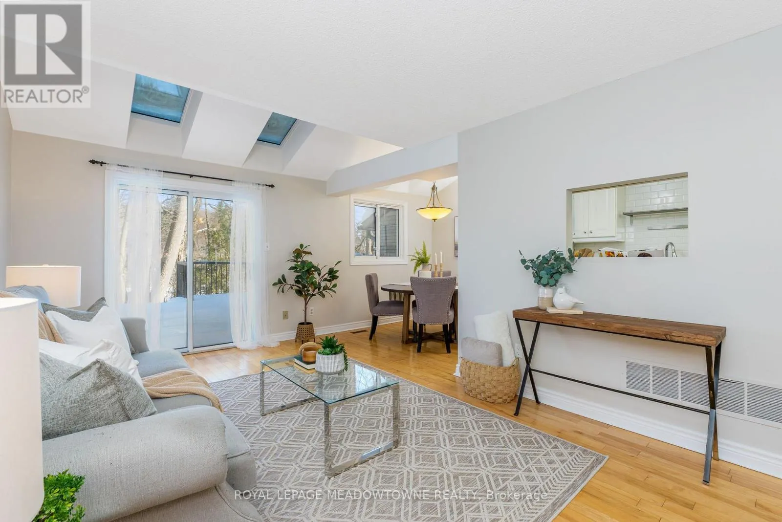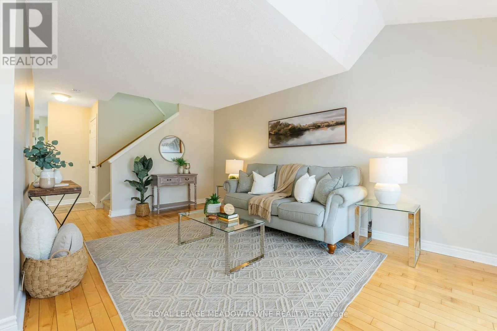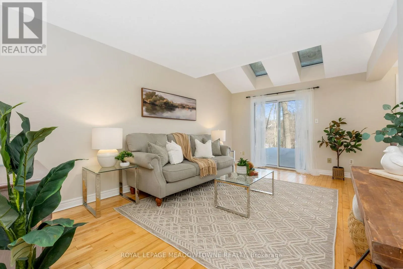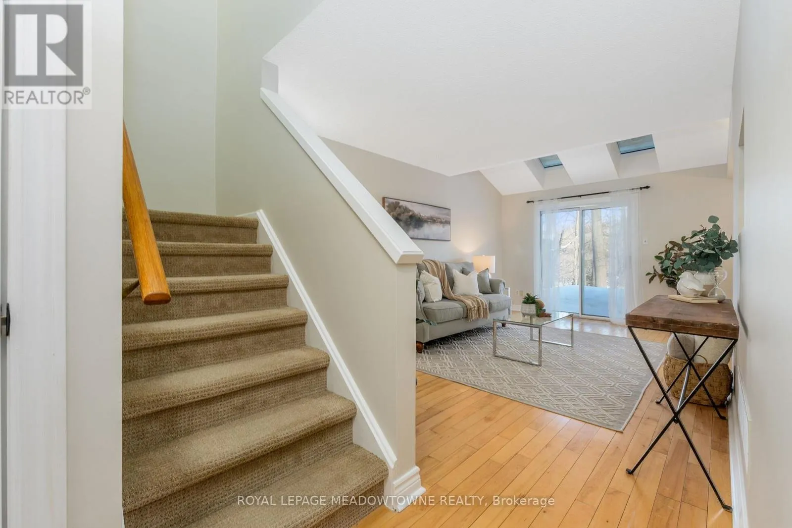 Cross Streets: River Dr/Mountainview Rd N. ** Directions: North on Mountainview Rd N, East on River Drive, North on John St, East on Lynden Circle. Move-in Ready 3 bedroom, 2 bathroom townhouse overlooking the serenity of the Credit River. Before stepping inside, take a moment to appreciate the stone porch and the curb appeal of the etched glass insert in the front door casting light into foyer. The living room with hardwood floors opens to a large deck guaranteed to provide a happy place for meals and gatherings. The updated kitchen with a pass-thru, glass cupboards, white tile backsplash and stainless steel appliances leads to the dining area which is illuminated by skylights. Upstairs there are three freshly painted bedrooms and a semi-ensuite 4-piece bathroom adjacent to the large primary bedroom with wall-to-wall closets. The finished rec room provides additional space to relax and play. (id:27476)
